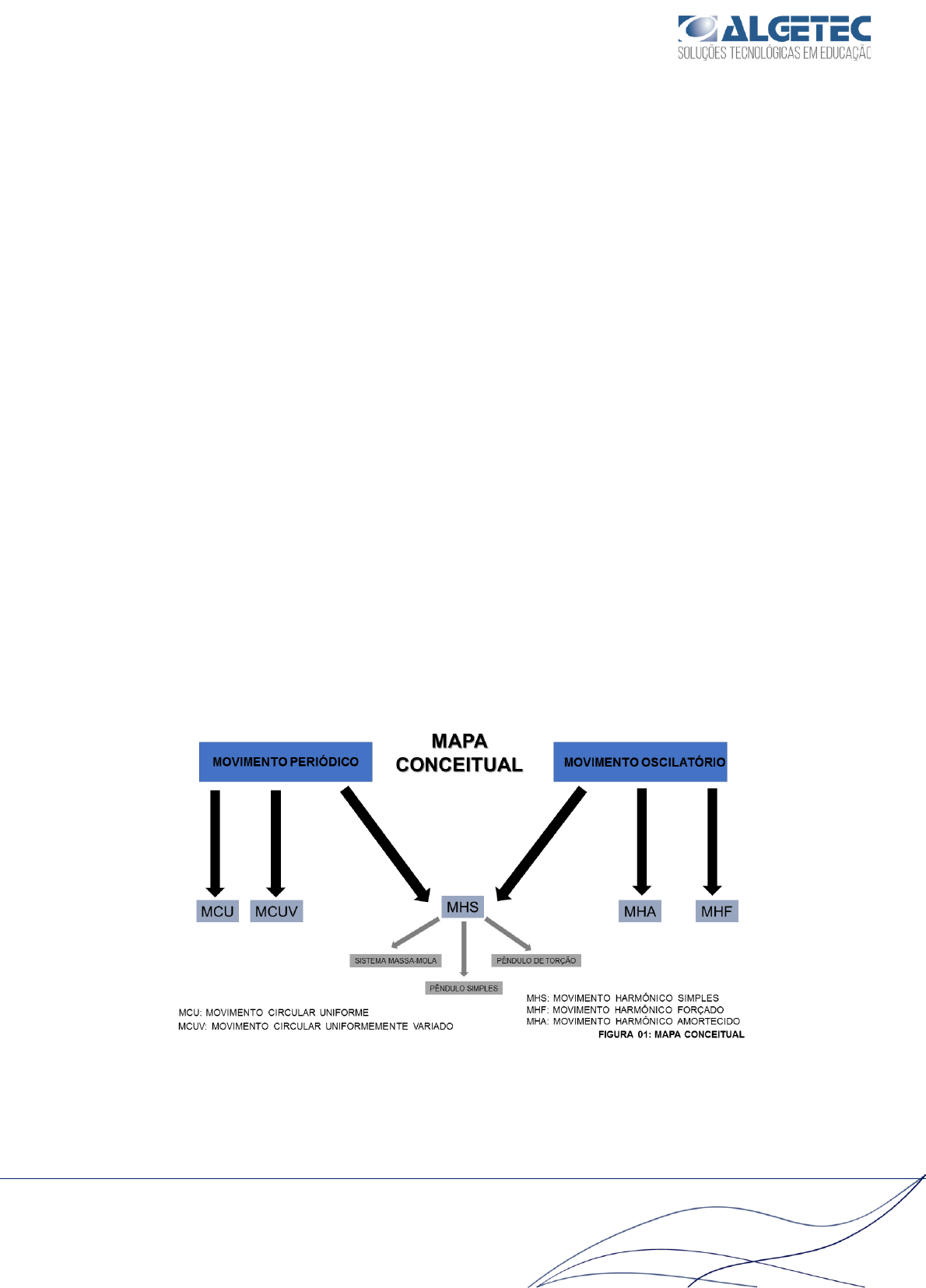 1 ALGETEC – SOLUÇÕES TECNOLÓGICAS EM EDUCAÇÃO CEP: 40260-215 Fone: 71 3272-3504 E-mail: contato@algetec.com.br | Site: www.algetec.com.br LABORATÓRIO DE FÍSICA OSCILAÇÕES OSCILAÇÕES As vezes não temos a noção, mas ao acionarmos a ignição de um veículo, desencadeamos uma série de processos. Dentre eles, podemos exemplificar a oscilação dos pistões dentro dos cilindros, executando uma MHS (Movimento Harmônico Simples) quando em regime estacionário que é transmitido pelas bielas ao virabrequim na forma de MCU (Movimento Circular Uniforme). O exemplo que acabamos de descrever é apenas um, dentre muitos que podemos encontrar no nosso cotidiano e na natureza acerca das oscilações mecânicas. Esse estudo é de tremenda importância, pois além da sua grande aplicabilidade, serve de modelo matemático para compreensão de alguns Circuitos Elétricos e do estudo da estrutura da matéria através da Mecânica Quântica. 1. MOVIMENTOS PERIÓDICOS E OSCILATÓRIOS 2 ALGETEC – SOLUÇÕES TECNOLÓGICAS EM EDUCAÇÃO CEP: 40260-215 Fone: 71 3272-3504 E-mail: contato@algetec.com.br | Site: www.algetec.com.br LABORATÓRIO DE FÍSICA OSCILAÇÕES Embora haja uma similaridade e, em alguns casos, até uma complementaridade, podemos dizer que movimentos periódicos e oscilatórios são conceitualmente diferentes. Um movimento é dito PERIÓDICO quando ele se repete para um intervalo de tempo específico denominado período. Já o movimento OSCILATÓRIO acontece quando observamos de maneira sistemática e regular, uma inversão no sentido desse movimento. 2. MOVIMENTO HARMÔNICO SIMPLES Como vimos no mapa conceitual da figura anterior, um movimento é considerado harmônico simples quando ele é, simultaneamente, oscilatório e periódico. Para chegarmos a tais condições, podemos estabelecer que nesse tipo de movimento a energia mecânica deve se conservar. Na prática, um movimento com essas características não existe, pois por menores que sejam, as forças que promovem dissipação de energia, existem. Ainda assim, podemos enquadrar algumas aplicações práticas como um MHS genuíno. São os casos dos pêndulos simples e dos sistemas massa-mola. 3 ALGETEC – SOLUÇÕES TECNOLÓGICAS EM EDUCAÇÃO CEP: 40260-215 Fone: 71 3272-3504 E-mail: contato@algetec.com.br | Site: www.algetec.com.br LABORATÓRIO DE FÍSICA OSCILAÇÕES 2.1. SISTEMA MASSA-MOLA Abaixo, temos uma figura que exemplifica o diagrama de forças e as equações dinâmicas de um sistema massa-mola posto a oscilar entre as posições 𝑋𝑚𝑖𝑛 = −𝑋0 e 𝑋𝑚á𝑥 = +𝑋0 em torno do ponto 𝑋 = 0 (posição de equilíbrio do sistema). No estágio de mola comprimida, aceleração e força são máximas em sua intensidade (módulo), mas diz-se mínimas por considerar que estão no sentido oposto ao que se arbitrou como positivo. Como resultado da aplicação da 2ª Lei de Newton ao sistema, encontramos uma equação diferencial, cuja solução nos permite determinar a função da posição da mola no decorrer do tempo: 𝑋(𝑡) = 𝑋0cos(𝜔𝑡 + 𝜃0), Onde,𝑋0 é a deformação inicial sofrida pela mola (amplitude máxima do MHS), ω é a frequência angular e 𝜃0 é a fase inicial. Derivando a equação da posição em função do tempo, podemos encontrar a função horária da velocidade, dada por: 𝑣(𝑡) = −𝜔𝑋0sen(𝜔𝑡 + 𝜃0) 4 ALGETEC – SOLUÇÕES TECNOLÓGICAS EM EDUCAÇÃO CEP: 40260-215 Fone: 71 3272-3504 E-mail: contato@algetec.com.br | Site: www.algetec.com.br LABORATÓRIO DE FÍSICA OSCILAÇÕES Derivando mais uma vez a equação da posição, encontramos, por fim, a equação da aceleração em função do tempo: 𝑎(𝑡) = −𝜔²𝑋0cos(𝜔𝑡 + 𝜃0) 𝑜𝑢 𝑎(𝑡) = −𝜔²𝑋(𝑡) Teremos ainda que a frequência angular será: 𝜔 = √ 𝑘 𝑚 Onde, k é a constante elástica ou rigidez elástica da mola e m é a massa do corpo pendurado nela. Já para o período, podemos estabelecer que: 𝑇 = 2𝜋 𝜔 Substituindo pela equação da frequência angular: 𝑇 = 2𝜋√ 𝑚 𝑘 3. OSCILAÇÕES AMORTECIDAS Como dissemos anteriormente, em termos práticos, não existem sistemas físicos isentos de forças dissipativas. Quando dizemos que uma oscilação é harmônica simples, o que fazemos é tornar o efeito dessas forças aproximadamente desprezível. No entanto, existem situações em que esse tipo de aproximação não é possível. É o caso das oscilações amortecidas, onde devemos acrescentar ao nosso diagrama de forças e equações dinâmicas, um termo correspondente a essa força dissipativa (proporcional à velocidade). Sendo assim, nossa equação diferencial assumirá a seguinte forma: 5 ALGETEC – SOLUÇÕES TECNOLÓGICAS EM EDUCAÇÃO CEP: 40260-215 Fone: 71 3272-3504 E-mail: contato@algetec.com.br | Site: www.algetec.com.br LABORATÓRIO DE FÍSICA OSCILAÇÕES 𝑚 𝑑²𝑋 𝑑𝑡² + 𝑏 𝑑𝑋 𝑑𝑡 + 𝑘𝑋 = 0, Ainda podemos arrumar a equação de modo que ela assuma a seguinte forma: 𝑑²𝑋 𝑑𝑡² + 𝛾 𝑑𝑋 𝑑𝑡 +𝜔0 2𝑋 = 0, Onde, 𝛾 = 𝑏 𝑚 é o fator de amortecimento e 𝜔0 = √ 𝑘 𝑚 é a frequência angular inicial. Por se tratar de uma Equação Diferencial Ordinária de Grau 2, a solução proposta para ela é do tipo exponencial e nesse caso específico, estará vinculada à três condições que estabelecerão três regimes possíveis para esse amortecimento: subamortecido, superamortecido e criticamente amortecido. Em termos práticos, as oscilações amortecidas podem ser aplicadas e observadas nos regimes de oscilação de amortecedores de portas ou veículos. Uma observação puramente analítica das curvas da posição em função do tempo nos permite distinguir os três regimes de oscilação, como é possível verificarmos na imagem a seguir: 6 ALGETEC – SOLUÇÕES TECNOLÓGICAS EM EDUCAÇÃO CEP: 40260-215 Fone: 71 3272-3504 E-mail: contato