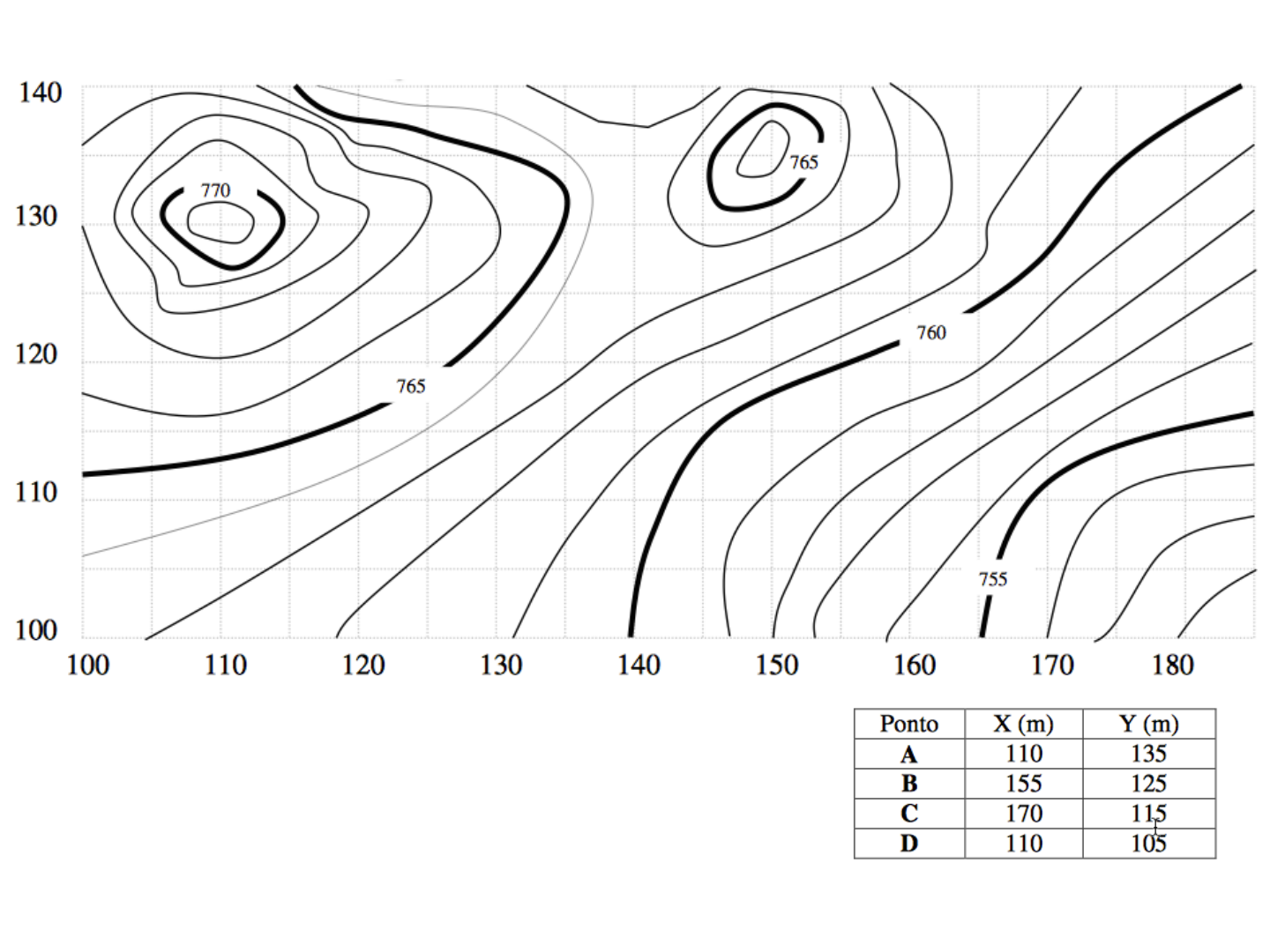 INTERPOLAÇÃO DE PONTOS 1 – Equidistância entre as curvas de nível 2 - A cota dos pontos C e D 3 - A distância horizontal entre os pontos AB 4 - A declividade entre A e B 5 - A distância inclinada entre A e B