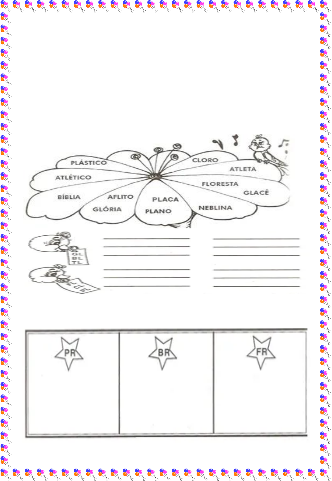 ESCOLA________________________________________________________ ALUNO(A)_______________________________________________________ DATA_______/_______/_________SÉRIE_____________PROFª__________ ATIVIDADES DA LINGUA PORTUGUÊSA 1-Leia as palavras abaixo e escreva-as conforme aos encontros consonantais e coloque nos espaços abaixo: 2-Pesquise, recorte e cole quatro palavras com cada dificuldade abaixo: 3- Descubra o segredo e continue: 4-Circule o encontro de consoantes, como no exemplo. 5-Circule apenas os animais cujos nomes contenham encontro consonantal