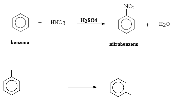 Prof. Dr. Odair dos Santos Monteiro Universidade Federal do Maranhão Centro de Ciências Exatas e Tecnologia Departamento de Química Química orgânica II Síntese do m-dinitrobenzeno 1. INTRODUÇÃO A nitração é uma das reações mais características do núcleo aromático, é provavelmente, a reação mais influenciada pelos efeitos ativadores e retardadores das substituições eletrofílicas. Para núcleos bem ativados usa-se nitrantes fracos, usados em grande diluição e com resfriamento. Para os núcleos inativos, usam-se condições enérgicas quanto à concentração e temperatura. A mistura sulfonítrica é o agente de nitração mais comumente empregado. As proporções usadas são bastantes variáveis. A função do ácido sulfúrico é manter o meio fortemente ácido para favorecer a formação do íon nitrônio (NO2+) que é o agente eletrofílico que efetua a nitração. Reação: Constantes Físicas: P.F. 90 oC e P.E. 297 oC Solubilidade: Em água ----------------------------- 0,3% a 99 oC; 0,05% a 25 oC Em álcool etílico ------------------- 3,3% a 20 oC; 5,9% a 25 oC Em éter etílico ---------------------- 6,7% a 15 oC Em clorofórmio --------------------- 32,4% a 18 oC Em benzeno ------------------------- 39,4% a 18 oC 2 – OBJETIVOS 2.1 – Geral Sintetizar o nitrobenzeno e o m-dinitrobenzeno a partir da reação de nitração do benzeno. 2.2 – Específicos · Estudar os principais conceitos sobre reação de nitração · Verificar o efeito de orientação do grupo nitro referente no anel aromático · Estudar o mecanismo de síntese do nitrobenzeno e do m-dinitrobenzeno · Caracterizar o produto obtido a partir de testes qualitativos · Determinar o rendimento das reações de nitração 3 – PARTE EXPERIMENTAL: 3.1 – Materiais e reagentes Materiais Reagentes Balão de fundo redondo de 250 ml Ácido sulfúrico concentrado Provetas de 25 e 50 ml Ácido nítrico concentrado Béquer de 500 ml Benzeno Sistema de banho de gelo Nitrobenzeno Sistema de refluxo Etanol Sistema para filtração à vácuo Hidróxido de sódio 1 % Balança analítica Cloreto de cálcio anidro 3.2 - Procedimento Experimental Parte 1 – Síntese do nitrobenzeno Na capela, em um balão seco de 250 ml, colocar 46 g (25 mL) de H2SO4 concentrado (d: 1,84 e p: 98%) e 30,8 g (22 mL) de HNO3 (d: 1,40 e p: 95%). Evitar o aquecimento resfriando o sistema com água fria. Após essa operação ainda na capela adicionar lentamente, porém com agitação constante 15,6 g (17,4 mL) de benzeno não deixando a temperatura ultrapassar 60 ºC. Adaptar ao balão um condensador de refluxo, seco para dificultar a saída dos vapores nitrosos que irão se formando durante o prosseguimento da reação. Ainda na capela, aquecer a mistura reacional em banho Maria a 60 ºC por uma hora agitando ocasionalmente. Após o aquecimento, deixar a mistura resfriar e adicionar 300 ml de água para remoção posterior dos ácidos residuais através do funil de decantação. Lavar novamente a fase orgânica com igual volume de solução 1% de NaOH e posteriormente com água separando finalmente o nitrobenzeno impuro. Adicionar cloreto de cálcio anidro para a remoção de algumas impurezas e posteriormente destilar e recolher o líquido que destila a 211 ºC. Rendimento: Teórico ------------------------------------- 24,6 g Observado --------------------------------------- g Parte 2 – Síntese do m-dinitrobenzeno Na capela, em um balão seco de 250 ml, colocar 30 g (16,2 mL) de H2SO4 concentrado (d: 1,84 e p: 98%) e 18g (12 mL) de HNO3 (d: 1,50 e p: 95%). Após essa operação ainda na capela adicionar lentamente, porém com agitação constante 12g (9,9 mL) de nitrobenzeno. Adaptar ao balão um condensador de refluxo, seco para dificultar a saída dos vapores nitrosos que irão se formando durante o prosseguimento da reação. Ainda na capela, aquecer a mistura reacional em sistema de refluxo até a ebulição por 30 minutos. Agite ocasionalmente. Após o aquecimento, deixar a mistura resfriar e derramar vagarosamente o conteúdo do balão sobre 300 mL de água gelada, agitando continuamente para facilitar uma fina precipitação de m-dinitrobenzeno em água, e desse modo permitir a melhor remoção dos ácidos residuais. Filtrar o precipitado em buchner, e lavá-lo continuamente com água gelada para remover os ácidos residuais. Controlar a operação com papel de tornassol até pH próximo à neutralização. Escorrer bem. Purificação: Dissolver o precipitado em quantidade suficiente de álcool etílico e refluxar até a completa dissolução. Após a dissolução, concentrar o material em chapa de aquecimento e deixar cristalizar a frio. Lavar os cristais em buchner com alguns mililitros de álcool etílico gelado, escorrer bem, secar ao ar ou em estufa a 50 oC. Rendimento: Teórico ------------------------------------- 16,2g Observado --------------------------------------- g N O 2 N O 2 N O 2 + HNO 3 H 2 O Nitrobenzeno m -Dinitrobenzeno + H 2 SO4