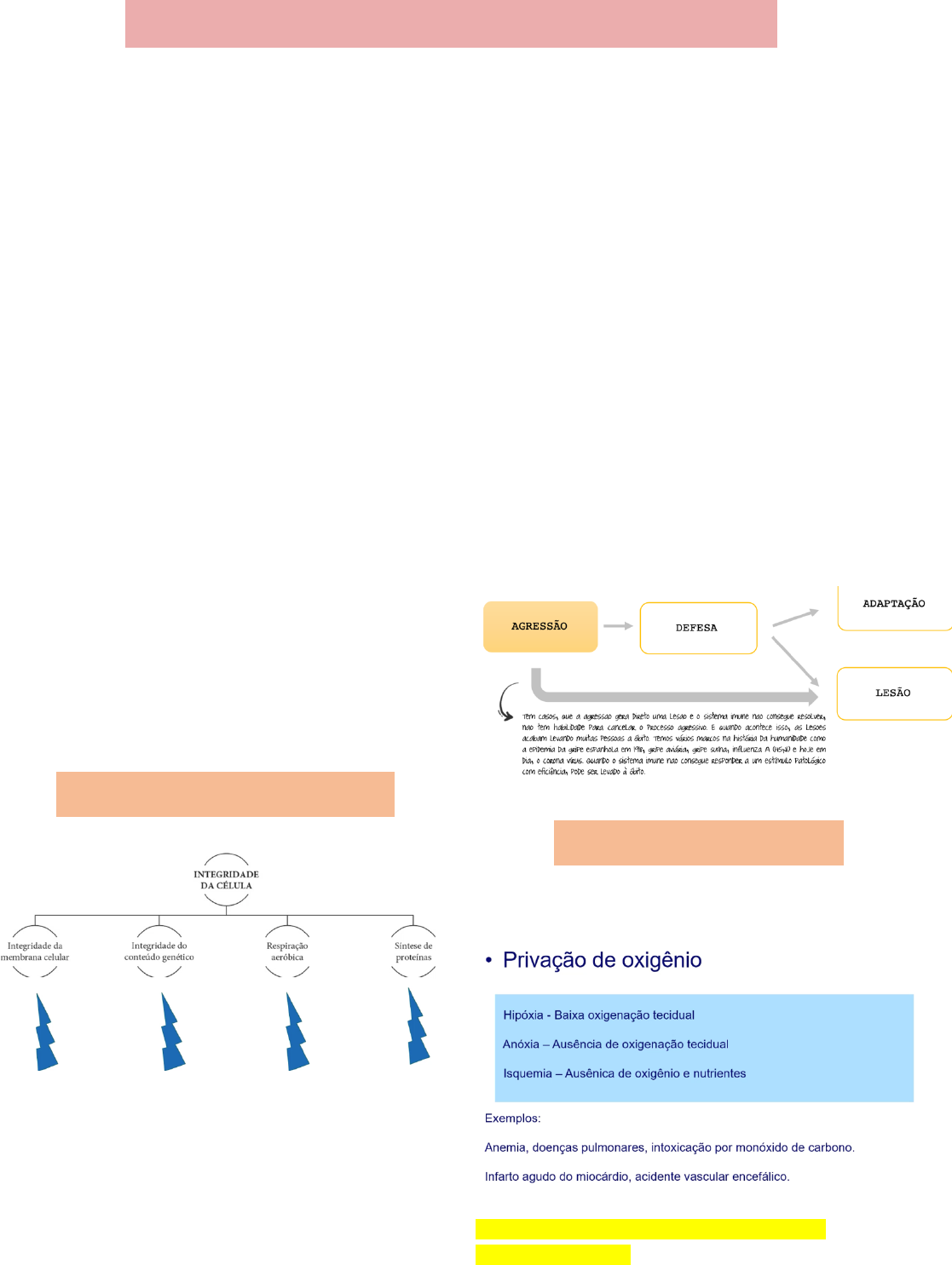 Bruna V. Chagas Aula 1 OBJETIVOS: Þ “Descrever os desfechos associados à exposição da célula a estímulos estressores e agressores” – Saber qual resultado de um estímulo estressor e agressor sobre uma célula. A célula vai sofrer adaptação ou morte celular, as adaptações podem ser por vários motivos e a morte celular pode ser por necrose ou por apoptose. Þ “Citar as causas de lesão celular e descrever seus principais mecanismos”- Saber oque que causa essa lesão celular e como ela acontece, quais são as etapas dessa lesão Þ “Explicar as diferenças morfofuncionais entre lesão reversível e irreversível”- Saber quais são as diferenças na forma da célula e na funcionalidade dela, como ela atua diante de uma lesão que é reversível e irreversível Þ “Destacar os critérios definidores de lesão celular irreversível” – Saber até que ponto a lesão é reversível e até que ponto ela é irreversível. A integridade de uma célula precisa ser preservada para que a célula se mantenha viva e funcionante sem nenhuma alteração. Para que a integridade da célula seja mantida, ela precisa de 4 sistemas básicos : 1- A integridade da célula é dependente da integridade celular 2- Integridade da célula é dependente do conteúdo genético do DNA e RNA 3- Integridade da célula é dependente da respiração aeróbica 4- Integridade da célula é dependente da síntese de proteínas Então se uma célula sofre alguma lesão/ agressão/ estímulo nocivo em qualquer um desses sistemas ela vai deixar de ter sua integridade preservada. A) PRIVAÇÃO DE OXIGÊNIO Sobre privação de oxigênio é muito importante saber diferençar esses 3 tipos: PATOLOGIA GERAL- MECANISMOS DE LESÃO DA CÉLULA II. CAUSAS DE LESÃO CELULAR I. INTEGRIDADE DA CÉLULA • HIPÓXIA- “hipo”- pouco/” óxia”- oxigênio. - A hipóxia é classificada como baixa oxigenação tecidual, é uma redução na entrega de oxigênio para os tecidos ( a chegada de oxigênio não é eliminada totalmente, a concentração ou a chegada são reduzidos) • ANÓXIA- “a”- prefixo de negação -Ausência de oxigenação tecidual, um tecido que sofre anóxia não recebe oxigênio de maneira nenhuma • ISQUEMIA- -Ausência de oxigênio e nutrientes. Ao contrário da anóxia, na isquemia a ausência de oxigênio geralmente é por uma obstrução, na isquemia o sangue não chega no tecido, já na anóxia o sangue chega ao tecido mas se encontra não oxigenado. Na isquemia o sangue nem chega. Todo sangue esta com oxigênio, mas existe uma barreira em algum lugar que esta impedindo que o sangue ultrapasse para o tecido à frente daquela barreira, então como o sangue não chega, o oxigênio também não (uma vez que o oxigênio é carreado pelo sangue) Situações que apresentam isquemia-> Infarto agudo do miocárdio. Oque chamamos de infarto agudo do miocárdio é na verdade a isquemia, assim como angina estável e instável. Nesses 3 casos o sangue não está chegando nas coronárias. Imagina o coração (com as coronárias que o irrigam) e no meio de uma das coronárias há uma obstrução que esta impedindo que o sangue chegue até o final dessa coronária, a parte final da coronária que esta sem sangue é uma parte que esta sofrendo isquemia e se a gente pensar que esse sangue que deveria chegar ate o final da coronária irriga uma parte inteira do coração a isquemia não vai ficar localizada somente nessa parte final da coronária, vai ficar localizada também nessa parte inteira do coração que não esta recebendo sangue. Exemplos de privação de oxigênio: Anemia, doenças pulmonares, intoxicação por monóxido de carbono. Infarto agudo do miocárdio, acidente vascular encefálico. B) AGENTES FÍSICOS C) AGENTES QUÍMICOS O paracetamol causa problemas nos hepacitos se for ingerido em grandes quantidades, causa uma lesão hepatócita porque libera subprodutos que são toxicas para o hepatócito. Até quantidade X os hepatócitos conseguem controlar, mas quando é em grandes quantidades, ocorre uma lesão hepatócita D) AGENTE INFECCIOSOS Qual a relação de intoxicação por monóxido de carbono com a privação de oxigênio? No momento em que o monóxido de carbono se liga a hemoglobina é o momento em que a hemoglobina se torna disfuncional. A hemoglobina irá se ligar ao oxigênio, ou a bióxido de carbono ou ao monóxido de carbono. De forma fisiológica ela deve se ligar ao oxigênio ou ao bióxido de carbono. Quando a hemoglobina se liga ao oxigênio, ela se liga ao oxigênio até o momento que ela troca o oxigênio por Co2. E a mesma coisa acontece quando ela troca Co2 por O2. Porém no momento que ela se liga ao monóxido de carbono, não existe mais possibilidade de troca, essa ligação é irreversível. Vai causar uma hipóxia E) REAÇÕES IMUNOLÓGICAS F) ALTERAÇÕES GENÉTICAS G) DESEQUILÍBRIOS NUTRICIONAIS Um indivíduo obeso é um individuo que esta inflamado cronicamente e toda inflamação vai haver liberação de substâncias que vão causar lesão celular de alguma maneira 1- AGENTE AGRESSOR: -Tipo -Duração -Intensidade 2- CÉLULA LESADA -Tipo celular (ex: a pele e o olho no sol) -Idade (ex: células embrionárias são lesadas muito mais facilmente do que de um adulto) -Adaptabilidade (ex: uma célula muscular consegue se adaptar muito mais facilmente sofrendo hipertrofia do que outro tecido que não tem essa capacidade) A célula normal é confinada a uma faixa razoavelmente estreita de função e estrutura por seu estado de metabolismo, diferenciação e especialização; por limitações das células vizinhas; e pela disponibilidade de substratos metabólicos. No entanto, ela é capaz de dar conta das demandas fisiológicas, mantendo um estado normal chamado de homeostasia. ADAPTAÇÕESà As adaptações são respostas estruturais e funcionais reversíveis, a estresses fisiológicos mais excessivos e a alguns estímulos patológicos, durante as quais um no