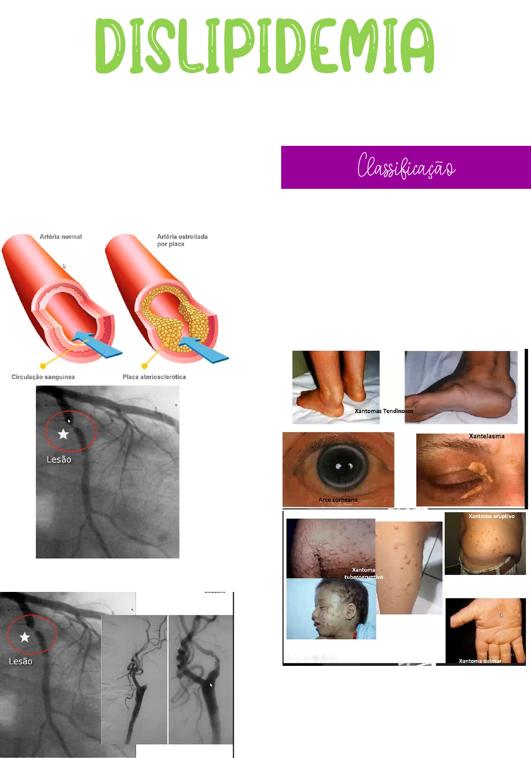 LARISSA MENEZES – ENDOCRINOLOGIA Qualquer alteração do metabolismo dos lipides (HDL, LDL, triglicerídeos) HDL: fração boa LDL: fração aterogênico, é a pior pela formação de placas. A formação de placas é um processo a longo prazo, desde que nasce. Uma doença isquêmica não é repentina, é a longo prazo Carótida antes e depois do procedimento de desobstrução: A placa móvel é mais grave porque pode se mover e ir para um vaso mais estreito o Primaria: ▪ Por defeitos genéticos que causem defeito na metabolização dos lipídios ▪ Normalmente se apresenta em mais jovens ▪ São mais agressivas e mais difíceis de tratar ▪ Deposito de lipídios formando xantomas tendinosos (tendão abaulado), calcificaão acinzentada no arco corneano, xantelasma (pálpebra), xantoma tuberoeruptivo, xantoma eruptivo e xantoma palmar ▪ Excesso de triglicerídeos: sobrenadante cremoso (comum em dislipidemia primária); não consegue fazer analise de LDL e não calcula LARISSA MENEZES – ENDOCRINOLOGIA o Secundaria: doenças, drogas ou hábitos de vida ↑TGL e ↓HDL ↑TGL e ↓LDL ↑LDL e ↓HDL ↑CT e ↓HDL ↑TGL, ↑CT e ↑HDL ↑TGL ↑TGL, ↑LDL e ↓HDL ↑TGL e ↓HDL Ç ↑ Hipotireoidismo Hepatopatia crônica Colestase Sindrome nefrótica Anorexia ↑ Obesidade Excesso de carboidratos DM Etilismo Uremia Estrogênio Sedentarismo Acromegalia Cushing HIV Gestação Hipotireoidismo ↓ Tabagismo Hepatite C Anabolizantes DM HIV Obesidade Sedentarismo NOTA: Ao pedir lipidograma vem tudo e não deve pedir só colesterol e sim colesterol total e frações! o Anamnese ▪ Idade e sexo ▪ Dieta: o que come em casa no dia a dia ▪ Exercícios: quantos dias, tempo por dia e o que ▪ Tabagismo, etilismo, drogas, medicamentos em uso ▪ Causas secundarias: tratar a doença de base ou retirar medicamentos causadores ▪ Patologias ▪ Histórico familiar (AVC, IAM em quem e idade quando teve) o Clínica: ▪ IMC ▪ Estigmas ▪ Circunferência abdominal o Laboratório: ▪ Exame de plasma ▪ Dosagem plasmática (CT, TG, HDL) ▪ Formula Friedewald (LDL: CT – HDL – TGL/5) → LDL = COLESTEROL TOTAL – HDL – TRIGLICERIDEOS / 5 (perde a fidedignidade quando tgl está maior que 400) ▪ Não-HDL colesterol: CT – HDL ▪ Glicemia de jejum ▪ Hemoglobina glicada ▪ FRn (função renal) ▪ FT (função tireoidiana) ▪ FHep (função hepática): analisa e vê o que tem necessidade de pedir o Pedir lipidograma se: LARISSA MENEZES – ENDOCRINOLOGIA ▪ Doença arterial coronariana ou doença vascular aterosclerótica ▪ Alto risco: HAS, DM, obesidade ▪ História familiar positiva ▪ Estigmas de dislipidemia ▪ Pancreatite ▪ Medicamentos: TRH ou Roacutan ▪ Se não se enquadrar nos critérios acima, solicitar a partir dos 20 anos e a cada 5 anos o História familiar de evento cardiovascular prematuro (Mulher < 55 anos e Homem < 65 anos) o Hipercolesterolemia primária (LDL: 160-189 mg/dL e não-HDL: 190-219 o Sindrome metabólica o DRC (TFGe<60, não tratada com diálise ou transplante renal) o Condições inflamatórias crônicas (AR, HIV) o História de menopausa prematura (<40 anos) e de condições associadas a gravidez que aumentam posteriormente o risco cardiovascular (pré-eclampsia) o Raça/etnia de alto risco: ascendência do sul da Ásia o Hipertrigliceridemia primária (TGL > 175 em 3 medidas) o Aumento de PCRu: ≥2mg/dL o Aumento de Lp(a): ≥50mg/dL o Escores de risco: ▪ Escore de risco global ▪ Multi-Ethnic Study of Atherosclerosis (MESA) ▪ Reynolds Risk Score ▪ United Kingdom Prospective Diabetes Study (UKPDS) Risk Engine ▪ Framingham ▪ Calculadora de risco cardiovascular brasileira: pacientes com IAM, derrame, obstrução carótida, algum evento parecido já sabe que é alto risco, não precisa colocar na calculadora LARISSA MENEZES – ENDOCRINOLOGIA o Alvos: ▪ Não-HDL: 30 mg/dl acima da meta do LDL ▪ Mínimo de tempo para reavaliar o perfil lipídio após tto medicamentoso: 6 semanas MEV • Tabagismo • Álcool • Exercício físico: • Aeróbia 30 min 4-6x/sem (200 kcal/d) • Fortalecimento muscular • Diminuir TGL e aumentar HDL (quanto mais alto melhor, é um efeito protetor) • Dieta: orientação básica, mas encaminhar ao nutricionista • Dieta do mediterrâneo (oleaginosas, frutas, verduras, um pouco de vinho, azeites bons) é a com mais benefícios para dislipidemia: ação antioxidante com diminuição do LDL • Fitosteróis 2g/dia + Estatina → diminui LDL em 10% • Baixo risco: insistir em MEV por 6 meses • Risco moderado: insistir em MEV por 3 meses • Alto risco: MEV + medicamento FÁRMACOS • ESTATINAS (INIBIDORES DA HMG-COA REDUTASE): ➢ São os hipoglicemiantes de escolha na atualidade, sendo prescritas, geralmente em monoterapia. Além de baixar os níveis de LDL-c, as estatinas possuem efeito antiaterosclerótico independente do efeito hipolipemiante, pois são drogas “estabilizadoras do endotélio” (devido aos chamados efeitos pleiotrópicos, que incluem uma provável ação anti- inflamatória nas placas de ateroma) ➢ Tratar hipercolesterolemia ➢ Diminuir LDL ➢ Diminui LDL em 21-55% e TGL em 6-30% ➢ Aumenta HDL em 2-10% ➢ Ação maior noturna, deve usar a noite quando de meia vida curta (Sinvastatina) ➢ Meia vida longa pode tomar qualquer horário do dia (Rosuvastatina e Atorva) ➢ Ação: melhora função endotelial, estabiliza placa mole e instável evitando que se rompa, diminui inflamação e oxidação Lp, antitrombótico ➢ Efeitos colaterais: miopatia, hepatotoxicidade, aumento discreto da glicemia. Por isso é importante tratar quem precisa ser tratado e insistir no MEV quando possível, pela avaliação do risco/beneficio ➢ Não deixa de usar estatina porque o paciente é diabético, potencializa os medicamentos para diabetes e inicia a estatina ➢ Contraindicação: gravidez, lactantes e hepatopatias agudas ➢ Benefícios na prevenção primaria (primeiro AVC,