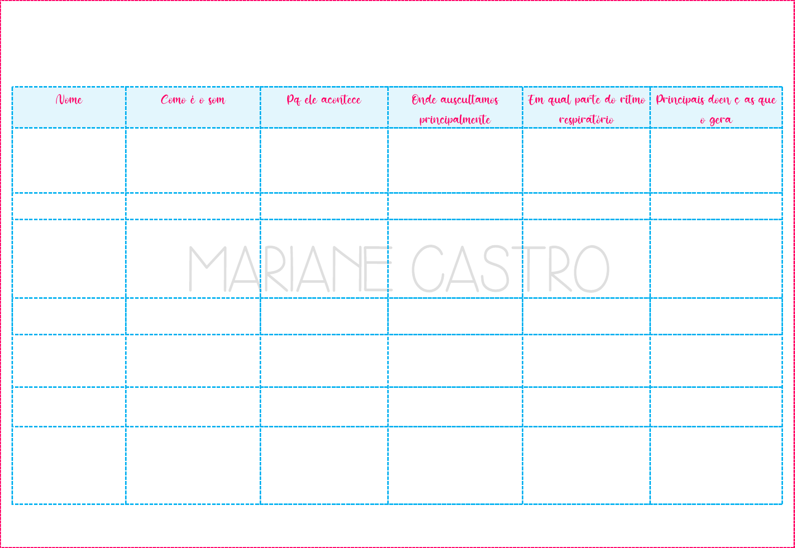 Ruídos Adventícios Pulmonares Estertor Fino (Creptação) Som como a fricção de cabelo ou abertura de velcro. Não muda com a tosse. Perda do equilíbrio hidroaério, gerando alvéolo “inundado” Principalmente nas bases pulmonares (por conter liquido e ter ação da gravidade, além de maior aporte sanguíneo no local) Inspiração Insuficiência Cardíaca (devido aumento da pressão hidrostática no capilar pulmonar), doenças intersticiais pulmonares, etc. Atrito Pleural Som como fricção de couro Processo inflamatório pleural É mais fácil ouvir nas margens laterais do pulmão Principalmente no início da inspiração e expiração Pleurite, etc. S i b i l o Como assobio (pode ser agudo ou grave) Estreitamento do lúmen da via aérea Todo o tórax Principalmente expiração, mas quanto maior a obstrução gerada maior comprometimento da inspiração tbm. Asma, bronquite, etc Estridor Som ladrante Obstrução de vias aéreas superiores Sem estetoscópio dá para ouvir. Inspiração e expiração, principalmente na inspiração. Laringite, etc. Ronco Som do roncar mesmo Acontece quando há espasmo, edema ou secreção na árvore brônquica. Todo o tórax, principalmente em áreas mais centrais Inspiração e Expiração Resfriados, Sinusites, pode ter na pneumonia, asma brônquica, etc. Estertor Grosso (Bolhoso) Som bolhoso (como bolhas feitas na agua com o canudinho). Muda com a tosse Por abertura súbita de Via Aérea Inferior com inflamação (secreção viscosa) Toda região do toráx, principalmente onde há doença instalada. Início da inspiração e durante toda a expiração Bronquites, bronquiectasias, etc. Gemido Som de lamentação Para ter PEEP satisfatóri para não colabar alvéolos, ocorre o fechamento da glote e quando o ar consegue romper essa barreira ouvimos o som Sem estetoscópio dá para ouvir. Expiração Doença da membrana hialina, etc.