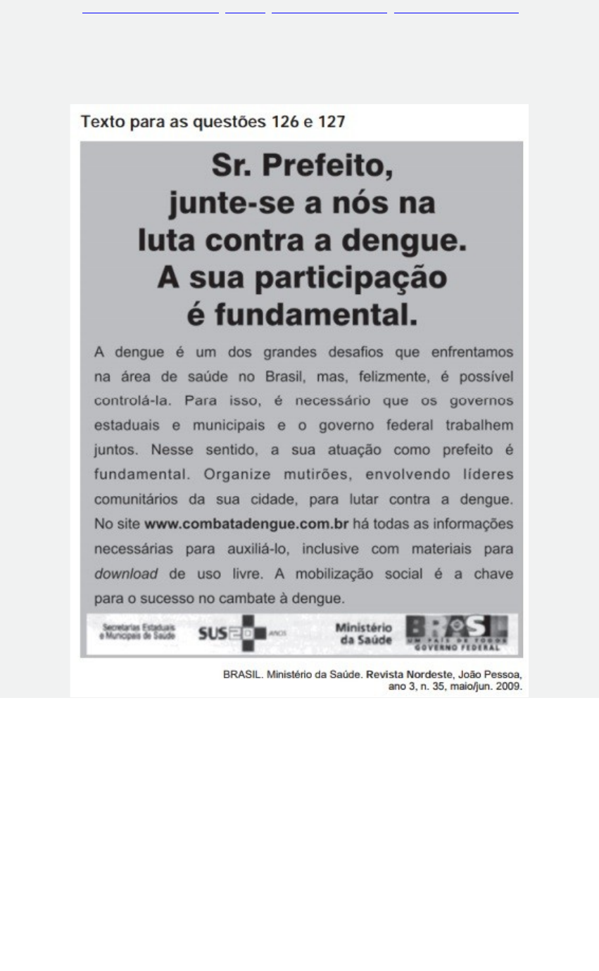 GABARITO ENEM / 2009 / SEGUNDO DIA / CADERNO AZUL QUESTÃO 126 COMPARTILHE O texto exemplifica um gênero textual híbrido entre carta e publicidade oficial. Em seu conteúdo, é possível perceber aspectos relacionados a gêneros digitais. Considerando-se a função social das informações geradas nos sistemas de comunicação e informação presentes no texto, infere-se que 1. a utilização do termo download indica restrição de leitura de informações a respeito de formas de combate à dengue. 2. a diversidade dos sistemas de comunicação empregados e mencionados reduz a possibilidade de acesso às informações a respeito do combate à dengue. 3. a utilização do material disponibilizado para download no site www.combatadengue.com.br restringe-se ao receptor da publicidade. 4. a necessidade de atingir públicos distintos se revela por meio da estratégia de disponibilização de informações empregada pelo emissor. 5. a utilização desse gênero textual compreende, no próprio texto, o detalhamento de informações a respeito de formas de combate à dengue. Comentário da questão Gabarito da questão Opção D