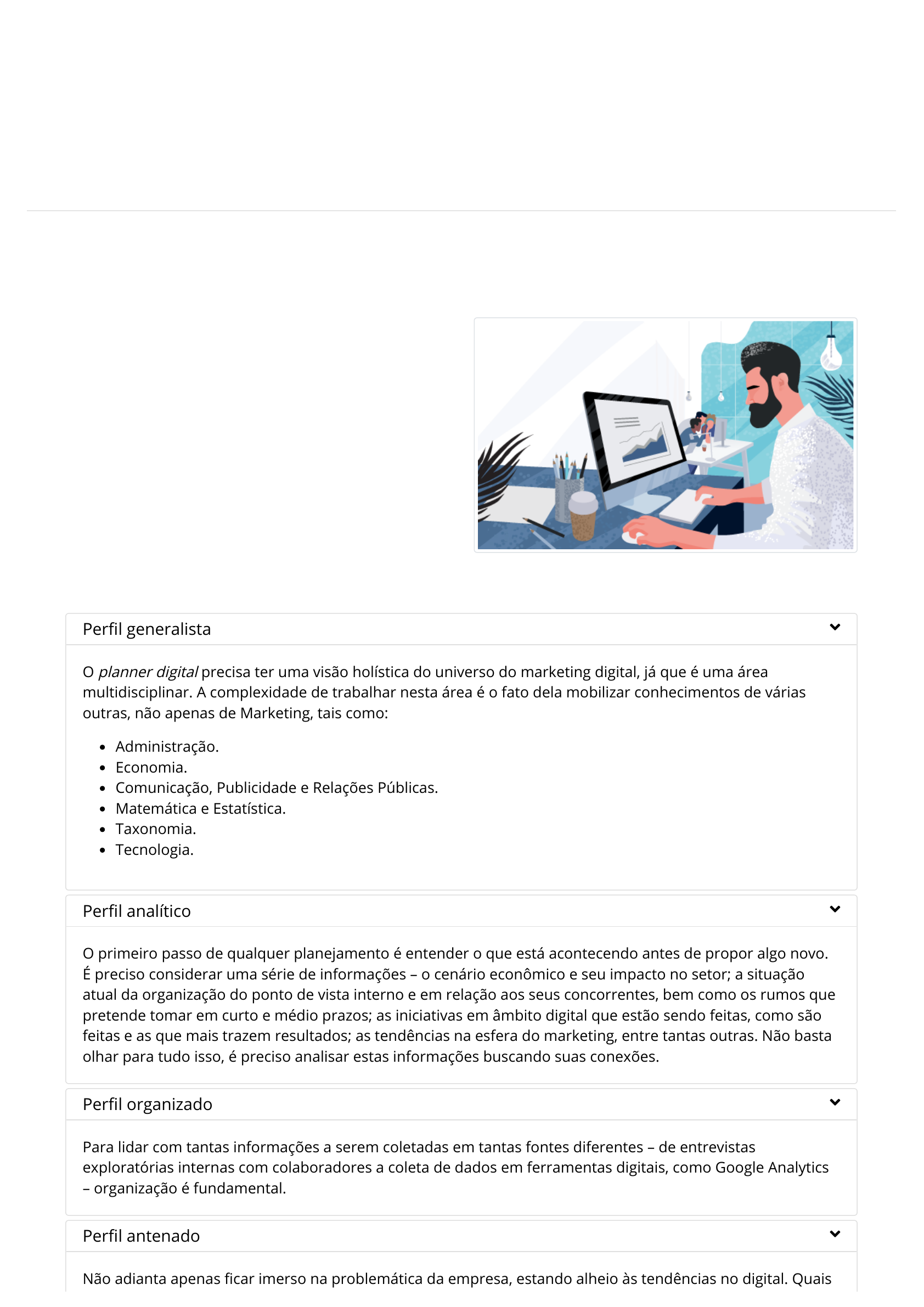 Nesta webaula, estudaremos quais são as competências necessárias que um planner digital precisa ter. Planner e suas competências O pro�ssional responsável pelo planejamento estratégico digital – conhecido também como planner (planejador, em inglês) – tem a missão de buscar soluções em âmbito digital para resolver os problemas das organizações. Para ser assertivo, quais competências um pro�ssional deve desenvolver para se tornar um planner digital capaz de trabalhar em diferentes tipos de organizações? Nós vamos elencar as que são privilegiadas pelos recrutadores. Fonte: Shutterstock Per�l generalista O planner digital precisa ter uma visão holística do universo do marketing digital, já que é uma área multidisciplinar. A complexidade de trabalhar nesta área é o fato dela mobilizar conhecimentos de várias outras, não apenas de Marketing, tais como: Administração. Economia. Comunicação, Publicidade e Relações Públicas. Matemática e Estatística. Taxonomia. Tecnologia. Per�l analítico O primeiro passo de qualquer planejamento é entender o que está acontecendo antes de propor algo novo. É preciso considerar uma série de informações – o cenário econômico e seu impacto no setor; a situação atual da organização do ponto de vista interno e em relação aos seus concorrentes, bem como os rumos que pretende tomar em curto e médio prazos; as iniciativas em âmbito digital que estão sendo feitas, como são feitas e as que mais trazem resultados; as tendências na esfera do marketing, entre tantas outras. Não basta olhar para tudo isso, é preciso analisar estas informações buscando suas conexões. Per�l organizado Para lidar com tantas informações a serem coletadas em tantas fontes diferentes – de entrevistas exploratórias internas com colaboradores a coleta de dados em ferramentas digitais, como Google Analytics – organização é fundamental. Per�l antenado Não adianta apenas �car imerso na problemática da empresa, estando alheio às tendências no digital. Quais Planejamento Estratégico Digital O planejamento nas empresas Você sabia que seu material didático é interativo e multimídia? Isso signi�ca que você pode interagir com o conteúdo de diversas formas, a qualquer hora e lugar. Na versão impressa, porém, alguns conteúdos interativos �cam desabilitados. Por essa razão, �que atento: sempre que possível, opte pela versão digital. Bons estudos! mudanças de paradigmas levam à criação de negócios disruptivos como a Uber e o AirBnb? Quais as ações mais inovadoras de engajamento do público? Per�l criativo A criatividade permite a você chegar em soluções inovadoras, que não necessariamente sejam complexas, evitando fazer “mais do mesmo”. A presença em eventos culturais também contribui bastante para processos criativos. O que acontece em uma área pode servir de inspiração para a criação de soluções diferenciadas em outra. Per�l colaborativo Orquestrar diferentes informações consiste em envolver diferentes pessoas de dentro e até mesmo de fora da organização. O trabalho do planner está cada vez mais distante daquele modelo tradicional de consultor que reúne documentos, recolhe-se em casa para estudá-los e retorna com uma solução em PowerPoint, muitas vezes, longe das expectativas do cliente ou difícil de ser implementada. Os pro�ssionais da organização precisam ser envolvidos no processo de planejamento pois eles têm um conhecimento crítico que o planner nem sempre têm – seja colaborador ou prestador de serviço, o planner não vivencia a realidade de outras áreas da empresa. Para concluirmos nossos estudos, das competências apresentadas para ser um planner digital, quais você acredita que tem? Procure lembrar de uma situação em que você teve de mostrar esta competência para resolver um problema. Quais você não tem e precisaria desenvolver?