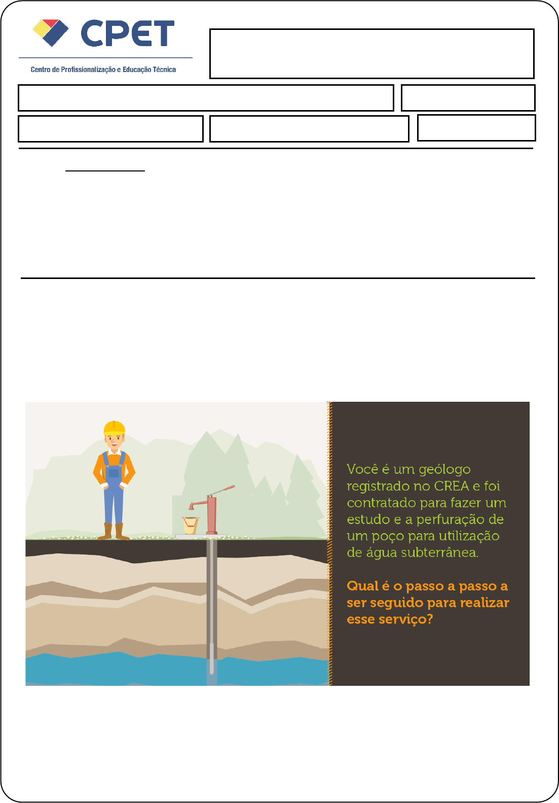 Avaliação Pesquisa/Prática Fundamentados em estudos geológicos, poços artesianos são obras de engenharia para a captação de águas subterrâneas por meio da perfuração de grandes rochas. Você sabia que os tipos de poços variam conforme a tecnologia empregada? Eles são diferentes de acordo com os métodos de segurança e de proteção ao meio ambiente e o sistema de operação empregados. No poço mais convencional, a água permanece dentro do poço e tem de ser bombeada para a superfície. Já no poço chamado de surgente, a água jorra naturalmente, por diferença de pressão em relação à superfície. Princípios de Climatologia e Hidrologia Aluno (a): Isadora Benevides de Castro Data: 06/04/ 2021. Avaliação Pesquisa/Prática NOTA: INSTRUÇÕES: ❖ Esta Avaliação contém 1 (uma) questão, totalizando 10 (dez) pontos. ❖ Você deve preencher dos dados no Cabeçalho para sua identificação o Nome / Data de entrega ❖ As respostas devem ser digitadas abaixo de cada pergunta. ❖ Ao terminar, grave o arquivo com o nome Avaliação Pesquisa/Prática. ❖ Envio o arquivo pelo sistema. http://lrq.sagah.com.br/uasdinamicas/uploads/layouts/1994459178_1569116235307a8f300c1b4d3d16b36cf78f49ace60764936c.png Avaliação Pesquisa/Prática Para a realização da perfuração de um poço, sejam eles artesianos ou semiartesianos, como se tratam de obras de engenharia geológica, antes de suas construções requerem as seguintes etapas/ações: 1- Obtenção da licença de perfuração junto ao órgão estadual gestor dos recursos hídricos; Esta etapa deve ser realizada por um geólogo e é constituída pelas informações cadastrais, geologia, análise físico-química e bacteriológica da água, hidrogeologia, quantidades e período de exploração com fluxograma de utilização da água, dados construtivos do poço, relatório de avaliação de eficiência e mapa topográfico. 2- Elaboração do projeto técnico construtivo do poço; Na etapa de elaboração do projeto, deve ser considerada a vazão necessária ou esperada, a geologia do local, a qualidade físico-química da água bem como a distância entre a profundidade prevista de captação e o ponto no qual será o reservatório para a recepção dessa água. Também deve abordar os tipos de rochas previstas a serem perfuradas, o diâmetro da perfuração, bem como devem ser especificados todos os materiais a serem empregados durante a perfuração e aqueles a serem fixados em definitivo no poço, além dos serviços de aferição, tais como: teste de bombeamento, coleta e análises d’água, laje de proteção sanitária, cimentações e desinfecção. 3- Locação do ponto de perfuração; Visando a maximização e assertividade do resultado, o local escolhido para a perfuração e implantação de um poço deve ser antecedido de um estudo realizado por um hidrogeólogo. 4- Construção do poço tubular profundo; e Toda a fase de construção de um poço deve ser executada dentro das normas da ABNT. Para a operacionalização do serviço, a empresa executante precisa estar registrada no CREA, também possuir um responsável técnico legal, sendo ele geólogo ou engenheiro de minas e que tenha o selo da ABAS – Associação Brasileira de Águas Subterrâneas. Estes cuidados orientam para assegurar a efetivação de um serviço dentro das normas, que será fiscalizado pelas entidades competentes e gozará de todas as garantias construtivas. 5- Relatório final do poço O relatório deve ser fornecido pela empresa executante do serviço de perfuração e implantação do poço, e o mesmo deve conter as informações sobre os dados construtivos, o teste de vazão, a geologia, a análise de água e os demais dados para o dimensionamento do equipamento utilizado para o bombeamento d’água.