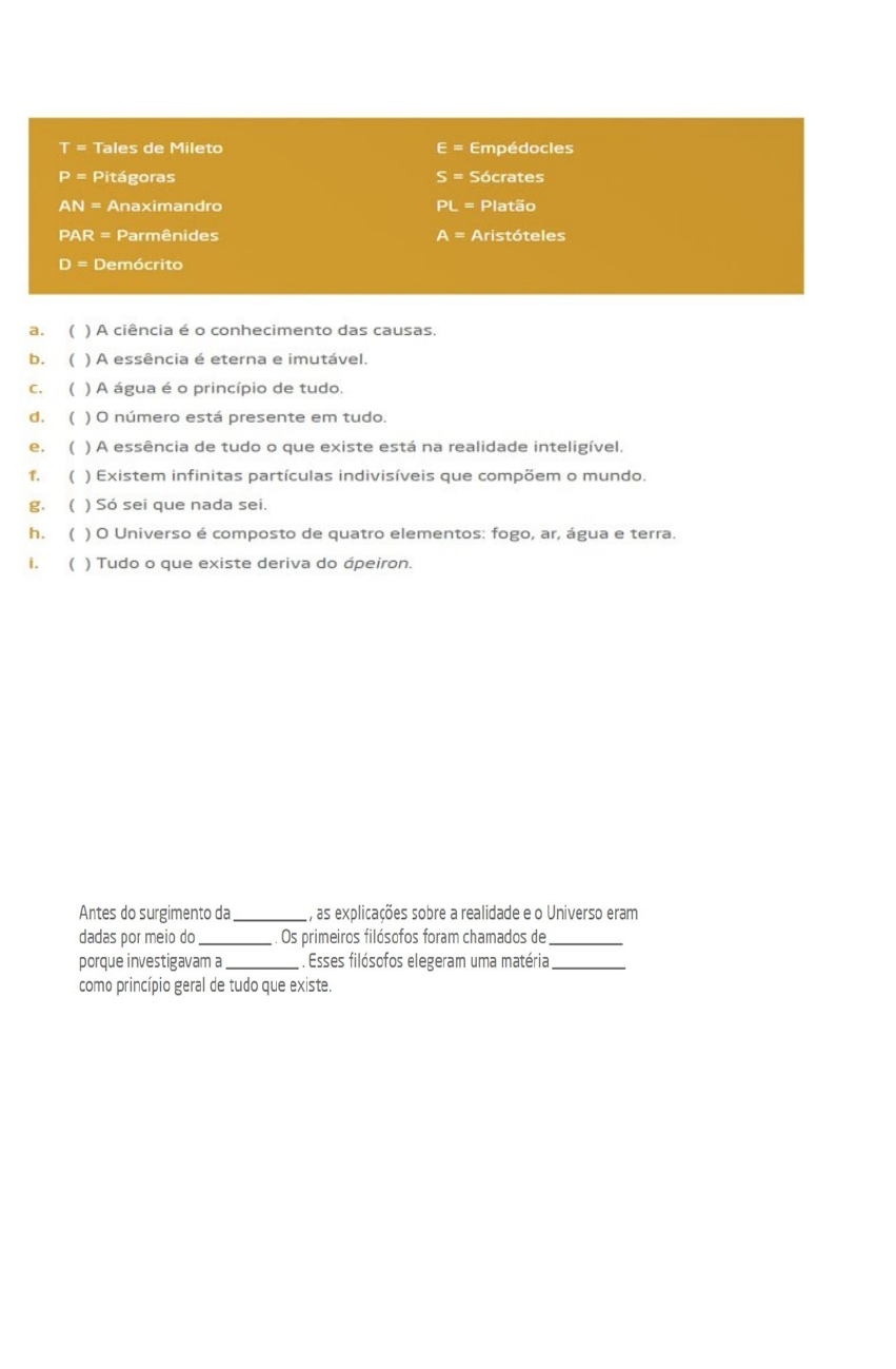 FILOSOFIA Relembrando os conceitos: relacione as alternativas de acordo com o filósofo a elas ligado. A( A),B( PAR), C(T),D( P),E(PL),F(D),G(S),H(E),I(AN) 2 – Complete as lacunas com as palavras physis, naturalistas, filosofia e primordial: * a. filosofia, mito, filósofos da natureza, physis, primordial. b. ciência, mito, pensadores modernos, estuário, primordial. c. astronomia, Platão, História, natureza, casa, jardim. d. pré-socráticos, os modernos, physis, pedra, fogo. 3 – Leia a citação a seguir e marque a opção correta referente ao verdadeiro conhecimento que se encontra na realidade inteligível em Platão. a) Para Platão o mundo inteligível não representa a verdade das coisas. b) Para Platão o mundo inteligível mostra e mantém segura a verdadeira imagem de tudo que há no mundo visível. A diferença é que no mundo visível só observamos as aparências e não a verdadeira imagem da natureza. c) Platão discordava dele mesmo em relação a existência do mundo inteligível e visível a um ponto que seu pensamento ficava sem base fundamental para as gerações posteriores. d) Para Platão, o mundo não se formava em inteligível e visível, pois a natureza já era toda pronta. 4 – Reflita sobre o texto abaixo e marque a opção correta. * a) De acordo com o texto acima, para Sócrates, os sábios seriam aqueles que não conseguem se afastar das pluralidades e nem das opiniões. b) De acordo com o texto acima, para Sócrates, os sábios seriam aqueles que se afastar da pluralidade relativa das opiniões. c) De acordo com o texto acima, para Sócrates, os sábios seriam aqueles que se apegam ao que veem no mundo e não dão oportunidade a outros conhecimentos. d) De acordo com o texto acima, para Sócrates, os sábios seriam aqueles que se apegam aos bens materiais do mundo. 5 – Levando em consideração o pensamento de Heráclito com base na frase de Aristóteles transcrita abaixo, marque a opção correta. a) Para Aristóteles o Sol sempre era o mesmo em todos os dias, portanto, as pessoas e o mundo não sofria transformações na natureza e no Universo. b) Para Aristóteles o Sol não modificava em nada a natureza das coisas e de tudo que existe no Universo. c) Para Aristóteles o Sol era insignificante perante a toda natureza e suas transformações. d) Para Aristóteles a vida no Universo sofria transformações constantes, muitas delas imperceptíveis aos sentidos humanos mas possíveis de serem notadas com o passar do tempo.