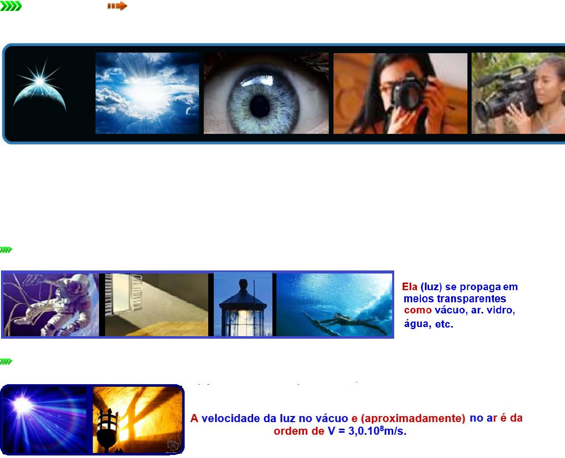 Princípios da Propagação da Luz Conceitos e definições sobre luz Conceito de Luz Grandeza física (forma de energia radiante, que é um tipo de energia que se propaga por meio de ondas eletromagnéticas, como: ondas de rádio, TV, micro-ondas, raios x, raios infra vermelho, radiações ultra violeta, etc., e inclusive a luz ) emitida por certas substâncias e sob certas circunstâncias, que nos permite enxergar (atuando nos órgãos visuais, produz a sensação da visão), fotografar, filmar, etc. Raios de luz ou raios luminosos A propagação da luz é representada pelos raios de luz (raios luminosos) que são linhas orientadas que indicam a direção e o sentido de propagação da luz que é indicado por uma seta.. Fisicamente, os raios de luz não existem sendo apenas elementos geométricos que facilitam nosso estudo da óptica geométrica. Feixe ou pincel de luz Trata-se de um conjunto de raios de luz Fonte de luz Uma fonte de luz ou uma fonte luminosa pode ser qualquer corpo visível ou qualquer corpo capaz de emitir luz. Pode ser: Primária (corpo luminoso) emite luz própria exemplos, Sol, lâmpada acesa, chama de uma vela, estrelas, etc. Secundária (corpo iluminado) recebe a luz de uma fonte primária e a reflete (difunde) exemplo, Lua, mesa, parede, etc. Princípios da propagação da luz Princípio da propagação retilínea da luz O princípio da propagação retilínea da luz pode ser definido como: “em meios homogêneos e transparentes a luz se propaga em linha reta” Este princípio pode ser comprovado pelas figuras acima onde objetos e suas respectivas sombras possuem semelhanças geométricas ou pelas figuras acima onde o observador só enxergará a chama da vela se os orifícios estiverem em linha reta e onde o laser emite luz se propagando em linha reta. Princípio da Independência dos raios luminosos O princípio da independência dos raios luminosos afirma que: “ feixes de luz podem se cruzar se que um altere a propagação do outro” Observe na figura acima que, após se cruzarem os raios de luz continuam seus caminhos como se nada tivesse acontecido. Princípio da reversibilidade dos raios luminosos O princípio da reversibilidade dos raios luminosos afirma que: “A trajetória de um raio de luz permanece a mesma quando se inverte o seu sentido de propagação” Devido à esse princípio, na figura da esquerda acima, se os olhos do motorista estão enxergando os olhos do passageiro, os olhos do passageiro também enxergarão os olhos do motorista e na figura da direita a trajetória dos raios de luz é a mesma, independente de as fontes estarem em P ou em Q. Se você está enxergando um objeto, certamente os infinitos raios de luz emitidos pelo objeto devem atingir seus olhos. Os raios de luz estão sempre dirigidos do objeto para o olho. Meios ópticos Para se enxergar um corpo (no nosso exemplo, a borboleta), a luz emitida por ela deve atravessar o meio e atingir os olhos do observador. Como o meio transparente (figura I) permite a visão nítida do objeto, em seu interior, os raios de luz percorrem trajetórias regulares, até chegarem ao olho do observador. No meio translúcido (figura II), a visão do objeto não é nítida e, em seu interior os raios de luz percorrem trajetórias irregulares, até chegarem ao olho do observador. Nos meios opacos (figura III) a luz não se propaga e o observador não enxerga o objeto. O que você deve saber, informações e dicas Conhecer e entender os três princípios de propagação da luz. Lembrar que ano luz é medida de distância (distância que a luz percorre em um ano, no vácuo e aproximadamente no ar, com velocidade de 3,0.10 8 m/s. Consequências da propagação retilínea da luz Fonte extensa (tamanho não desprezível) projeta sombra e penumbra. Eclipse solar Analise com atenção todos os detalhes da figura abaixo: Eclipse lunar Analise com atenção todos os detalhes da figura abaixo: Fases da Lua Um eclipse solar ocorre quando a Lua está na fase Nova e um eclipse da Lua quando está na fase cheia (veja figura). Período de lunação corresponde ao intervalo de tempo compreendido entre duas Luas novas consecutivas que é de aproximadamente 30 dias (29 dias, 12 horas e 44 minutos). Como o eclipse solar ocorre na Lua nova e o lunar na Lua cheia, o intervalo de tempo mínimo entre um eclipse solar e um lunar deve ser da metade desse valor (aproximadamente 15 dias, duas semanas), que é o tempo que a Lua para passar da fase de Lua nova para a fase de Lua cheia. Câmara escura de orifício Trata-se do princípio de funcionamento de uma máquina fotográfica baseado na propagação retilínea da luz. Todos os infinitos raios de luz que são emitidos pelo objeto a ser projetado, passam através de um pequeno orifício e atingem a parte interior oposta da câmara. . Com isso a luz que sai do ponto (A) superior do objeto (no nosso exemplo, borboleta) atingirá a parede oposta no ponto inferior (A’) da imagem projetada, formando uma imagem invertida, conforme a figura. O mesmo acontece nas partes laterais, trocando a direita pela esquerda (imagem reversa). Semelhança de triângulos = observe que objeto e imagem trocam cima por baixo (invertida) e direita pela esquerda (reversa). Se o orifício da câmara for aumentado a nitidez da imagem diminui e sua luminosidade aumenta. Comparação entre o globo ocular e uma máquina fotográfica Cálculo da altura de um edifício Não é possível visualizar um pincel de luz. O máximo que conseguimos é visualizar sua forma se jogarmos farinha, talco, fumaça, neblina, nuvens, poeira, spray de inseticida ou perfume no ar, etc. ou outro algum outro tipo de material particulado (partículas coloidais) sobre ele. Neste caso poderemos observar as partículas do talco, da farinha, da fumaça, da neblina mas não o pincel de luz. Este fenômeno, também observado quando você abre a janela do seu quarto de manhã, deixando a luz do Sol entrar, é conhecido como efeito T