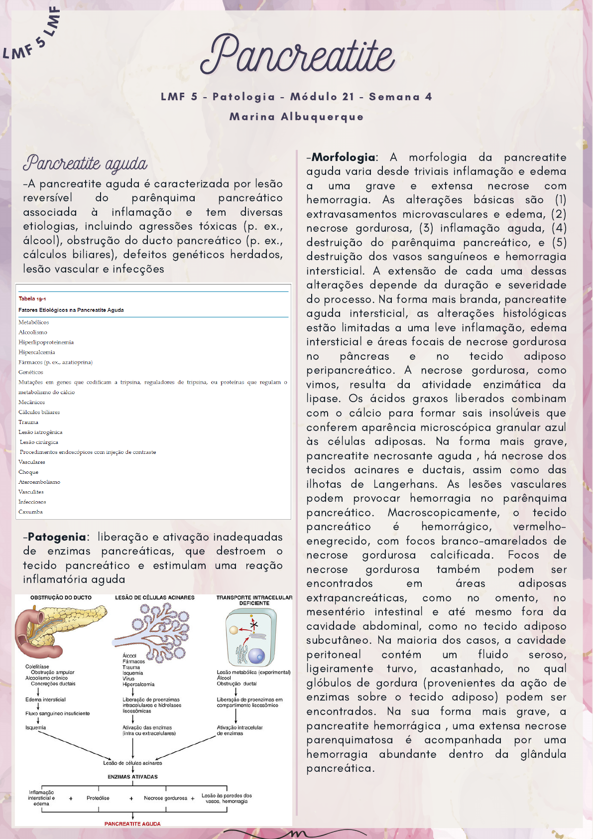 -Morfologia: A morfologia da pancreatite aguda varia desde triviais inflamação e edema a uma grave e extensa necrose com hemorragia. As alterações básicas são (1) extravasamentos microvasculares e edema, (2) necrose gordurosa, (3) inflamação aguda, (4) destruição do parênquima pancreático, e (5) destruição dos vasos sanguíneos e hemorragia intersticial. A extensão de cada uma dessas alterações depende da duração e severidade do processo. Na forma mais branda, pancreatite aguda intersticial, as alterações histológicas estão limitadas a uma leve inflamação, edema intersticial e áreas focais de necrose gordurosa no pâncreas e no tecido adiposo peripancreático. A necrose gordurosa, como vimos, resulta da atividade enzimática da lipase. Os ácidos graxos liberados combinam com o cálcio para formar sais insolúveis que conferem aparência microscópica granular azul às células adiposas. Na forma mais grave, pancreatite necrosante aguda , há necrose dos tecidos acinares e ductais, assim como das ilhotas de Langerhans. As lesões vasculares podem provocar hemorragia no parênquima pancreático. Macroscopicamente, o tecido pancreático é hemorrágico, vermelho- enegrecido, com focos branco-amarelados de necrose gordurosa calcificada. Focos de necrose gordurosa também podem ser encontrados em áreas adiposas extrapancreáticas, como no omento, no mesentério intestinal e até mesmo fora da cavidade abdominal, como no tecido adiposo subcutâneo. Na maioria dos casos, a cavidade peritoneal contém um fluido seroso, ligeiramente turvo, acastanhado, no qual glóbulos de gordura (provenientes da ação de enzimas sobre o tecido adiposo) podem ser encontrados. Na sua forma mais grave, a pancreatite hemorrágica , uma extensa necrose parenquimatosa é acompanhada por uma hemorragia abundante dentro da glândula pancreática. -A pancreatite aguda é caracterizada por lesão reversível do parênquima pancreático associada à inflamação e tem diversas etiologias, incluindo agressões tóxicas (p. ex., álcool), obstrução do ducto pancreático (p. ex., cálculos biliares), defeitos genéticos herdados, lesão vascular e infecções PancreatitePancreatite M a r i n a A l b u q u e r q u eM a r i n a A l b u q u e r q u e Pancreatite agudaPancreatite aguda L M F 5 L M F 5 -Patogenia: liberação e ativação inadequadas de enzimas pancreáticas, que destroem o tecido pancreático e estimulam uma reação inflamatória aguda L M F 5 - P a t o l o g i a - M ó d u l o 2 1 - S e m a n a 4L M F 5 - P a t o l o g i a - M ó d u l o 2 1 - S e m a n a 4 -Definida como uma inflamação prolongada do pâncreas associada com uma destruição irreversível do parênquima exócrino, fibrose e, nos estágios mais avançados, destruição do parênquima endócrino. A causa mais comum de pancreatite crônica é o abuso de álcool em longo prazo. Outras causas incluem: Obstrução prolongada do ducto pancreático por cálculos ou neoplasias, lesão autoimune da glândula, pancreatite hereditária -Patogenia: A pancreatite crônica, na maioria das vezes, segue-se a episódios repetidos de pancreatite aguda. Sugere-se que a pancreatite aguda inicie uma sequência de fibrose perilobular, distorção ductal e alterações nas secreções pancreáticas. Ao longo do tempo e com episódios múltiplos, pode levar à perda de parênquima pancreático e à fibrose. -Pancreatite autoimune: Forma patogenica- mente distinta de pancreatite crônica, que está associada à presença de plasmócitos secretores de IgG4 no pâncreas. A pancreatite autoimune é uma manifestação de doenças relacionadas à IgG, que pode envolver vários tecidos. Pode imitar os sinais e sintomas do carcinoma pancreático. É importante reconhecê-la porque responde à terapia com esteroides. -Morfologia: A pancreatite crônica é caracterizada por fibrose, atrofia e destruição de ácinos e dilatação variável de ductos pancreáticos. Imagem: região de necrose de gordura, à direita, e necrose focal do parênquima pancreático (centro) Imagem: Pâncreas seccionado longitudinalmen- te, revelando áreas escuras de hemorragia na cabeça e área focal pálida, de necrose gordurosa peripancreática (superior, à esquerda). -Aspectos clínicos: A dor é constante e intensa e se localiza na parte superior das costas e, ocasionalmente, no ombro esquerdo. Sua gravidade pode variar de leve e desconfortável a severa e incapacitante. Sintomas como anorexia, náuseas e vômitos frequentemente acompanham a dor. Os níveis plasmáticos elevados de amilase e lipase favorecem o diagnóstico de pancreatite aguda. Podem ocorrer leucocitose, coagulação intravascular disseminada, edema, síndrome da angústia respiratória aguda e necrose gordurosa difusa. Complicações envolvem choque, devido à síndrome da resposta inflamatória sistêmica, e necrose tubular renal aguda. Pancreatite crônicaPancreatite crônica -Aspectos clínicos: A pancreatite crônica pode se apresentar de diversas formas. Pode estar associada a repetidas crises de pancreatite aguda ou a ataques repetidos de dor abdominal moderada a grave, ou a persistentes dores abdominais e nas costas. Esses ataques podem ser desencadeados por abuso de álcool, excessos alimentares (por aumentar a demanda no pâncreas), ou pelo uso de opiáceos e outros fármacos que aumentam o tônus do esfíncter de Oddi. Em outros pacientes, a doença pode ser totalmente silenciosa até que se desenvolva insuficiência pancreática e diabetes melito devido à destruição do pâncreas exócrino e endócrino. Os sinais clínicos incluem dor abdominal intermitente ou persistente, má absorção intestinal e diabetes Macroscopicamente, a glândula é rígida, por vezes com ductos extremamente dilatados e visíveis contendo concreções calcificadas. Essas alterações são tipicamente acompanhadas por um infiltrado inflamatório crônico em torno dos lóbulos e dos ductos. O epitélio ductal