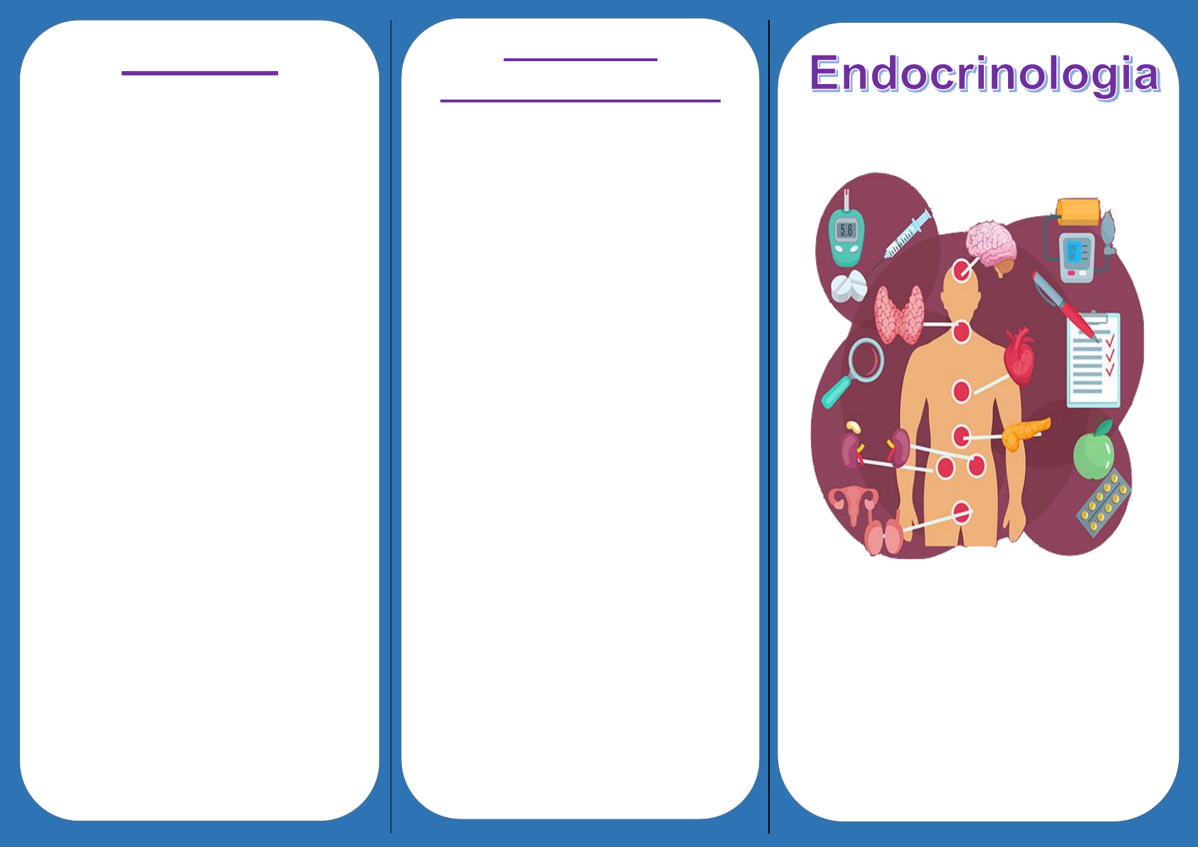 * Folder elaborado como parte da avaliação para disciplina Assistência Farmacêutica. Manual elaborado por; Adilson Ap. da Silva Ra: 7132678 3º Semestre de Farmácia. Tratamento com endocrinologista O tratamento de diabetes envolve uma série de cuidados que vão muito além do controle dos níveis de açúcar no sangue, por isso é muito importante o acompanhando de uma endocrinologista, que deverá cuidar da saúde geral do paciente, este especialista, através de exames de rotina, poderá monitorar a doença, seus riscos e problemas diretos e indiretos. O endocrinologista foi treinado para diagnosticar os desequilíbrios hormonais e promover o tratamento para reequilibrar o organismo. Suas ações no tratamento envolve o controle das taxas de açúcar, bem como monitoramento de outros órgãos comumente afetados, como sistema vascular, os rins, o coração e os olhos. O médico deverá ainda, cuidar da saúde geral do paciente, orientado sobre a dieta e prática de exercícios, além de controlar a pressão e o peso, em cerca de 2 ou 3 consultas ao longo do ano. É muito comum que o homem com diabetes passe a apresentar diminuição dos hormônios masculinos com todas as consequências desta falta e deve ser tratados. Diabetes A diabetes é uma doença que se torna cada vez mais comum, de acordo com o Ministério da Saúde, 7% dos brasileiros são diabéticos, equivalente a 12 milhões de pessoas. Diabetes é quando há aumento nos níveis de açúcar no sangue, pois há desequilíbrio na produção de insulina. A insulina é um hormônio extremamente importante para o corpo humano, pois ele ajuda as células a absorverem a quantidade certa de glicose, que será transformada em energia para o organismo, quando ocorre a queda na produção do hormônio, o açúcar que ingerimos não é absorvido corretamente pelas células, aumentando o nível glicêmico no sangue e desencadeando a doença. As complicações que a diabete gera são alterações renais, danos aos nervos, formigamento, dor, fraqueza e perda de sensibilidade no pés, aparecimento de rachaduras nos pés, calos que não tratados podem se transformar em feridas abertas. Para mais informações acesse o site; https://www.diabetes.org.br O que é Endocrinologia? É a especialidade médica que cuida do funcionamento das glândulas e das doenças que as afetam. As glândulas são órgãos do corpo humano que liberam os hormônios na corrente sanguínea. Já os hormônios, por sua vez, são substâncias que regulam o funcionamento de diversas funções do nosso organismo. As principais áreas de atuação são o tratamento de diabetes, obesidade, doenças da tiroide, desordens da glândula hipófise, distúrbios da menstruação, crescimento, osteoporose, acne e excesso de pelos em mulheres, andropausa, distúrbios da puberdade, tiroide e doenças da hipófise. No Brasil a Endocrinologia, foi introduzida na década de 1950, a especialidade vem ganhando projeção, pois as desordens por ela tratadas vem aumentando sua prevalência na população brasileira e no mundo. Para mais informações acesse; https://www.endocrino.org.br/ Sistema Endócrino Masculino e Feminino Pâncreas; são produzidos hormônios insulina e glucagon que reduz a concentração de glicose no sangue. Glândula pineal; são produzidos hormônios melatonina, interfere nos sistemas imunitário, hormonal e nervoso e na regulação do sono. Timo; Hormônios produzidos são timosina e timopoietina, ambos regulam atuando na maturação dos linfócitos T. Testículos: Hormônio produzido: testosterona. que na puberdade, regula o aparecimento dos caracteres sexuais secundários e estimula a espermatogênese. Mantém o metabolismo promovendo a síntese de proteínas no sistema muscular, aumentando a musculatura. Ovários: Hormônios produzidos: estrógeno, progesterona e gonadotropina as funções: estrógeno = na puberdade, é responsável pelo aparecimento dos caracteres sexuais secundários. No ciclo menstrual, estimula o crescimento da parede do útero (endométrio), que se prepara para o eventual recebimento do embrião; Progesterona = mantém o endométrio desenvolvido. Hipófise; Hormônios produzidos: adrenocorticotrópico, tireoideotrópico, folículo estimulante, luteinizante, hormônio do crescimento e prolactina. Hipotálamo; são produzidos ocitocina e hormônio antidiurético (ADH) ou vasopressina. Hormônios https://www.endocrino.org.br/