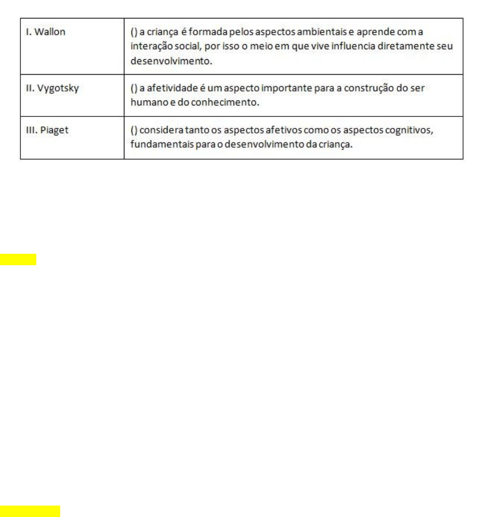 Educação Infantil Avaliação On-Line 3 (AOL 3) - Questionário Conteúdo do teste Pergunta 1 1 ponto Estudiosos de desenvolvimento infantil mostraram, em suas teorias, o impacto da afetividade e sua importância no processo de aprendizagem da criança na primeira infância. De acordo com o que foi estudado, relacione os autores com suas teorias. IMG_10(2).JPG Agora, assinale a alternativa que apresenta a sequência correta. II, III e I. I, III e II. II, I e III. III, I e II. I, II e III. Pergunta 2 1 ponto Sobre a organização do tempo e do espaço que são de fundamental importância na Educação Infantil, analise as seguintes afirmativas. I. Trabalhar com as crianças em diferentes espaços possibilita o surgimento de novas formas de ação, de movimento e de experiências. II. O uso de ambientes variados e a variação dentro de um mesmo ambiente geram insegurança e instabilidade nas crianças. III. O tempo e o espaço podem ser analisados como fontes de poder social, denotando modos de pensar e de conceituar o mundo. A partir da análise, conclui-se que estão corretas. I e III apenas. I, II e III. I e II apenas. II e III apenas. Apenas a III. Pergunta 3 1 ponto Não é comum encontrar nos currículos de formação de professores a disciplina “afetividade”, porém, é um tema de extrema relevância na área da educação. Considerando o que aprendeu durante as aulas e analisando as cenas do filme Como estrelas na terra apresentadas na tira abaixo, analise as afirmações a seguir que indicam a influência da afetividade no processo de formação do aluno: IMG_11(2).JPG Fonte: Como estrelas na terra. Direção: Produção: Cidade: Produtora: , ano. I)A afetividade do professor com o aluno é importante para o bom desempenho escolar de alunos de todas as idades. II)A construção da afetividade no ambiente escolar é uma ação positiva no processo de aprendizagem. III)A afetividade entre professor e aluno pode ter influência negativa durante o processo de aprendizagem. IV)A afetividade do professor com os alunos gera o autoritarismo. V)A afetividade do professor com os alunos gera autoridade. Agora assinale a alternativa correta: As afirmações I, II e III estão corretas. As afirmações III e IV estão corretas. As afirmações II, III e IV estão corretas. As afirmações I, II e V estão corretas. As afirmações I, II e IV estão corretas. Pergunta 4 1 ponto No estudo da matemática, as crianças passam por diversas situações que envolvem número e quantidades. Nesses casos, os jogos, quando bem preparados, ocupam um lugar de destaque. Por meio deles, elas vão construindo devagar os conceitos matemáticos. Considerando o exposto acima, classifique as afirmações apresentadas em verdadeiras (V) ou falsas (F). ( ) É um recurso eficaz, pois a criança aprende a agir numa esfera cognitiva. ( ) Aumenta o interesse dos alunos pela matemática como forma alternativa. ( ) Funciona como instrumento recreativo, desenvolvendo uma atitude passiva dos alunos diante de desafios. ( ) Estimula a curiosidade, da autoconfiança, possibilitando o desenvolvimento da linguagem e da concentração. ( ) Permite que as crianças utilizem recursos próprios para resolver problemas cotidianos. Agora, assinale a alternativa que apresenta a sequência correta. V, F, V, F e F. V, V, F, F e V. V, V, F, V e V. V, F, V, V e F. F, V, F, V e V. Pergunta 5 1 ponto Numa reunião pedagógica, os professores discutiram como tema a utilização de jogos no processo ensino-aprendizagem. Ao expor as experiências com a temática, uma das professoras afirmou que o uso dos jogos no ensino de alguns conteúdos vinha apresentando bons resultados. Sobre o brincar na educação, dizemos corretamente que: I.Os jogos têm função de lazer e na escola melhor se adéquam como auxiliares ao trabalho docente e por isso só acontecem nos recreios. II.Os jogos trazem para as crianças noção de relações sociais e regras. III.Os jogos e brinquedos são práticas culturais que não precisam ser aceitas nas escolas, pois são bem vivenciadas fora dela. IV.Os brinquedos podem estar integrados ao ensino, uma vez que são auxiliares e integrados ao desenvolvimento humano. Assinale a alternativa correta. Somente a afirmativa II está correta. Somente as afirmativas I e IV estão corretas. Somente as afirmativas I e III estão corretas. Somente as afirmativas II e IV estão corretas. Somente as afirmativas II e III estão corretas. Pergunta 6 1 ponto Estruturas didáticas são formadas por múltiplas estratégias que são organizadas por meio das intenções educativas descritas no projeto educativo. Essas estruturas formam um instrumento para o planejamento do professor e podem ser agrupadas em três grandes modalidades. São elas: I.atividades permanentes, sequência de atividades e projetos de trabalho. II.atividades variáveis, sequência de projetos e projetos de atividades. III.atividades permanentes, sequência de atividades e projetos variáveis. IV.atividades variáveis, sequência de atividades e projetos permanentes. V.atividades permanentes, sequência de projetos e atividades variáveis. A partir da análise, conclui-se que estão corretas: Apenas I. Apenas V. Apenas III. Apenas II. Apenas IV. Pergunta 7 1 ponto O Referencial Curricular Nacional para Educação Infantil (RCNEI) é um documento que traz orientações didáticas importantes para organização do trabalho a ser realizado com crianças de zero a seis anos de idade. Esse documento está dividido em seis eixos que trazem aspectos importantes a serem trabalhados para promover o desenvolvimento das crianças, são eles: I)Movimento, convivência, desenho e brincadeira. II)Conviver, brincar, participar, explorar, expressar e conhecer-se. III)Movimento, música, artes, linguagem oral e escrita. IV)Movimento, música, artes, linguagem e matemática. V)Movimento, música, artes, linguagem oral e escrita e matemática. Agora, assinale a alternativa corre