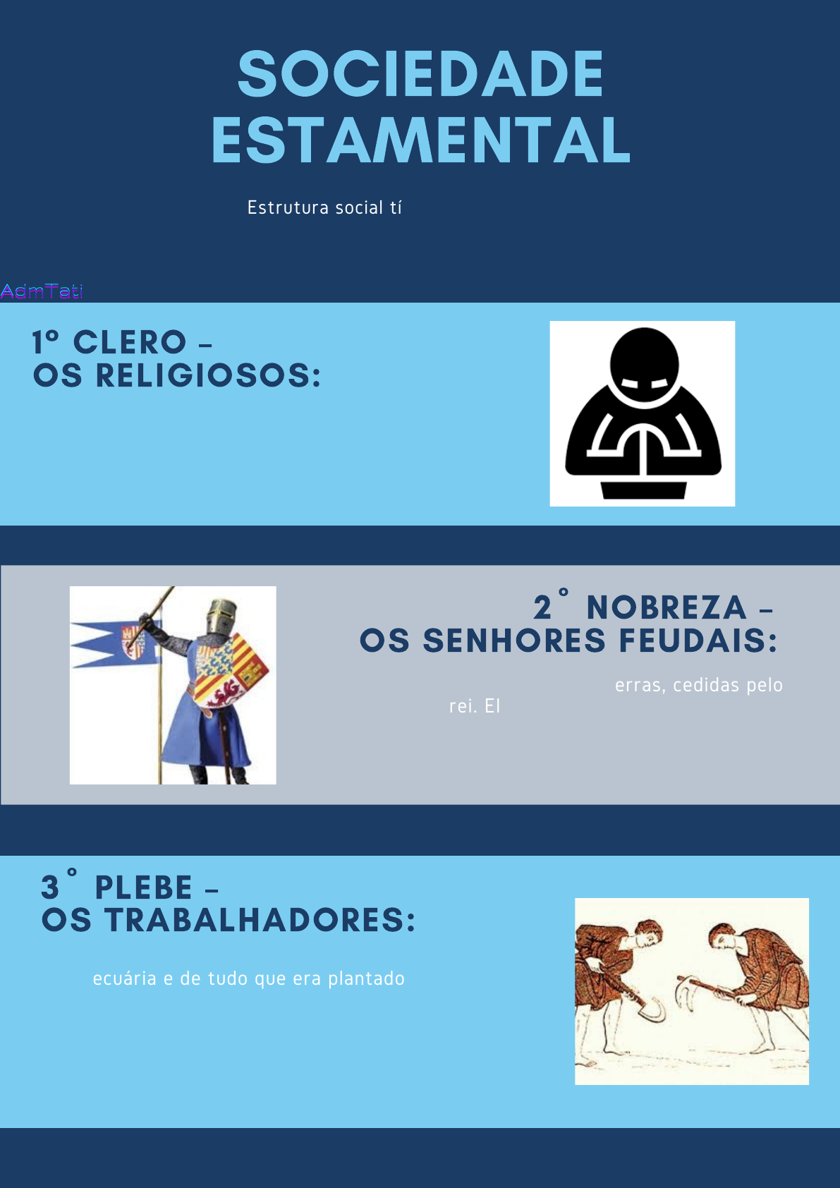 SOCIEDADE ESTAMENTAL Estrutura social típica do sistema feudal medieval, dividida nos estamentos (grupos sociais) Exerciam grande poder político sobre uma sociedade bastante religiosa, onde o conceito de separação entre a religião e a política era desconhecido. 1° CLERO – OS RELIGIOSOS: Eram os donos das terras, cedidas pelo rei. Eles pagavam pelo uso com parte daquilo que era produzido nas terras. O rei lhes cedia terras e estes lhe juravam ajuda militar. 2º NOBREZA – OS SENHORES FEUDAIS: Eram a maioria da população. Cuidavam da agropecuária e de tudo que era plantado nos feudos e, em troca, recebiam uma parte do que produziam. Estavam presos à terra, sofriam intensa exploração (talha), eram obrigados a prestar serviços à nobreza (corveia) e a pagar-lhes diversos tributos em troca da permissão de uso da terra (banalidades) e de proteção militar. 3º PLEBE – OS TRABALHADORES: