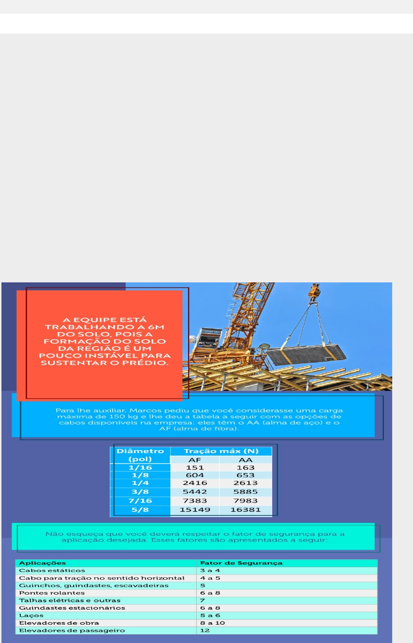 Desafio Equilíbrio de partícula – análise bidimensional Parabéns! Você está fazendo seu primeiro estágio do curso de Engenharia, em uma construtora reconhecida por proporcionar excelente formação inicial aos discentes que nela trabalham. Esse diferencial se dá ao fato de que a empresa valoriza a prática como meio de aprendizagem e formação. Dessa forma, você participa ativamente dos projetos por ela desenvolvidos. Sua função vai muito além de cálculos teóricos, você tem a oportunidade de opinar na escolha dos materiais a serem empregados nas obras. Certo dia, quando você chega para cumprir seu turno de trabalho, Marcos, seu supervisor, lhe dá a tarefa de escolher qual o melhor cabo de aço a ser utilizado no guincho para retirar a terra recolhida na escavação dos tubulões para as fundações de um prédio, conforme pode ser observado na imagem a seguir: Com base nisso, apresente um breve relatório especificando qual o cabo escolhido e que fatores lhe fizeram optar por ele. RESPOSTA: Levando em consideração que no guincho só atuam forças na direção vertical, ele deverá suportar uma carga máxima de 1471,5 N. Conforme a tabela, o fator de segurança para aplicação em guinchos é 5, nesse caso, o cabo deve suportar uma tração de 7357,5 N. Segundo as especificações dos cabos de aço disponíveis na empresa, devemos utilizar o cabo AF de 7/16 polegadas. A conformação do guincho assemelha-se ao sistema de eixos cartesianos a seguir: O melhor cabo para a situação é, então, o cabo AF de 7/16 polegadas.