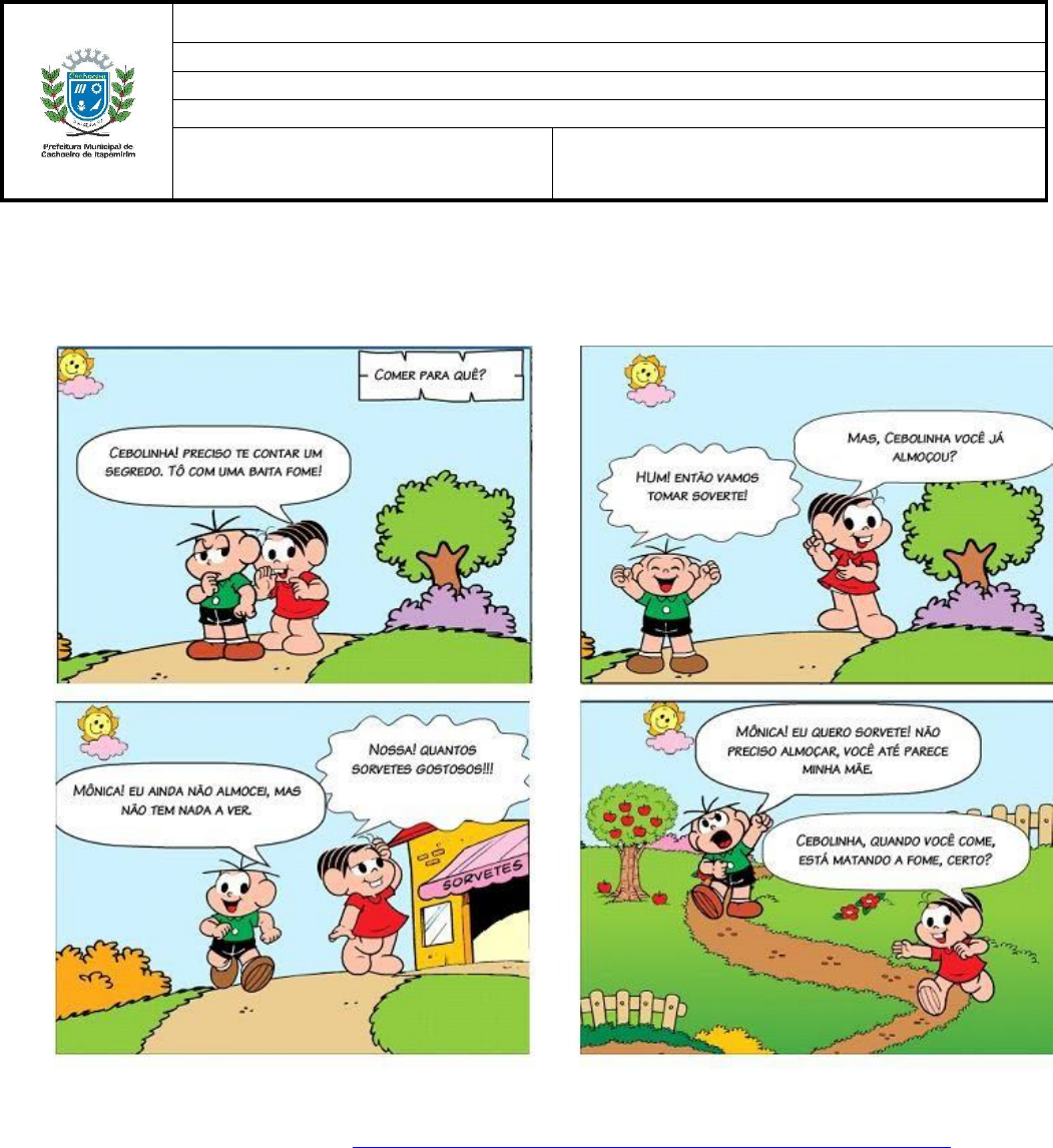 Leia a História em Quadrinho e observe as palavras: preciso, comer, contar e almocei. https://sites.google.com/site/bsanchesunirio/historia-em-quadrinhos Essas palavras são verbos, ou seja, são palavras que indicam ação. EMEB “GALDINO THEODORO DA SILVA” ALUNO (A): PROFESSOR (A): MONIQUE LEANDRO OLIVEIRA LIMA COMPONENTE CURRICULAR: LÍNGUA PORTUGUESA TURMA: 5º ANO - VESPERTINO Data: https://sites.google.com/site/bsanchesunirio/historia-em-quadrinhos O VERBO é a palavra que pode ser usado em três tempos Fonte: Livro didático Buriti Mais Português, página 90 Pretérito (Passado) tomou, comeu, precisou Presente (Agora) quero, almoça, comemos Futuro contarei, almoçarão, tomaremos Atividade 01 (EF05LP05/ES)Agora leia a notícia retirada do livro didático Buriti mais Português página 91 e copie os quatro verbos que estão no tempo passado. Leia a notícia: Daniel Dias ampliou sua galeria de conquistas neste domingo. O nadador faturou a prata na prova dos 100 metros peito SB4, com 1m36s13, e assegurou sua 19ª medalha em Paraolimpíadas. O ouro ficou com o chinês Junsheng Li, com 1m35s96 [...] Atividade 02 (EF05LP05/ES) Os verbos pertencem a três conjugações: 1ª Conjugação, com terminação AR (Ex: amar, falar, abraçar); 2ª Conjugação, com terminação ER (Ex: comer, fazer, beber); 3ª Conjugação, com terminação IR (Ex: divertir, sentir, abrir). Agora pesquise em revistas ou jornais e cole em seu caderno três verbos de cada conjugação: 1ª Conjugação (terminação AR) 2ª Conjugação (terminação ER) 3ª Conjugação (terminação IR) Leia a História em Quadrinho e observe as palavras: preciso, comer, contar e almocei. https://sites.google.com/site/bsanchesunirio/historia-em-quadrinhos Essas palavras são verbos, ou seja, são palavras que indicam ação. O VERBO é a palavra que pode ser usado em três tempos Fonte: Livro didático Buriti Mais Português, página 90