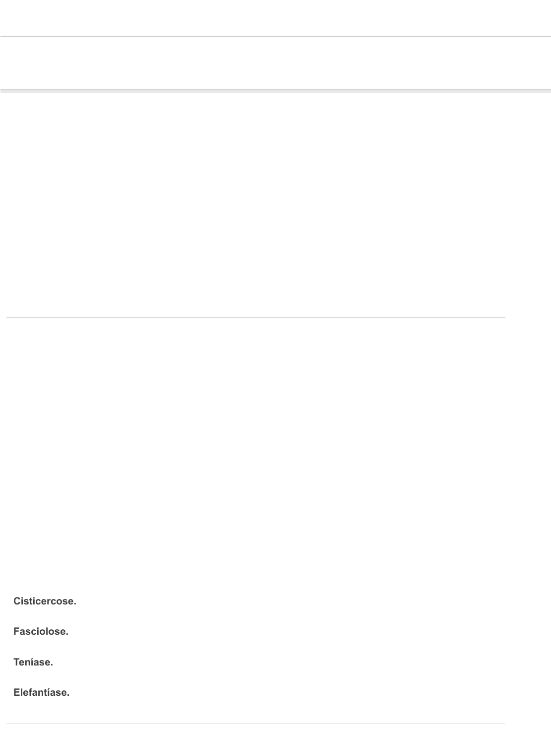 Assignment Content Ocultar opções de resposta Avaliação On-Line 4 (AOL 4) - Questionário Maria Valeria Andrade Mello Pergunta 1 -- /1 Segundo estudos realizados em 2010, o látex proveniente da planta Synadenium carinatum boiss se mostrou um eficiente moluscucida no combate aos moluscos do gênero Biomphalaria (Revista Eletrônica de Farmácia. n. 3., 2010). A utilização dessa substância em águas contendo esse molusco tem potencial para atuar do controle da: Resposta corretaEsquistossomose. Cisticercose. Fasciolose. Teníase. Elefantíase. 6/10 Nota final Enviado: 18/04/21 13:19 (AMT) Valéria Aprovado Ocultar opções de resposta Pergunta 2 -- /1 Segundo Neves (2002), estima-se que cerca de 112 milhões de pessoas estão infectadas pela W. bancrofti, causadora da Elefantíase em pelo menos 80 países. No Brasil, a doença é encontrada com maior frequência nas regiões Norte e Nordeste: Com casos na Amazônia, Pará, Maranhão, Recife, Bahia, Paraíba, Pernambuco e Alagoas. Com base nisto, marque a alternativa incorreta com relação aos principais fatores epidemiológicos da doença. Resposta correta Se o paciente tem histórico de utilização de córregos de água para atividades de lazer. O ser humano como única fonte de infecção (ausência de animais reservatórios). Presença das fêmeas do mosquito doméstico Culex quinquefasciatus, conhecido popularmente como pernilongo, muriçoca ou carapanã. Temperaturas ambientais elevadas Tempo de residência do paciente em áreas endêmicas. Pergunta 3 -- /1 Sobre o complexo de doença teníase-cisticercose, causado por espécies de Taenia e que constitui um sério problema de saúde pública em países onde existem precárias condições sanitárias, socioeconômicas e culturais. Podemos afirmar que: I)Os agentes responsáveis por esse complexo de doença são os vermes Taenia solium e Taenia saginata, cujo hospedeiro é, respectivamente, um porco ou um boi. II)A profilaxia desse complexo de doença deve ser feita, principalmente, com o incentivo ao uso de fossas e esgotos e à recomendação de que se coma carne de porco ou boi cozida ou bem passada. Ocultar opções de resposta Ocultar opções de resposta III) Formas de profilaxia desse complexo constituem andar constantemente calçado, evitando-se, assim, a penetração, pela sola do pé, de cercárias responsáveis pela teníase. Resposta corretaApenas I e II estão corretas. Incorreta: Nenhuma das alternativas está correta Apenas I está correta. Apenas II e III estão corretas. I, II, III estão corretas. Pergunta 4 -- /1 Os vermes do gênero Taenia apresentam tamanhos variados com o corpo achatado dorsoventralmente, em forma de fita, segmentado, provido de órgão de fixação chamado de escólex na sua porção anterior (Neves, 2002). Marque a alternativa correta com relação as estruturas indicadas na figura abaixo de um verme adulto. PARASITOLOGIA QUEST 02 UNID 4_v1.PNG Incorreta: 1 - Éscolex ou cabeça, 2 - colo ou estróbilo, 3 - proglotes primária, 4 - proglotes maduras e 5 - proglotes grávidas. 1 - proglotes grávidas, 2 - colo ou estróbilo, 3 - proglotes jovens, 4 -proglotes maduras e 5 - Éscolex ou cabeça. 1 - Éscolex ou cabeça, 2 - colo ou estróbilo, 3 - proglotes jovens, 4 -proglotes maduras e cauda. Ocultar opções de resposta 1 - Éscolex ou cabeça, 2 - ventosas, 3 - proglotes jovens, 4 - proglotes maduras e 5 - proglotes grávidas. Resposta correta 1 - Éscolex ou cabeça, 2 - colo ou estróbilo, 3 - proglotes jovens, 4 -proglotes maduras e 5 - proglotes grávidas. Pergunta 5 -- /1 As tênias (Taenia solium e Taenia saginata) são vermes grandes achatados, em forma de fita, podendo atingir até 8m, a coloração é branca ou levemente amarelada, a superfície do corpo é ligeiramente enrugada, marcada por sulcos transversais nos limites das proglotes. De acordo com Rey (2008), existem no ciclo de vida deste parasita três tipos morfológicos. Marque a alternativa que contém todas essas formas: Ovos, cercaria e adultos. Cisto, metacercária e adultos. Amastigota, epimastigota e matacíclica. Resposta corretaOvos, cisticerco e adultos. Ovos, cisto e adultos. Pergunta 6 -- /1 Os vermes parasitas, pertencentes a espécie Wuchereria bancrofti, apresentam dimorfismo sexual e diversas formas morfológicas em seu ciclo de vida, com relação as características dessas espécies, marque a alternativa incorreta: Ocultar opções de resposta Ocultar opções de resposta Os vermes adultos machos são vermes de aspecto translucido. Apresentam uma estrutura corpórea delgada, medindo em média 4cm de comprimento. A sua extremidade anterior é afilada e a posterior se encontra enrolada ventralmente. São verme de aspecto fino e delicados encontrados geralmente, nos vasos linfáticos, vasos sanguíneos, tecido subcutâneo. Resposta correta As formas larvais são encontradas no molusco vetor, são formas pequenas medindo em média 300 micrometros. Elas se diferenciam até chegar ao quarto estágio de desenvolvimento, quando são chamadas de larvas em estágio L4. Os vermes adultos fêmeas apresentam o corpo delgado e coloração branca. Elas medem em média 10cm, sendo, portanto, maiores que os machos. Apresentam órgãos genitais duplos, com exceção da vagina. As microfilárias são formas bem diminutas, medindo cerca de 250 micrometros e podem ser conhecidas também como embrião. Essas são resistidas por uma membrana delicada e flexível, chamada de bainha cuticular Pergunta 7 -- /1 As espécies do gênero Taenia (Taenia solium e Taenia saginata) são encontradas no intestino delgado humano, na fase adulta do seu ciclo de vida. Este ciclo é do tipo heteróxeno e ocorre com a presença de um hospedeiro intermediário e outro definitivo. Com base na figura abaixo, indique a alternativa incorreta com relação ao ciclo desses indivíduos. PARASITOLOGIA QUEST 03 UNID 4_v1.PNG Resposta correta Uma vez no corpo do hospedeiro intermediário, o ovo do verme 