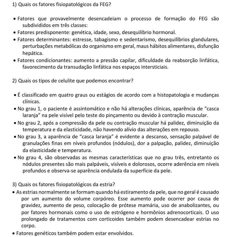 1) Quais os fatores fisiopatológicos da FEG? • Fatores que provavelmente desencadeiam o processo de formação do FEG são subdivididos em três classes: • Fatores predisponente: genética, idade, sexo, desequilíbrio hormonal. • Fatores determinantes: estresse, tabagismo e sedentarismo, desequilíbrios glandulares, perturbações metabólicas do organismo em geral, maus hábitos alimentares, disfunção hepática. • Fatores condicionantes: aumento a pressão capilar, dificuldade da reabsorção linfática, favorecimento da transudação linfática nos espaços intersticiais. 2) Quais os tipos de celulite que podemos encontrar? • É classificado em quatro graus ou estágios de acordo com a histopatologia e mudanças clínicas. • No grau 1, o paciente é assintomático e não há alterações clínicas, aparência de “casca laranja” na pele visível pelo teste do pinçamento ou devido à contração muscular. • No grau 2, após a compressão da pele ou contração muscular há palidez, diminuição da temperatura e da elasticidade, não havendo alívio das alterações em repouso. • No grau 3, a aparência de “casca laranja” é evidente a descanso, sensação palpável de granulações finas em níveis profundos (nódulos), dor a palpação, palidez, diminuição da elasticidade e temperatura. • No grau 4, são observadas as mesmas características que no grau três, entretanto os nódulos presentes são mais palpáveis, visíveis e dolorosos, ocorre aderência em níveis profundos e observa-se aparência ondulada da superfície da pele. 3) Quais os fatores fisiopatológicos da estria? • As estrias normalmente se formam quando há estiramento da pele, que no geral é causado por um aumento do volume corpóreo. Esse aumento pode ocorrer por causa de gravidez, aumento de peso, colocação de prótese mamária, uso de anabolizantes, ou por fatores hormonais como o uso de estrógeno e hormônios adrenocorticais. O uso prolongado de tratamentos com corticoides também podem desencadear estrias no corpo. • Fatores genéticos também podem estar envolvidos.