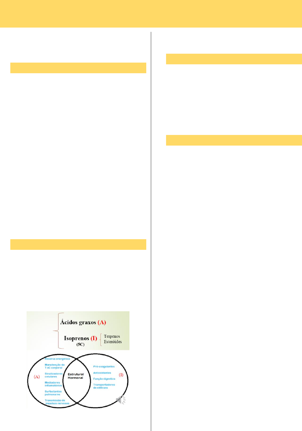 Lipídios • Quarta biomolécula mais abundante no corpo (2%), sendo a primeira a água, a segunda proteínas e a terceira carboidratos Propriedade dos lipídios • Apolares • Untuosos ao tato (viscosidade) • Densidade menor que a água • Para “dissolver” na água é preciso ser emulsionado (agente emulsificador), formando pequenas partículas de lipídio • A atuação nutricional atua junto com a metabólica e a atuação clínica • Exemplo de emulsão: maionese é uma emulsão, se ela é mais instável (aspecto mias liquefeito – camada de hidratação) significa que prevalece a fração de água, Portanto, é um tipo de emulsão óleo em água (maior parte é constituída por óleo) • O fenômeno é denominado emulsão óleo em água (O/A) quando a fase dispersa é oleosa e a fase contínua é aquosa, ou seja, quando as gotículas de óleo estão em uma solução aquosa. De modo contrário, é denominado emulsão água em óleo (A/O) quando a água é a fase dispersa e o óleo é a fase contínua. Componentes do lipídio • Ácidos graxos • Isoprenos (5C) = presentes em terpenos e esteroides. São unidades repetidas de 5 carbonos geralmente compondo uma calda isoprenílica de 2 categorias lipídicas (isoprenoides): os terpenos (vitaminas) e esteroides • Diversidade funcional • Tanto os lipídeos que contem ácidos graxos em sua estrutura quanto os que contém isoprenos entram numa convergência de função estrutural ou hormonal Principais lipídios da dieta • Triacilgliceróis - TAG (90%): gorduras neutras (ácidos graxos + glicerol) e de função energética • Fosfolipídios: (ácidos graxos + porção polar), função estrutural • Colesterol: (isoprenos + porção polar – OH), função estrutural • Vitaminas lipossolúveis (isoprenos): funções variadas* Ácidos graxos • Grupo constituinte dos lipídios De acordo com abordagem nutricional: • Ômega 3, 6 e 9 - Insaturados (essencial/não essencial) - Os ácidos graxos essenciais ou ácidos gordos essenciais são os ácidos graxos que não são produzidos bioquimicamente pelos seres humanos e devem ser adquiridos da dieta. O termo "ácido graxo essencial" refere- se aos ácidos graxos necessários aos processos biológicos e não à aqueles que funcionam como fonte de energia. - Os ácidos graxos não essenciais são aqueles que nosso metabolismo endógeno tem a capacidade de sintetizar a partir de precursores e não precisam necessariamente ser ingeridos na dieta. - Mais encontrados em fontes vegetais. - A insaturação entre carbono 3 e 4 está presente no ômega 3, entre carbono 6 e 7 é o ômega 6 e entre 9 e 10 é o ômega 9 - Ácido eicosapentaenoico EPA: ácido graxo do tipo ômega 3 e não essencial - Alfa linolênico ALA: ácido graxo do tipo ômega 3 e essencial • Fonte de Acetil-CoA - Leva em consideração o tamanho da cadeia - Ex: ácido graxo ácido palmítico – 16C, recrutado das reservas de lipídio TAG = endógeno, não essencial - Quanto maior a cadeia melhor ponto de vista para a reserva energética • Gordura TRANS - Fonte: exógena. Exemplo: leite - OMS – 2g/dia Molécula circulada apresenta insaturação entre carbono 9 e 10. A gordura trans é de fonte endógena, pastosa, mais resistente, abundante em industrializados. É prejudicial à saúde se ultrapassar a quantidade indicada pela OMS, visto que elevam os níveis de TAG (gordura que pode ser estocada no organismo, o triacilglicerol) e colesterol LDL, além de diminuir nível de HDL. Acaba acarretando risco de formação de placas de ateroma e cardíacos. A molécula central da figura possui ligação tipo CIS. É presente em diversas fontes animais e vegetais, os mais consumidos, estocados no tecido adiposo em situação de emergência e são benéficas. É o tipo de ácido graxo insaturado que faz parte nos lipídios de membrana. Numeração dos carbonos a partir de C1 Segundo IUPAC, na numeração dos carbonos a partir de C1 há duas convenções: • O padrão de numeração delta inicia-se a partir de C1 com o grupo carboxílico e segue o padrão de numeração da calda hidrocarbonada. • No padrão de numeração ômega a numeração de C1 começa pela C18. Então, o carbono C18 da imagem passa a ser o C1 e o C9, da imagem, passa a ser o C10 e vice versa. É uma numeração invertida. OBS: Triacilgliceróis, fosfolipídios e eicosanóides são exemplos de lipídios que contém ácidos graxos na sua estrutura Triacilgliceróis – TAG A parte circulada em vermelho corresponde à porção hidrofílica (álcool glicerol) dessa gordura neutra. Ela é fundamental para a formação dos triacilgliceróis porque serve como ponto de ancoramento na hidroxila dos 3 carbonos para os ácidos graxos que irão constituir o TAG. Durante o processo de síntese ocorre a esterificação de caudas de ácidos graxos (caudas apolares e hidrocarbonadas) por meio do grupo carboxílico. Em suma, a formação do triacilglicerol acontece por meio de uma ligação éster entre o grupo carboxílico do ácido graxo com a hidroxila do glicerol. Além disso, a cauda do ácido graxo pode ser saturada, insaturada ou saturada e insaturada (um misto), com característica apolar. Apesar de ser uma gordura neutra apresenta a propriedade majoritariamente apolar, por isso, os TAG não têm um trânsito fácil na corrente sanguínea. Ao ingerir alimentos, o trânsito delas ocorre por meio de lipoproteínas, se elas forem oriundas do intestino são chamadas de quilomícrons e se oriundas do fígado são denominadas de VLDL. • Formas de transporte de TAG: lipoproteínas – quilomícrons e VLDL • Local de estoque: tecido adiposo Ácidos graxos em lipídeos de membrana Fosfolipídeos (polares) Considerados polares porque possuem cabeça polar, voltado para o lado extracelular e intracelular da bicamada lipídica, em contato com a porção aquosa. Fosfatidilcolina é um tipo de fosfolipídio bastante abundante nas membranas celulares. É um exe