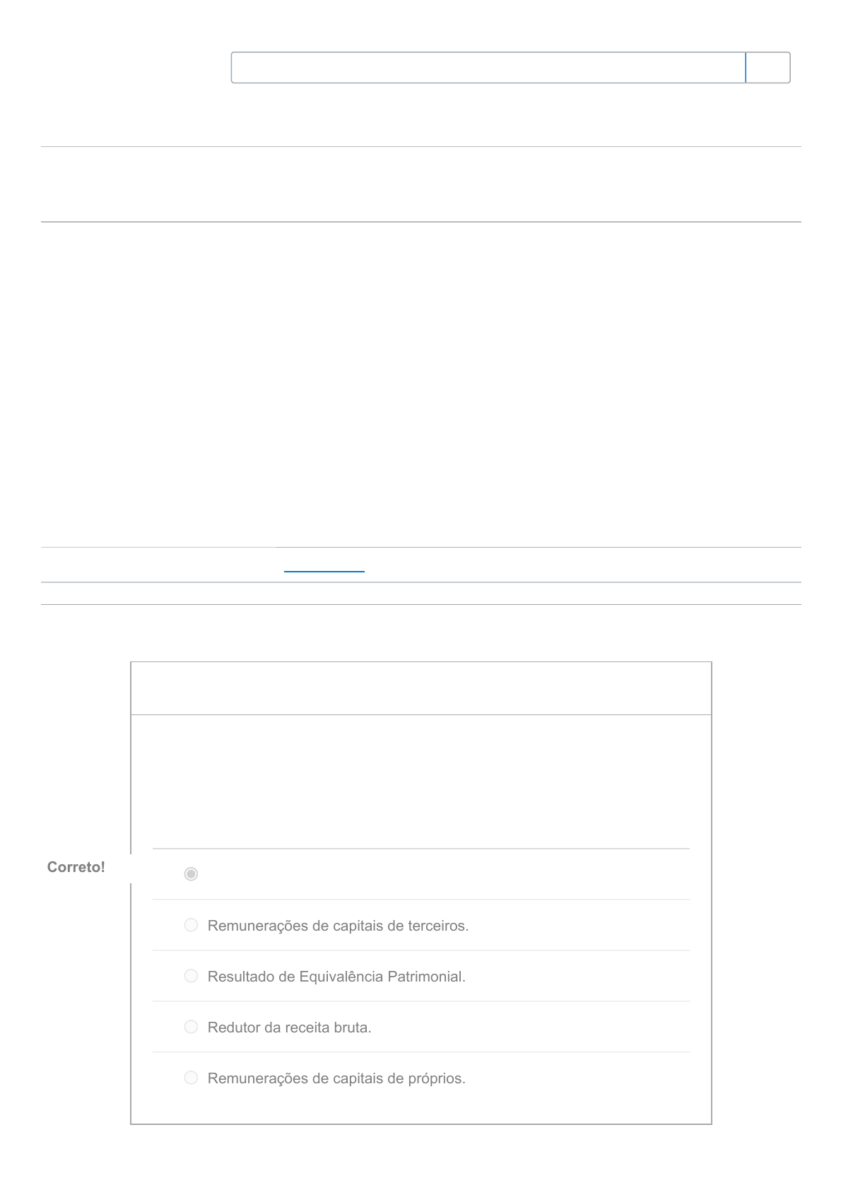 26/04/2021 Exame Final: Introdução a Contabilidade https://dombosco.instructure.com/courses/4479/quizzes/16151 1/7 Seu Progresso: 92 % Exame Final Entrega 1 mai em 23:59 Pontos 100 Perguntas 10 Disponível 26 abr em 0:00 - 1 mai em 23:59 6 dias Limite de tempo 60 Minutos Instruções Histórico de tentativas Tentativa Tempo Pontuação MAIS RECENTE Tentativa 1 38 minutos 90 de 100 Enviado 26 abr em 12:06 Esta avaliação é composta por 10 (dez) questões objetivas com valor de 10 (dez) pontos cada questão, totalizando 100 (cem) pontos. Você tem 60 (sessenta) minutos para realizá-la. 10 / 10 ptsPergunta 1 As receitas de aplicações financeiras são classificadas na Demonstração do Valor Adicionado - DVA como: Valor adicionado recebido em transferência. Correto!Correto! Remunerações de capitais de terceiros. Resultado de Equivalência Patrimonial. Redutor da receita bruta. Remunerações de capitais de próprios. https://dombosco.instructure.com/courses/4479/quizzes/16151/history?version=1 26/04/2021 Exame Final: Introdução a Contabilidade https://dombosco.instructure.com/courses/4479/quizzes/16151 2/7 10 / 10 ptsPergunta 2 No patrimônio da empresa, qual dos exemplos abaixo é considerado um direito? Máquinas e equipamentos Salários a pagar Contas a receber Correto!Correto! Caixa Estoque 10 / 10 ptsPergunta 3 Assinale a alternativa que tenha apenas Ativos Intangíveis: Direitos de uso, computadores. Marcas, canaviais. Licenças de software, direitos autorais. Correto!Correto! Veículos, assinaturas de revistas. Jazidas minerais, equipamentos agrícolas. 0 / 10 ptsPergunta 4 Analise as afirmações abaixo: 26/04/2021 Exame Final: Introdução a Contabilidade https://dombosco.instructure.com/courses/4479/quizzes/16151 3/7 I – Receitas são lançadas quando ocorre a venda (e entrega) de produtos e serviços. II – Despesas são sacrifícios realizados pela empresa para obter receitas. III – As despesas representam sempre uma diminuição de caixa. IV – As receitas representam sempre um aumento de caixa no momento da venda. Assinale a alternativa que qualifica corretamente as alternativas acima: Todas incorretas. Corretas as afirmativas I e II. esposta corretaesposta correta Corretas as afirmativas I, II e III. ocê respondeuocê respondeu Todas corretas Corretas as afirmativas III e IV. 10 / 10 ptsPergunta 5 Aponte a afirmativa com as associações corretas: Ativo circulante + Ativo não circulante – Obrigações circulantes = PL Passivo Circulante + Passivo não circulante = capital de terceiros Correto!Correto! O passivo total corresponde ao capital de terceiros. Ativos representam direitos e benefícios financeiros de uma entidade. PL = Aplicações + Origens - Obrigações – Capital Social 26/04/2021 Exame Final: Introdução a Contabilidade https://dombosco.instructure.com/courses/4479/quizzes/16151 4/7 Passivos representam as obrigações líquidas a valor presente. 10 / 10 ptsPergunta 6 As demonstrações contábeis serão complementadas por notas explicativas e outros quadros analíticos necessários para esclarecimento da situação patrimonial e dos resultados do exercício. A Lei das Sociedades por Ações estabelece que as notas explicativas devam indicar as seguintes informações, EXCETO: Os investimentos em outras sociedades, quando não relevantes. Correto!Correto! Os principais critérios de avaliação dos elementos patrimoniais, especialmente estoques dos cálculos de depreciação, amortização e exaustão, de constituição de provisões para encargos ou riscos, e dos ajustes para atender a perdas prováveis na realização de elementos do ativo. Informações sobre empréstimos, ônus e garantias. Os ajustes de exercícios anteriores. O aumento de valor de elementos do ativo resultante de novas avaliações. 10 / 10 ptsPergunta 7 Não são exemplos de despesas: Investimentos, duplicatas, estoques, empréstimos. Correto!Correto! 26/04/2021 Exame Final: Introdução a Contabilidade https://dombosco.instructure.com/courses/4479/quizzes/16151 5/7 Aplicações financeiras, duplicatas, resultado de equivalência patrimonial. Ajuste de avaliação patrimonial, depreciação, empréstimos. Financiamentos, estoques, tributos, salários. Amortização, depreciação, juros. 10 / 10 ptsPergunta 8 Os adiantamentos recebidos de clientes, por conta de produtos acabados que serão entregues no futuro, são classificados nas demonstrações contábeis, como: Receita no resultado do exercício. Passivo circulante. Correto!Correto! Ativo circulante. Ajustes de avaliação patrimonial. Ativo não circulante. Os adiantamentos representam passivos, no caso, circulante se forem entregues no curto prazo. 10 / 10 ptsPergunta 9 26/04/2021 Exame Final: Introdução a Contabilidade https://dombosco.instructure.com/courses/4479/quizzes/16151 6/7 A Lei nº 6.404/76 e suas alterações posteriores (Lei das Sociedades por Ações) estabelece que as Demonstrações Contábeis devem ser complementadas por Notas Explicativas e outros quadros analíticos ou demonstrações contábeis necessários para esclarecimento da situação patrimonial e dos resultados do exercício. São informações exigidas por lei como notas explicativas, EXCETO: Critérios de depreciação, dados sobre ativos, eventuais penhoras ou garantias. A taxa de juros, as datas de vencimento e as garantias das obrigações a longo prazo. Os investimentos em outras sociedades, quando relevantes. O número, as espécies, as classes e o nome dos detentores das ações do capital social. Correto!Correto! Os principais critérios de avaliação dos elementos patrimoniais. Os dados como classes, nomes de detentores de ações do capital social não são necessários, visto que as notas explicativas são complementos das demonstrações contábeis. 10 / 10 ptsPergunta 10 Considere a demonstração financeira da Cia Gama S.A e responda a questão: 26/04/2021 Exame Final: Introdução a Contabilidade https://dombosco