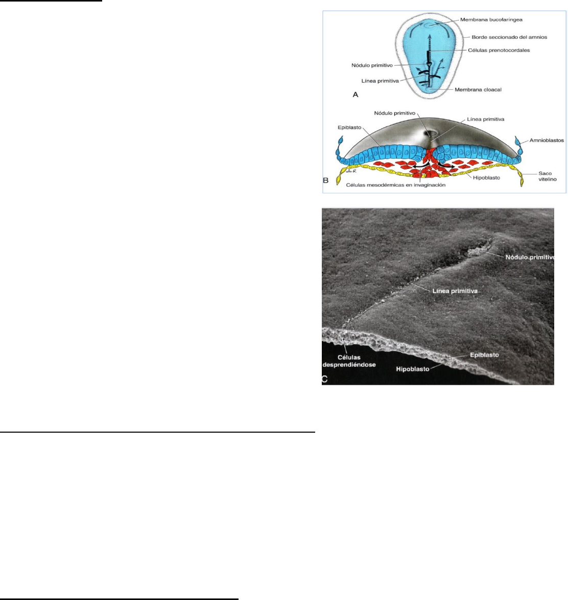 3° semana – gastrulación • Lugar: epiblasto • Resulta en: embrión trilaminar plano, formado por las tres capas germinales. • Comienza con la aparición de la línea primitiva en la superficie dorsal del epiblasto. LÍNEA PRIMITIVA • Condensación celular longitudinal en la línea media que procede del epiblasto en la región posterior del embrión, a través una inducción ejercida por parte de las células situadas en el borde del disco embrionario. • Al principio tiene una forma triangular, pero luego se torna lineal y se alarga debido a redistribuciones celulares internas → movimientos de extensión convergente • Cuando las células del epiblasto comienzan a migrar y alcanzan la línea primitiva, cambian de forma y pasan a través de ella para situarse por debajo del epiblasto. • Cuando estas células migran a través de la línea primitiva comienza a formarse un surco llamado surco primitivo a lo largo de la línea primitiva. • En el extremo cefálico de la línea primitiva se encuentra un pequeño cúmulo de células que recibe el nombre de nódulo primitivo o nódulo de Hensen. • El nódulo de Hensen es el área a través de la cual las células epiblásticas en migración se dirigen para formar una estructura redondeada con forma de cordón y formada por células mesenquimáticas denominada notocorda y un grupo de células anterior a la notocorda llamado placa precordal. DEPUES DE LA FORMACION DE LA LINEA PRIMITIVA • La mayoría de las células que mígran a través de ella se desprenden del epiblasto y se ubican entre el epiblasto y el hipoblasto, formando el mesodermo • Algunas desplazan el hipoblasto y forman el endodermo • Las células que quedaron en el epiblasto contituyen el ectodermo • Las céluas en ellas generan a todos los tejido y órganos • A medida que las células desplazan entre las capas del epiblasto y del hipoblasto, comienzan a expandirse lateral y cranealmente; gradualmente migran mas allá del margen del disco embrionário, entrando en contato con el mesodermo extraembrionário; En dirección cefálica, pasan a ambos lados de la placa precordal PLACA PRECORDAL Y LA NOTOCORDA • Las primeras células que atraviesan el nódulo primitivo forman una masa celular bien definida en la línea media denominada placa precordal, esta placa precordal se encuentra en la región caudal a la membrana bucofaríngea. La generación siguiente de células que atraviesan el nódulo primitivo forma la notocorda. • Primero las células notocordales avanzan hasta la placa precordal, y después se intercalan en el hipoblasto, contituyendo la placa notocordal • Las células de la placa notocordal proliferan y se separan del endodermo, formando la notocorda definitiva, que pasa por debajo del tebo neural y es la base para inducir el esqueleto axial (el extremo craneal se forma primero) • Las células notocordales + prenotocordals se extienden cranealmente hacia la placa precordal, y caudalmente a la fosa primitiva • Conducto neuroentérico: Conecta las cavidades amnióticas y del saco vitelino. En los laterales de la notocorda, están los somitas • Membrana cloacal: Se forma en el extremo caudal del disco. Formada de células ectodérmicas muy adheridas + células endodérmicas sin mesodermo entre ellas. Cuando aparece, la pared posterior del saco vitelino produce el divertículo alantoentérico/ alantoides que se extiende hasta el pedículo de fijación REGRESIÓN DE LA LÍNEA PRIMITIVA • La línea primitiva aparece en extremo caudal del embrión y comienza a extenderse en dirección cefálica hasta el día 18 luego de la fecundación. Posteriormente retrograda nuevamente en dirección caudal, tirando de la notocorda en su regresión. • Si persisten vestigios pueden dar lugar a tumores conocidos como teratomas. FUNCIONES DE LA NOTOCORDA • Estimula la conversión del ectodermo superficial en tejido neural • Transforma ciertas células mesodérmicas de las somitas en cuerpos vertebrales • Favorece las primeras fases del desarrollo del páncreas dorsal • Especifica la identidad de ciertas células (placas del suelo), dentro del sistema nervioso central. TROFOBLASTO • Al inicio de la 3° semana el trofoblasto se caracteriza por las vellosidades primarias, constan de un núcleo citotrofoblastico recubierta por una capa sincitial. • Las células mesodérmicas penetran en el núcleo de las vellosidades primarias creciendo hacia la decidua. → vellosidad secundaria • Al final de la tercera semana, algunas células mesodérmicas empiezan a diferenciarse convirtiéndose en hepatocitos y en pequeños vasos sanguíneos → sistema capilar nervoso. → vellosidad terciaria. Los capilares de ella entran en contacto con los que empiezan a desarrollarse en el mesodermo de la placa coriónica y en el pedículo de fijación, estos vasos establecen contacto con los sistemas circulatorios intraembrionarios para unir la placenta al embrión. • las células citotrofoblásticas de las vellosidades penetran en forma paulatina en el sincitio que las recubre, hasta llegar al endometrio materno. entran en contacto con extensiones similares de los tallos contiguos formando una delga capa citotrofoblástica externa, poco a poco va rodeando la totalidad del trofoblasto y une con firmeza el saco coriónico al tejido endometrial de la madre • vellosidades que se extienden de la placa coriónica a la decidua basal –placa decidual: parte del endometrio donde se formará la placenta, reciben el nombre de vellosidades de anclaje o troncales • vellosidades que se ramifican de los lados de las troncales = vellosidades libres • la cavidad coriónica se alarga y en el día 19 o 20 el embrión se une a su capa trofoblástico mediante un pedículo de fijación, este se transforma en el cordon umbilical.