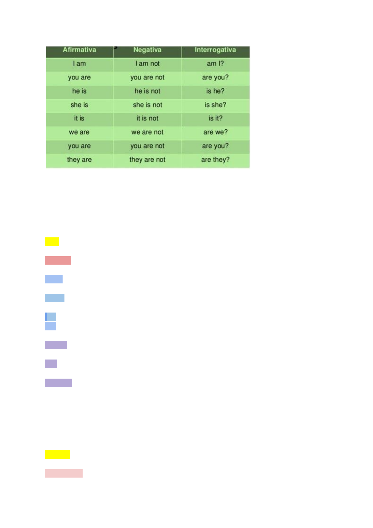 VERBO TO BE- FRASES AFIRMATIVAS, NEGATIVAS E INTERROGATIVAS Afirmative I am a good boy (Eu sou um menino bom) You are a beautiful woman (Você é uma mulher linda) He is a smart man (Ele é um homem inteligente) She is a lazy girl (Ela é uma menina preguiçosa) It is a small pencil (é um lápis pequeno) → para coisa It is a big dog (é um cachorro grande) → para um animal We are good students (Nós somos estudantes bons) You (já tem ali) They are very fast *Resumo: eu só vou repetir o I am, you are e etc normalmente, sem colocar algo depois na frase Negative I am not a good boy (Eu não sou um menino bom) You are not a beautiful woman (Você não é uma mulher linda) He is not a smart man (Ele não é um homem inteligente) She is not a lazy girl (Ela não é uma garota preguiçosa) It is not a small pencil (Não é um lápis pequeno) We are not good students (Nós não somos estudantes bons) You (já tem ali) They are not very fast. (Eles não são muito rápidos) *DIca: só adicionar o NOT após cada um Exemplo: You are a beautiful woman → You are not a beautiful woman (YOU ARE+ NOT) Resumo: I am + not You are + not He is + not She is + not It is + not We are + not You are já tem They are + not *obs: o primeiro YOU faz parte da segunda pessoa do singular, e o segundo YOU parte do plural, por isso estou colocando que já tem mas não muda nada, é só pra você conseguir entender mesmo Interrogativa Am I a good boy? Eu sou um bom menino? Are you a beautiful woman? Você é uma mulher linda? Is he a smart man? Ele é um homem inteligente? Is she a lazy girl? Ela é uma menina preguiçosa? Is it a small pencil? é um lápis pequeno? Are we good students? Nós somos bons estudantes? You já foi Are they very fast? Eles são muito rápidos? *Dica: é só invertermos os pronomes pra fazermos as perguntas Exemplo: I am a good boy (está na afirmativa) O AM troca de lugar com o I → Am I a good boy?