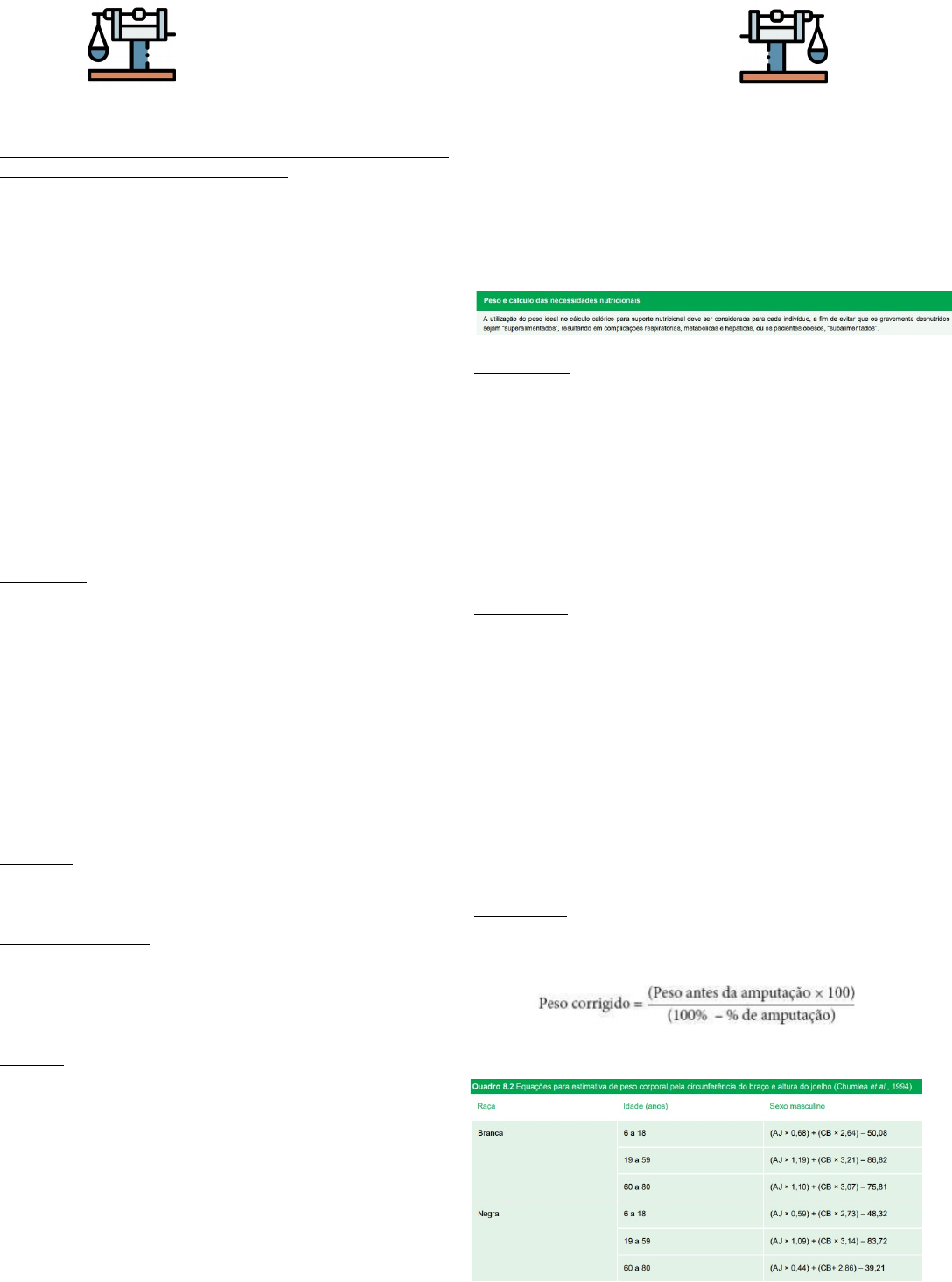 Medidas Antropométricas (IC PRÁTICA) Giovanna Gabriele As medidas antropométricas incluem peso, altura/estatura, envergadura (distância pubovértice e puboplantar), índice de massa corporal (IMC), circunferências da cintura e do abdome e circunferência da panturrilha. PESO O peso corporal é a soma de todos os componentes da composição corporal: água e tecidos adiposo, muscular e ósseo. Sua avaliação é útil para determinar e monitorar o estado nutricional e a reserva de energia. O peso sofre variações desde o nascimento. Em geral, a criança dobra de peso entre o 4 o e o 5 o mês, triplica com 1 ano de idade e quadruplica aos 2 anos. Do 2 o ano até a puberdade apresenta um ganho de peso de 2 a 5,5 kg/ano (ver Capítulo 179, Semiologia da Infância, Capítulo 180, Semiologia da Adolescência, e Capítulo 181, Semiologia do Idoso). Para avaliação do peso, utiliza-se a balança mecânica, tipo plataforma, ou a balança digital, sendo necessário que esteja sempre calibrada. Para condições especiais, como recém-nascidos, há balanças próprias (ver Capítulo 179, Semiologia da Infância), ou no caso de pacientes impossibilitados de deambular, a cama-balança. Além disso, o peso costuma ser interpretado por meio de gráficos e tabelas construídos em estudos populacionais ou por equações preditivas. SEMIOTÉCNICA. O paciente deve ser pesado descalço, com a menor quantidade de roupa possível, posicionado no centro da balança, com os braços ao longo do corpo. A leitura do peso deve ser realizada com o avaliador à frente da balança e à esquerda do paciente. Em pacientes incapacitados de deambular ou de ficar em posição ortostática, o peso pode ser aferido em cama-balança ou em balança para pesagem em leito, não muito usada devido ao alto custo. Nesses casos, é necessário ressaltar que algumas variáveis, tais como tipo do colchão (casca de ovo ou pneumático), coxim, lençóis, cobertores, travesseiros, hastes para soro e medicamentos, bomba de infusão, bolsa para coleta de urina, podem interferir. Se possível, a fim de se evitar um peso superestimado, considerar apenas o peso da cama, contendo um colchão comum, um travesseiro, um lençol e uma fronha. A seguir são descritos os tipos de peso que podem ser utilizados. PESO ATUAL Peso encontrado no momento da pesagem. PESO USUAL OU HABITUAL Utilizado como referência na avaliação das mudanças recentes de peso e em casos em que não há possibilidade de se determinar o peso atual. Em geral, considera-se o peso que se mantém por maior período de tempo. PESO IDEAL O peso ideal é calculado levando-se em consideração alguns parâmetros, tais como idade, biotipo, sexo e altura. Mesmo levando em conta todos estes parâmetros, o peso ideal pode variar 10% para baixo ou para cima do peso teórico, obtido em estudos populacionais. Nos casos extremos de desnutrição, é aconselhável a utilização do peso ideal ou atual estimado, enquanto nos obesos mórbidos, o peso ideal deve ter o seu valor ajustado. O peso ideal pode ser calculado a partir do IMC (ver Avaliação do estado de nutrição), pela seguinte fórmula: Peso ideal = Altura² × IMC médio (ver tópico Índice de massa corporal, adiante) O IMC considerado ideal para homens é 22 kg/m² e para mulheres, 21 kg/m². Cumpre fazer uma ressalva em relação ao peso ideal, pois sua utilização é criticável quando se trata de indivíduos dentro da faixa normal (IMC entre 18,5 e 24,9 kg/m 2). Isto porque deve-se respeitar o biotipo e as características individuais do paciente, sem estabelecer metas que podem levar a exageros e transtornos alimentares como bulimia e anorexia. PESO AJUSTADO É o peso estimado a partir do peso atual (PA) e do peso ideal (PI). É utilizado para fazer prescrições de dietas em pacientes ambulatoriais ou para suporte nutricional em pacientes hospitalizados. As seguintes fórmulas podem ser utilizadas a fim de se estimar o peso ajustado para obesos (IMC > 30 kg/m²) e desnutridos (IMC < 18,5 kg/m²): Obesos: (PA PI) × 0,25 + PI – Desnutridos: (PI PA) × 0,25 + PA – PESO ESTIMADO É o peso obtido a partir de fórmulas ou tabelas. É utilizado quando não há possibilidade de se obter o peso usual ou quando não se pode pesar o indivíduo. A fórmula mais aplicada é a que utiliza a circunferência do braço e a altura do joelho (ver Altura do joelho e Quadro 8.2). A circunferência do braço é aferida no ponto médio entre o acrômio e o olécrano, com o braço estendido lateralmente ao tronco. Para encontrar o ponto médio, o cotovelo deve estar fletido em 90°. PESO SECO É o peso descontado de edema e ascite. O valor a ser descontado depende da localização e da intensidade do edema (Quadros 8.3 a 8.5). PESO CORRIGIDO Deve ser utilizado em pacientes amputados (Quadro 8.6). Fórmula utilizada para se estimar o peso corrigido: ALT URA/ESTAT URA O crescimento linear é obtido pela aferição da altura ou estatura. Existem diferentes métodos para se determinar a altura. SEMIOTÉCNICA. Na criança, recomenda-se medir a altura na posição deitada, utilizando-se fita métrica ou régua graduada (ver Capítulo 179, Semiologia da Infância). Em pacientes que são capazes de ficar em posição ortostática, a medida é realizada em balança com estadiômetro ou fita métrica inextensível com precisão de 0,1 cm, afixada em superfície lisa, vertical e sem rodapé. Para uma medida precisa, é importante que cinco pontos anatômicos estejam próximos à parede ou ao estadiômetro: calcanhares, panturrilhas, glúteos, escápulas e ombros. Os joelhos devem estar esticados, os pés juntos e os braços estendidos ao longo do corpo. A cabeça deve estar erguida, formando um ângulo de 90° com o solo, e os olhos mirando um plano horizontal à frente. Em seguida, o estadiômetro é baixado até que encoste na cabeça, com pressão suficiente apenas para comprimir o cabelo. O cabelo não pode estar preso por tiaras ou outros