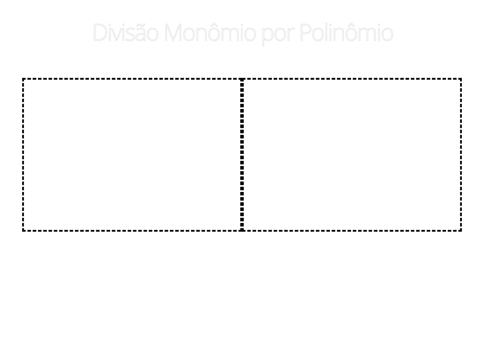 Polinômio é uma expressão algébrica racional e inteira, por exemplo: x2y 3x – 2y x + y5 + ab • Monômio é um tipo de polinômio que possui apenas um termo, ou seja, que possui apenas coeficiente e parte literal. Por exemplo: a2 → 1 é o coeficiente e a2 parte literal. 3x2y → 3 é o coeficiente e x2y parte literal. -5xy6 → -5 é o coeficiente e xy6 parte literal. Divisão Monômio por PolinômioDivisão Monômio por Polinômio Divisão de monômio por monômio Ao resolvermos uma divisão onde o dividendo e o divisor são monômios devemos seguir a regra: dividimos coeficiente com coeficiente e parte literal com parte literal. Exemplos: 6x3 : 3x = 6 . x3 = 2x2 3 x2 Observação: ao dividirmos as partes literais temos que estar atentos à propriedade que diz que base igual na divisão, repete a base e subtrai os expoentes. (10a3b3 + 8ab2) : (2ab2) O dividendo 10a3b3 + 8ab2 é formado por dois monômios. Dessa forma, o divisor 2ab2, que é um monômio, irá dividir cada um deles, veja: (10a3b3 + 8ab2) : (2ab2) Assim, transformamos a divisão de polinômio por monômio em duas divisões de monômio por monômio. Portanto, para concluir essa divisão é preciso dividir coeficiente por coeficiente e parte literal por parte literal. Portanto, (10a3b3 + 8ab2) : (2ab2) = 5a2b + 4 Exemplo: (9x2y3 – 6x3y2 – xy) : (3x2y) O dividendo 9x2y3 – 6x3y2 – xy é formado por três monômios. Dessa forma, o divisor 3x2y, que é um monômio irá dividir cada um deles, veja: Assim, transformamos a divisão de polinômio por monômio em três divisões de monômio por monômio. Portanto, para concluir essa divisão é preciso dividir coeficiente por coeficiente e parte literal por parte literal.