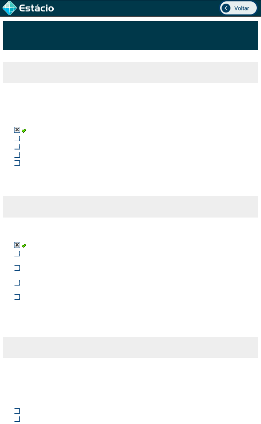 Disc.: FUNDAMENTOS DE REDES DE COMPUTADORES Acertos: 10,0 de 10,0 27/04/2020 1a Questão Acerto: 1,0 / 1,0 Como definição, rede de computadores consistem em dois ou mais computadores interligados compartilhando recursos que podem ser classificadas de acordo com alguns critérios, dentre eles a abrangência geográfica. Qual das opções abaixo faz referência a essa classificação Lan, Man, Wan Estrela, Barramento e Malha Aberta, fechada ou mista Guiadas e não guiadas Cabeadas ou sem fio Respondido em 27/04/2020 23:00:26 2a Questão Acerto: 1,0 / 1,0 As opções abaixo listam vantagens do modelo OSI, EXCETO: Impedem o desenvolvimento de novas tecnologias e protocolos de rede Padroniza os componentes de rede, permitindo o desenvolvimento e o suporte por parte de vários fabricantes. Possibilita a comunicação entre tipos diferentes de hardware e de software de rede. Evita que as modificações em uma camada afetem as outras, possibilitando maior rapidez no seu desenvolvimento. Decompõe as comunicações de rede em partes menores e mais simples, facilitando sua aprendizagem e compreensão. Respondido em 27/04/2020 23:01:27 3a Questão Acerto: 1,0 / 1,0 Na conexão entre dois dispositivos a forma de utilização do meio físico que conecta estações dá origem a algumas classificações sobre a comunicação no enlace: Quando o enlace é utilizado nos dois possíveis sentidos de transmissão simultaneamente como por exemplo a telefonia fixa e celular, redes cabeadas com switch, temos uma comunicação: Simplex Duplex Half-duplex Full-duplex Cruzada Respondido em 27/04/2020 23:02:21 4a Questão Acerto: 1,0 / 1,0 Cada nó em uma rede IP tem um endereço MAC e um endereço IP. Para enviar dados, o nó deve usar esses dois endereços. O quadro tem seu cabeçalho montado utilizando seu próprio endereço MAC como origem. Para o endereço de destino é conhecido apenas o IP de destino do pacote. Qual o protocolo que realiza o mapeamento entre IP e MAC de destino? ARP DHCP IPCONFIG DNS Netstat Respondido em 27/04/2020 23:02:54 5a Questão Acerto: 1,0 / 1,0 Para encontrar o servidor de arquivos na rede, João perguntou ao seu suporte de rede qual era o endereço IP do servidor. Qual das opções abaixo representa um possível endereço IP para o servidor de arquivos? GG568934FH2. www.pax.com.br. 02-34-98-89-78-00. axe@pax.com.br. 10.0.1.7. Respondido em 27/04/2020 23:03:38 6a Questão Acerto: 1,0 / 1,0 Os tipos de fluxos de transmissão são a forma com a qual o meio físico é utilizado para fazer a comunicação entre dois equipamentos. Marque a opção que informa os tipos corretos existentes: full duplex, half simplex e duplex total flex, simplex e half-simplex duplex, simplex e total full duplex, half duplex e simplex full, half simplex e duplex Respondido em 27/04/2020 23:04:22 7a Questão Acerto: 1,0 / 1,0 Maria quer enviar um e-mail para João e para isso precisa utilizar o protocolo TCP/IP. Neste caso quais os protocolos estarão envolvidos nesta comunicação? DNS e TCP HTTP e TCP SMTP e TCP SMTP e UDP POP e ICMP Respondido em 27/04/2020 23:05:06 8a Questão Acerto: 1,0 / 1,0 Podemos obter melhorias na taxa transmissão de dados em uma rede local Ethernet 10Base-T, substituindo um hub por um: Modem assíncrono Switch Concentrador passivo Adaptador multisserial Modem síncrono Respondido em 27/04/2020 23:06:28 9a Questão Acerto: 1,0 / 1,0 Cada computador, celular, Ipad conectado em uma rede tem o seu endereço físico (MAC) e também um endereço IP. Qual protocolo tem a função de entregar IP automaticamente em uma rede. Assinale a alternativa correta: DNS FTP DHCP HTTP SMTP Respondido em 27/04/2020 23:06:43 10a Questão Acerto: 1,0 / 1,0 As opções abaixo se referem a características das Redes sem fio IEEE 802-11 (WiFi), EXCETO: As redes WiFi podem sofrer interferência de telefones sem fio, lâmpadas fluorescentes e. fornos micro-ondas entre outros equipamentos. Por não exigir acesso físico ao meio, os dispositivos e usuários que não são autorizados a acessar a rede terão acesso à transmissão. Por esta razão a segurança de rede é preocupação constante do administrador da rede. O meio físico sem fio transmite sinais eletromagnéticos nas frequências de rádio que representam os dígitos binários de comunicação de dados. Como um meio de rede, o sem fio não é restrito aos condutores ou caminhos, como é o meio físico de cobre. As redes Wifi apresentam grande dificuldade para serem instaladas quando comparadas às redes cabeadas tradicionais As tecnologias de comunicação de dados sem fio funcionam bem em ambientes abertos, entretanto em ambientes fechados, tem sua cobertura prejudicada por determinados materiais de construção utilizados em prédios e estruturas. Respondido em 27/04/2020 23:14:24