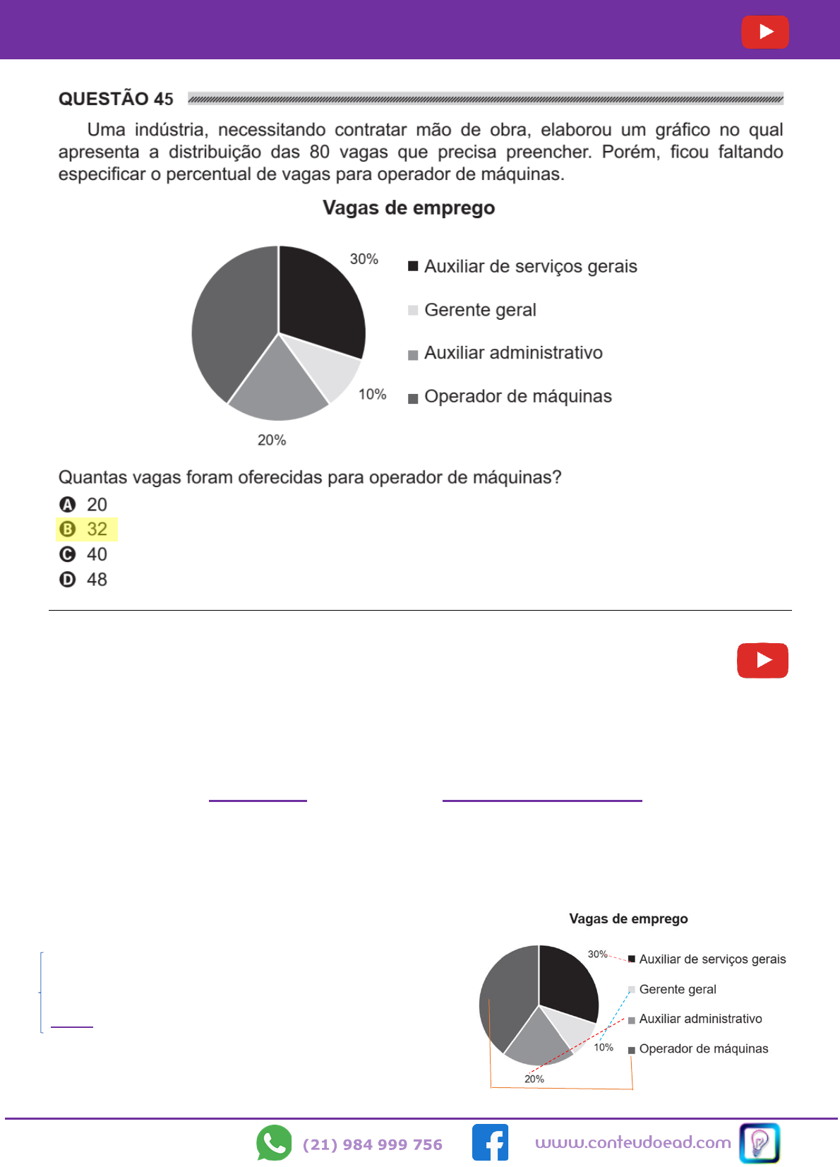 Profa Roberta Mendiondo PROVA ENCCEJA 2019 – ENSINO FUNDAMENTAL Gabarito: B Resolução Assista a videoaula clicando no botão → Para resolver essa questão é preciso saber que: em todo o gráfico de setores, a soma de todos os percentuais representados nos setores (fatias) é igual a 100%. A questão pede a quantidade de vagas para Operador de máquinas, mas o percentual das vagas para operador de máquinas que está faltando, então, primeiro temos que descobrir esse percentual. Nesse caso, temos 30% das vagas para Auxiliar de serviços gerais 10% das vagas para Gerente geral 20% das vagas para Auxiliar administrativo 60% é a soma do percentual de vagas para esses 3 cargos % ? https://www.youtube.com/channel/UCIbwNkKaQBzSXKrprTxxkmg?sub_confirmation=1 https://www.conteudoead.com https://www.facebook.com/conteudoead https://wa.me/message/MGTN647SFM6VC1 https://youtu.be/lLjw1tC3rdQ Profa Roberta Mendiondo Como o total de todas as fatias (soma do percentual de todos os cargos) deve ser 100%, o setor que não apresenta percentual representa as vagas para Operador de máquinas, que será de: 100% - 60% (soma dos outros cargos) = 40% é o percentual de vagas para Operador de máquinas. A questão pede QUANTIDADE de vagas para operador, então temos que saber quanto é 40% de 80 vagas. 𝟒𝟎 𝟏𝟎𝟎 𝒅𝒆 𝟖𝟎 = 𝟒𝟎 𝟏𝟎𝟎 × 𝟖𝟎 = 𝟑𝟐𝟎𝟎 𝟏𝟎𝟎 = 𝟑𝟐 Portanto, são 32 vagas para operador de máquinas. Alternativa correta, letra B. https://www.youtube.com/channel/UCIbwNkKaQBzSXKrprTxxkmg?sub_confirmation=1 https://www.conteudoead.com https://www.facebook.com/conteudoead https://wa.me/message/MGTN647SFM6VC1