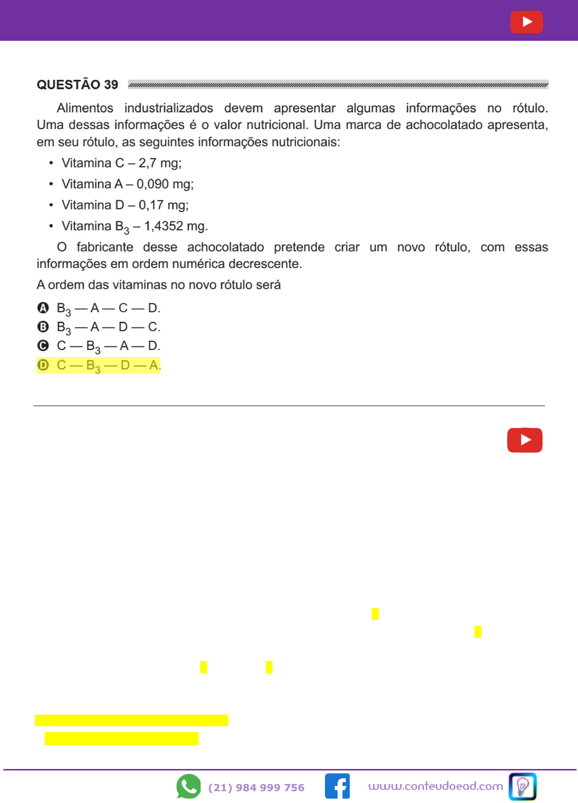 Profa Roberta Mendiondo PROVA ENCCEJA 2019 – ENSINO FUNDAMENTAL Gabarito: D Resolução Assista a videoaula clicando no botão → Para decidir a ordem decrescente na qual as vitaminas devem aparecer no rótulo, temos que colocar em ordem decrescente as quantidades de vitaminas. Cuidado! Para saber quais números são maiores, faça uma lista com os números, posicionando vírgula embaixo de vírgula, veja: 2,7 mg 0,090 mg 0,17 mg 1,4352 mg O maior número é o que tem o maior valor à esquerda da vírgula, o 2,7 mg O segundo maior número é o que tem o segundo maior número à esquerda da vírgula, o 1,4352 mg Os outros dois números apresentam o zero à esquerda da vírgula, então verificamos a primeira casa decimal (à direita da vírgula). 0,090 mg e 0,17 mg, como 1 é maior que zero, 0,17 mg é maior que 0,090. Portanto, a ordem decrescente de valores das informações nutricionais é 2,7 mg; 1,4352mg; 0,17 mg; 0,090mg, que corresponde à ordem de vitaminas: C - B3 - D - A . Alternativa correta, letra D. https://www.youtube.com/channel/UCIbwNkKaQBzSXKrprTxxkmg?sub_confirmation=1 https://www.conteudoead.com https://www.facebook.com/conteudoead https://wa.me/message/MGTN647SFM6VC1 https://youtu.be/vcG5JitKCCo