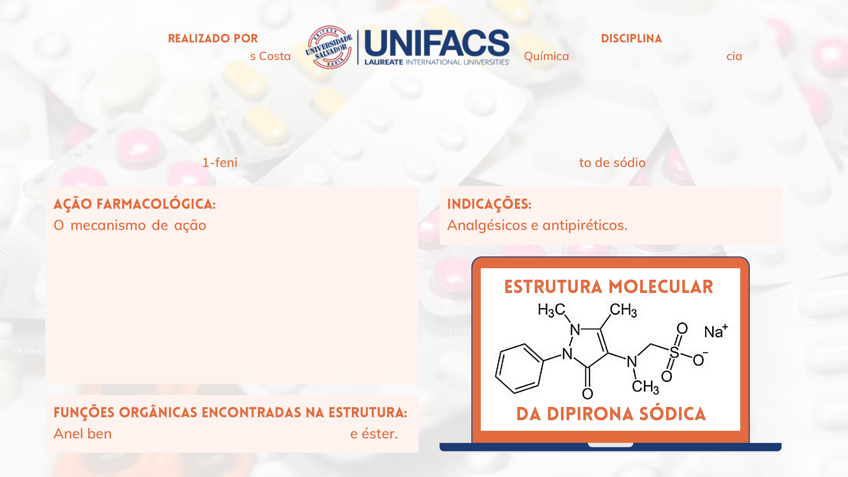 Dipirona Sódica Ação farmacológica: O mecanismo de ação da dipirona é via inibição da síntese de prostaglandina. A dipirona tem demonstrado inibir a ciclooxigenase, síntese do tromboxano, a agregação plaquetária induzida pelo ácido araquidônico e a síntese total de prostaglandina E1 e E2. A ação da droga pode ser tanto central como periférica. Há evidências de que a ação central da dipirona no hipotálamo reduz a febre. realizado por Ingrid Dantas Passos Costa Disciplina Química Orgânica Aplicada À Farmácia Funções orgânicas encontradas na estrutura: Anel benzênico, metil, amina, alcano, cetona e éster. Indicações: Analgésicos e antipiréticos. ESTRUTURA MOLECULAR DA DIPIRONA SÓDICA 1-fenil-2,3-dimetil-5-pirazolona-4-metilaminometanossulfonato de sódio