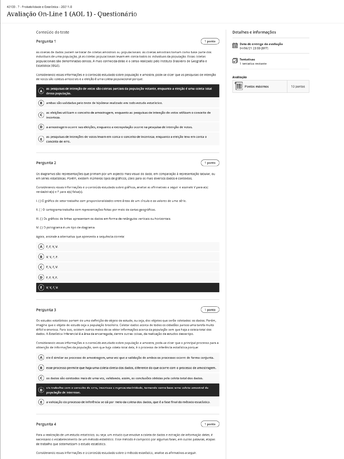 42133 . 7 - Probabilidade e Estatística - 20211.B Avaliação On-Line 1 (AOL 1) - Questionário Conteúdo do teste Detalhes e informações Pergunta 1 1 ponto Data de entrega da avaliação 04/06/21 23:59 (BRT) As coletas de dados podem se tratar de coletas amostrais ou populacionais. As coletas amostrais tomam como base parte dos indivíduos de uma população, já as coletas populacionais levam em conta todos os indivíduos da população. Essas coletas Tentativas populacionais são denominadas censos. A mais conhecida delas é o censo realizado pelo Instituto Brasileiro de Geografia e 1 tentativa restante Estatística (IBGE). Considerando essas informações e o conteúdo estudado sobre população e amostra, pode-se dizer que as pesquisas de intenção Avaliação de votos são coletas amostrais e a eleição é uma coleta populacional porque: Pontos máximos 10 pontos as pesquisas de intenção de votos são coletas parciais da população votante, enquanto a eleição é uma coleta total dessa população. ambas são validadas pelo teste de hipótese realizado em todo estudo estatístico. as eleições utilizam o conceito de amostragem, enquanto as pesquisas de intenção de votos utilizam o conceito de incerteza. a amostragem ocorre nas eleições, enquanto a extrapolação ocorre na pesquisa de intenção de votos. as pesquisas de intenções de votos levam em conta o conceito de incerteza, enquanto a eleição leva em conta o conceito de erro. Pergunta 2 1 ponto Os diagramas são representações que primam por um aspecto mais visual do dado, em comparação à representação tabular, ou em séries estatísticas. Porém, existem inúmeros tipos de gráficos, úteis para os mais diversos dados e contextos. Considerando essas informações e o conteúdo estudado sobre gráficos, analise as afirmativas a seguir e assinale V para a(s) verdadeira(s) e F para a(s) falsa(s). I. ( ) O gráfico de setor trabalha com proporcionalidades entre áreas de um círculo e os valores de uma série. II. ( ) O cartograma trabalha com representações feitas por meio de cartas geográficas. III. ( ) Os gráficos de linhas apresentam os dados em forma de retângulos verticais ou horizontais. IV. ( ) O pictograma é um tipo de diagrama. Agora, assinale a alternativa que apresenta a sequência correta: F, F, V, V. V, V, F, F. F, V, F, V. F, F, V, F. V, V, F, V. Pergunta 3 1 ponto Os estudos estatísticos partem de uma definição do objeto de estudo, ou seja, dos objetos que serão coletados: os dados. Porém, imagine que o objeto de estudo seja a população brasileira. Coletar dados acerca de todos os cidadãos parece uma tarefa muito difícil e onerosa. Para isso, existem outros meios de se obter informações acerca da população sem que haja a coleta total dos dados. A Estatística Inferencial é a área da encarregada, dentre outras coisas, da realização de estudos desse tipo. Considerando essas informações e o conteúdo estudado sobre população e amostra, pode-se dizer que o principal processo para a obtenção de informações da população, sem que haja coleta total dela, é o processo de inferência estatística porque: ele é similar ao processo de amostragem, uma vez que a validação de ambos os processos ocorre de forma conjunta. esse processo permite que haja uma coleta direta dos dados, diferente do que ocorre com o processo de amostragem. os dados são coletados mais de uma vez, validando, assim, as conclusões obtidas pela coleta total dos dados. ele trabalha com o conceito de erro, incerteza e representatividade, tomando como base uma coleta amostral da população de interesse. a validação do processo de inferência se dá por meio da coleta dos dados, que é a fase final do método estatístico. Pergunta 4 1 ponto Para a realização de um estudo estatístico, ou seja, um estudo que envolve a coleta de dados e extração de informação deles, é necessário o estabelecimento de um método estatístico. Esse método é composto por algumas fases, em outras palavras, etapas de trabalho que sistematizam o estudo estatístico. Considerando essas informações e o conteúdo estudado sobre o método estatístico, analise as afirmativas a seguir. I. A generalização dos dados é uma das etapas iniciais desse método. II. A apresentação dos dados ocorre antes do agrupamento e da contagem deles. III. A definição do tipo de coleta e do tipo de dado é realizada antes da análise estatística. IV. Gráficos e tabelas são elementos que compõem a etapa de apresentação do método estatístico. Está correto apenas o que se afirma em: I e II. III e IV. I, II e IV. I e III. I, III e IV. Pergunta 5 1 ponto Uma das etapas do método estatístico é a apresentação dos dados, sejam eles obtidos antes ou posteriormente à fase analítica. Essa apresentação é feita por meio de gráficos e tabelas, portanto, compreendê-los e diferenciá-los é fundamental para a execução do método estatístico. Considerando essas informações e o conteúdo estudado sobre séries estatísticas e gráficos, analise as afirmativas a seguir e assinale V para a(s) verdadeira(s) e F para a(s) falsa(s). I. ( ) A série estatística é definida em termos de tabelas. II. ( ) Gráficos de linha e gráficos em barras são representações definidas como cartogramas. III. ( ) Diagramas são representações tabulares. IV. ( ) Os gráficos de setores são baseados em círculos, nos quais as áreas devem ser proporcionais aos valores da série. Agora, assinale a alternativa que apresenta a sequência correta: F, F, V, F F, V, F, V. V, F, F, V. V, F, V, V. V, V, F, F. Pergunta 6 1 ponto As apresentações dos dados em estatística comumente são realizadas por meio de gráficos e tabelas. Esses elementos, porém, exigem dos leitores um processo interpretativo, ou seja, deve-se compreender as estruturas de cada tipo de representação para que se possa ler adequadamente aquilo que está sendo apresentado.