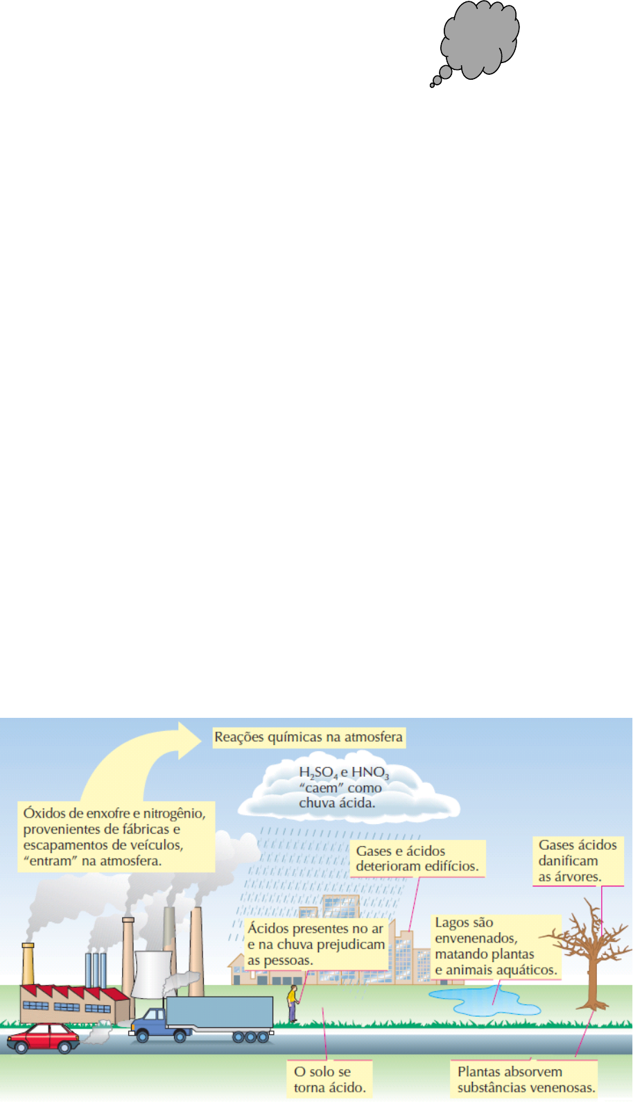 Chuva Acida A chuva ácida é a precipitação com a presença de ácido sulfúrico, ácido nítrico e nitroso, resultantes de reações químicas que ocorrem na atmosfera. Todas as chuvas são ácidas, mesmo em ambientes sem poluição. Porém, as chuvas tornam-se um problema ambiental quando o seu pH é abaixo de 4,5. Como se forma a chuva ácida? A chuva ácida pode ter origem natural como os casos de erupção vulcânica, ou podem ser de origem antrópica que é causada pelo homem, como os casos de queima de combustíveis fósseis. Os óxidos de enxofre (SO2 e SO3) e de nitrogênio (N2O, NO e NO2) são os principais componentes da chuva ácida. Ao reagirem com as gotas de água da atmosfera, formam o ácido sulfúrico (H2SO4) e o ácido nítrico (HNO3). Juntos, esses dois ácidos provocam o aumento da acidez da água da chuva. Na presença desses ácidos, o pH da água da chuva pode chegar entre 4 a 2, valores extremamente ácidos. O que causa? As atividades humanas são as principais responsáveis por esse fenômeno da chuva ácida. A liberação de gases em decorrência do uso de combustíveis fósseis é a principal responsável pela formação de chuvas ácidas - esses gases são liberados dos transportes, termoelétricas, indústrias e etc. Consequências As consequências da chuva ácida são a destruição da cobertura vegetal, acidificação dos solos e das águas de rios e lagos. Quando a acidificação atinge o solo e as águas de rios e lagos, os seres vivos que habitam esses locais são afetados. A água e o solo se tornam impróprios para abrigar alguns organismos, levando-os a morte. A chuva ácida também pode causar a corrosão de mármores e calcários e a oxidação de metais em monumentos históricos, como prédios e estátuas.