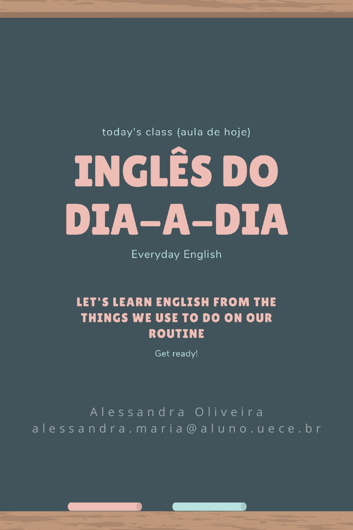 A l e s s a n d r a O l i v e i r a a l e s s a n d r a . m a r i a @ a l u n o . u e c e . b r VOCÊ Quais dessas frases M A I S U S A N A S U A R O T I N A ? WRITE DOWN THE ANSWER ON YOUR NOTEBOOK (ESCREVA NO SEU CADERNO AS RESPOSTAS) Everyday English AGO RA . . . E s c o l h a u m d e s s e s A d j e c t i v e s ( A d j e t i v o s ) p a r a d e s c r e v e r s u a M o o d ( E s t a d o d e H u m o r ) d e h o j e o que você está sentin do hoje COMO PRIMEIRA ATIVIDADE .. . COMPLETE A FRASE:"I'M FEELING ________ TODAY" Let's talk about the day! �� Escreva sobre a(s) sua(s) parte(s) favorita do dia usando essa expressões que indicam opinião Por exemplo: "I think that afternoon is my favorite part of the day. It's so beautiful! � " Expressão de opinião + parte do dia + is my favorite part of the day + (opcional) elogio Elogios: It's amazing! It's pretty! It's wonderful! It's very nice! fórmula: Pesquise sobre, ou traduza do português para o inglês, elogios que você conhece e escreva no caderno todo eles para próxima aula! See ya! Bons estudos 😘
