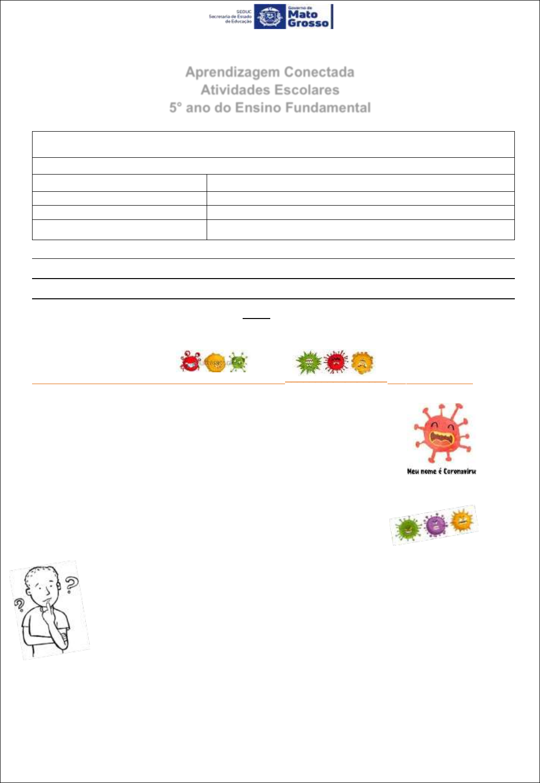 1 _________________ Aprendizagem Conectada Atividades Escolares 5° ano do Ensino Fundamental 1. Corona... o quê? Secretaria Adjunta de Gestão Educacional – SAGE Carga horária mensal 115 horas - Unidocência Língua Portuguesa Códigos das Habilidades Objetos de conhecimentos EF05LP16 Compreensão em leitura EF35LP16 Forma de composição dos textos EF15LP03 Estratégia de leitura Nome da Escola: Nome do Professor: Nome do estudante: Período: vespertino Turma 5° ano Este ano iniciaos as atividades escolares de um jeito diferente por causa da pandemia do novo Coronavírus, que tem afetado o Brasil e o mundo. Nesses dias, você está tendo muito tempo para brincar com sua família e também para aprender, não é mesmo? Falando nisso, o que acha de aprender um pouco mais sobre esse tal de Coronavírus? Você já ouviu falar sobre ele? Vamos aprender juntos? Afinal, o que é esse novo Coronavírus e o que ele faz? O novo Coronavírus é uma família de vírus que causa infecções respiratórias. O novo agente do Coronavírus foi descoberto em 31/12/2019 na China, e provoca a doença chamada de coronavírus (COVID-19). Essa doença pode causar infecção nos pulmões. Nos casos mais leves parece um resfriado comum ou uma gripe leve. Os primeiros sintomas da doença podem aparecer entre 2 a 14 dias desde a contaminação pelo vírus, esse tempo é chamado de período de incubação. 2 Fiquei em dúvida, quais são as formas de contágio do novo Coronavírus? Secretaria Adjunta de Gestão Educacional – SAGE 2. Veja quais são os principais sintomas do novo Coronavírus. Fonte: O liberal (2020). 3. Vamos ver agora quais são as formas de contágio Já sabemos! O_lh_e no quadro abaixo FORMAS DE CONTÁGIO Contato pessoal próximo, como toque ou aperto de mão Contato com objetos ou superfícies contaminadas, seguido de contato com a boca, nariz ou olhos. Gotículas de saliva Tosse Espirro catarro 3 __________ Secretaria Adjunta de Gestão Educacional – SAGE 4. As principais formas de prevenção _ Como nunca tivemos contato com o vírus antes, não temos imunidade, por isso, precisamos nos prevenir. Depois de aprender o que é o novo Coronavírus, suas formas de contágio e as principais formas de prevenção, vamos explorar mais esse tema falando sobre as Fake News que circulam nas mídias e plataformas sociais. Desafio de Língua Portuguesa Você já ouviu falar em Fake News? Você sabe o que são? Fake News são notícias falsas que circulam nas mídias e plataformas digitais. É preciso muito cuidado com as informações veiculadas na internet, pois algumas pessoas Agora é hora de agir! Chame sua família e vamos lá. Se liga nas dicas de prevenção! Não compartilhe objetos pessoais Mantenha os ambientes bem ventilados Evite aglomerações se estiver doente Cubra o nariz e a boca ao espirrar ou tossir Lave as mãos com água e sabão ou use álcool em gel F o n te : M in is té ri o d a S a ú d e ( 2 0 2 0 ) 4 Secretaria Adjunta de Gestão Educacional – SAGE mal-intencionadas repassam informações sem comprovar a sua veracidade ou criam notícias sem fundamentos e depois publicam no Facebook, Instagram, Twitter, Whatsapp e demais mídias sociais. Agora que você aprendeu muitas coisas sobre o novo Coronavírus e sabe o que são Fake News, vamos ao jogo de perguntas e respostas. O jogo se chama Fato ou Fake. Convide sua família e vamos lá! 01. Fato ou Fake? Leia as frases abaixo e marque o espaço entre os parênteses com um “X”, identificando: FATO para as alternativas corretas e FAKE para as alternativas erradas. Tenho certeza que você vai ganhar este jogo, só não vale olhar a resposta antes de marcar! Vamos começar? a) Produtos importados da China podem estar contaminados pelo Coronavírus. ( ) FATO ( ) FAKE FAKE! Esta informação não é verdadeira! Não há nenhuma evidência que produtos enviados da China para o Brasil tragam o novo Coronavírus. Os vírus geralmente não sobrevivem muito tempo fora do corpo de outros seres vivos, e o tempo de tráfego destes produtos costuma ser de muitos dias. Além disso, a Anvisa tem monitorado diariamente os portos, aeroportos e fronteiras e emitido alertas sonoros de conscientização para os passageiros. b) Os principais sintomas do novo Coronavírus são: febre, tosse, falta de ar. ( ) FATO ( ) FAKE FATO! Essa notícia é verdadeira. Os sinais e sintomas clínicos do novo Coronavírus são principalmente os respiratórios, semelhantes a um resfriado. d) Chá de abacate com hortelã previne a contaminação pelo Coronavírus. ( ) FATO ( ) FAKE 5 Secretaria Adjunta de Gestão Educacional – SAGE FAKE! Essa notícia é falsa. Até o momento, não há nenhum medicamento, substância, vitamina, alimento específico ou vacina que possa prevenir a infecção pelo novo Coronavírus. e) Lavar as mãos com água e sabão, não compartilhar objetos pessoais e cobrir a boca e o nariz ao espirrar ou tossir pode prevenir a contaminação pelo Coronavírus. ( ) FATO ( ) FAKE FATO! Essas ações são indicadas pelo Ministério da Saúde como uma das principais formas de prevenção do novo Coronavírus. f) Beber água de 15 em 15 minutos cura o Coronavírus. ( ) FATO ( ) FAKE FAKE! Não compartilhe essa mensagem, ela é falsa! Muitas pesquisas estão sendo desenvolvidas para o combate ao Coronavírus (COVID-19), entretanto, até o momento, não há nenhum medicamento, substância, vitamina, alimento específico ou vacina que possa prevenir a infecção pelo Coronavírus (COVID-19). 02. Faça uma pesquisa com os seus familiares sobre as questões abaixo e depois escreva o que eles responderam. a) Quais as consequências das Fake News sobre o novo Coronavírus na saúde das pessoas? b) É importante checar as informações antes de repassá-las? Por que? 6 A notícia é composta por três partes: título, lead e corpo. Nossa, então Fake News é uma mentira! E notícia, o que é mesmo? Fiz algumas pesquisas e vou te mostrar, vem comi