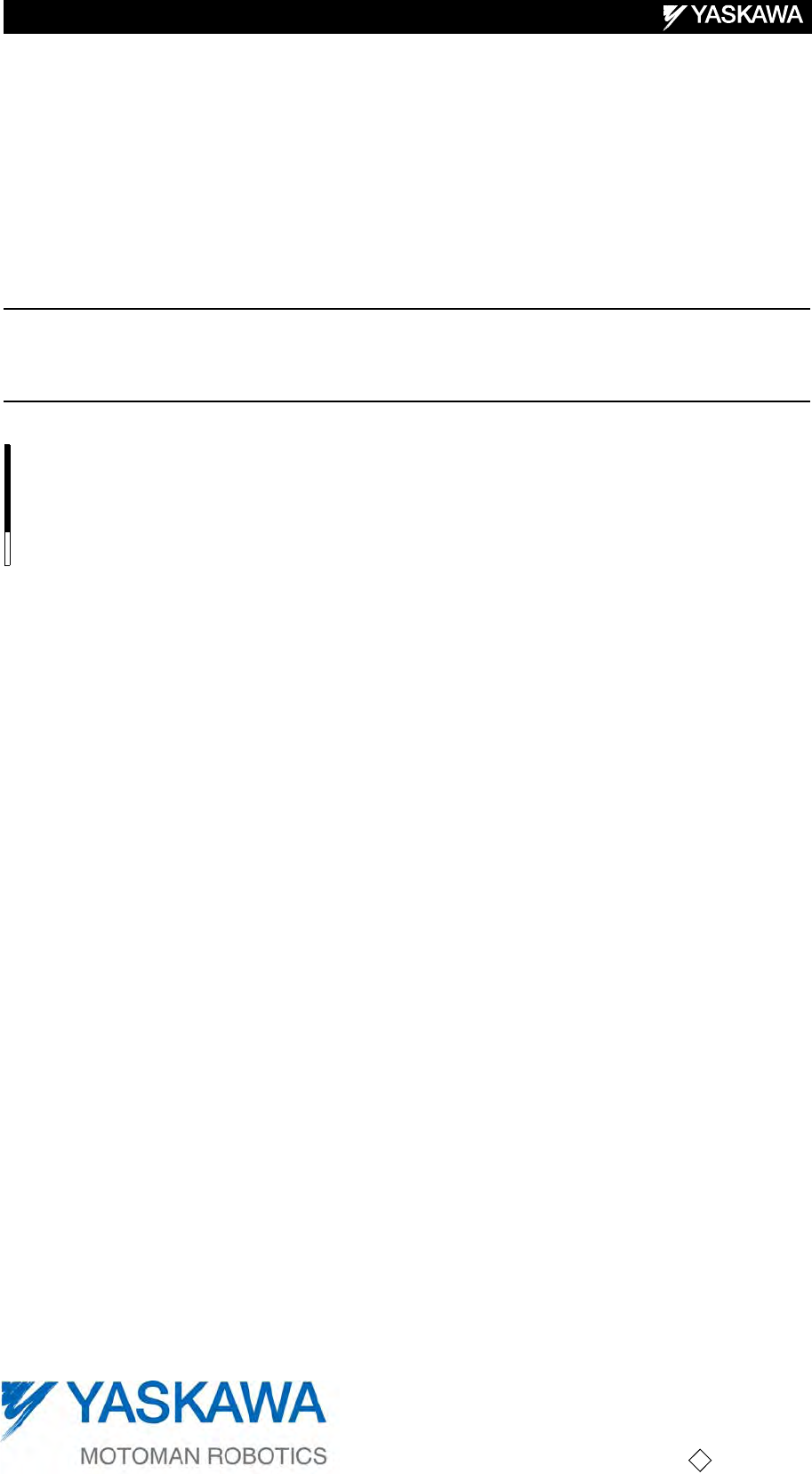DX200 OPTIONS CC-Link COMMUNICATIONS FUNCTION INSTRUCTIONS FOR Q80BD-J61BT11N MADE BY MITSUBISHI ELECTRIC Co., Ltd. Upon receipt of the product and prior to initial operation, read these instructions thoroughly, and retain for future reference. Part Number: 165624-1CD Revision: 1 MOTOMAN INSTRUCTIONS MOTOMAN- INSTRUCTIONS DX200 INSTRUCTIONS DX200 OPERATOR’S MANUAL (for each purpose) DX200 MAINTENANCE MANUAL The DX200 operator’s manual above corresponds to specific usage. Be sure to use the appropriate manual. . MANUAL NO. 1HW1482015 1/48 165624-1CD CC-Link Communications MANDATORY • This manual explains the Q80BD-J61BT11N board (manufactured by Mitsubishi Electric Corporation) of the DX200 system and general operations. Read this manual carefully and be sure to understand its contents before handling the DX200. • General items related to safety are listed in Section 1: Safety of the DX200 Instructions. To ensure correct and safe operation, carefully read the DX200 Instruction before reading this manual. CAUTION • Some drawings in this manual are shown with the protective covers or shields removed for clarity. Be sure all covers and shields are replaced before operating this product. • The drawings and photos in this manual are representative examples and differences may exist between them and the delivered product. • YASKAWA may modify this model without notice when necessary due to product improvements, modifications, or changes in specifications. If such modification is made, the manual number will also be revised. • If your copy of the manual is damaged or lost, contact a YASKAWA representative to order a new copy. The representatives are listed on the back cover. Be sure to tell the representative the manual number listed on the front cover. • YASKAWA is not responsible for incidents arising from unauthorized modification of its products. Unauthorized modification voids your product’s warranty. ii HW1482015 2/48 165624-1CD CC-Link Communications NOTES FOR SAFE OPERATION Read this manual carefully before installation, operation, maintenance, or inspection of the DX200. In this manual, the Notes for Safe Operation are classified as “WARNING”, “CAUTION”, “MANDATORY”,or ”PROHIBITED”. Even items described as “CAUTION” may result in a serious accident in some situations. At any rate, be sure to follow these important items. WARNING Indicates a potentially hazardous situation which, if not avoided, could result in death or serious injury to personnel. CAUTION Indicates a potentially hazardous situation which, if not avoided, could result in minor or moderate injury to personnel and damage to equipment. It may also be used to alert against unsafe practices. MANDATORY Always be sure to follow explicitly the items listed under this heading. PROHIBITED Must never be performed. NOTE To ensure safe and efficient operation at all times, be sure to follow all instructions, even if not designated as “CAUTION” and “WARNING”. PROHIBITED • Do not use or keep the board in the following environmental conditions. – Where exposed to direct sunshine – Where vibration or impact occurs – Where high humidity exists – Where a strong magnetic field exists – Where much dust exists – Where a sudden change in the temperature occurs – Where corrosive gases occur – Where condensation occurs Improper usage of the board may damage the board. iii HW1482015 3/48 165624-1CD CC-Link Communications WARNING • Before operating the manipulator, check that servo power is turned OFF when the emergency stop buttons on the front door of the DX200 and programming pendant are pressed. When the servo power is turned OFF, the SERVO ON LED on the programming pendant is turned OFF. Injury or damage to machinery may result if the emergency stop circuit cannot stop the manipulator during an emergency. The manipulator should not be used if the emergency stop buttons do not function. Figure 1: Emergency Stop Button • Once the emergency stop button is released, clear the cell of all items which could interfere with the operation of the manipulator. Then turn the servo power ON. Injury may result from unintentional or unexpected manipulator motion. Figure 2: Release of Emergency Stop TURN • Observe the following precautions when performing teaching operations within the P-point maximum envelope of the manipulator – View the manipulator from the front whenever possible. – Always follow the predetermined operating procedure. – Keep in mind the emergency response measures against the manipulator’s unexpected motion toward you. – Ensure that you have a safe place to retreat in case of emergency. Improper or unintended manipulator operation may result in injury. • Confirm that no persons are present in the P-point maximum envelope of the manipulator and that you are in a safe location before: – Turning ON the DX200 power – Moving the manipulator with the programming pendant – Running the system in the check mode – Performing automatic operations • Injury may result if anyone enters the P-point maximum envelope of the manipulator during operation. Always press an emergency stop button immediately if there are problems.The emergency stop buttons are located on the right of the front door of the DX200 and the programming pendant. iv HW1482015 4/48 165624-1CD CC-Link Communications WARNING • Do not touch the inside of the panel for 5 minutes after the power is turned OFF. The remaining charged voltage in the capacitor may cause an electric shock or an injury. • Be sure to close the door and install the protection cover while the power is turned ON. Failure to observe this warning may result in a fire or an electric shock. v HW1482015 5/48 165624-1CD CC-Link Communications CAUTION • Perform the following inspection procedures prior to conducting manipulator teaching. If problems are found, repair them immediately, and be sure that all other necessary pro