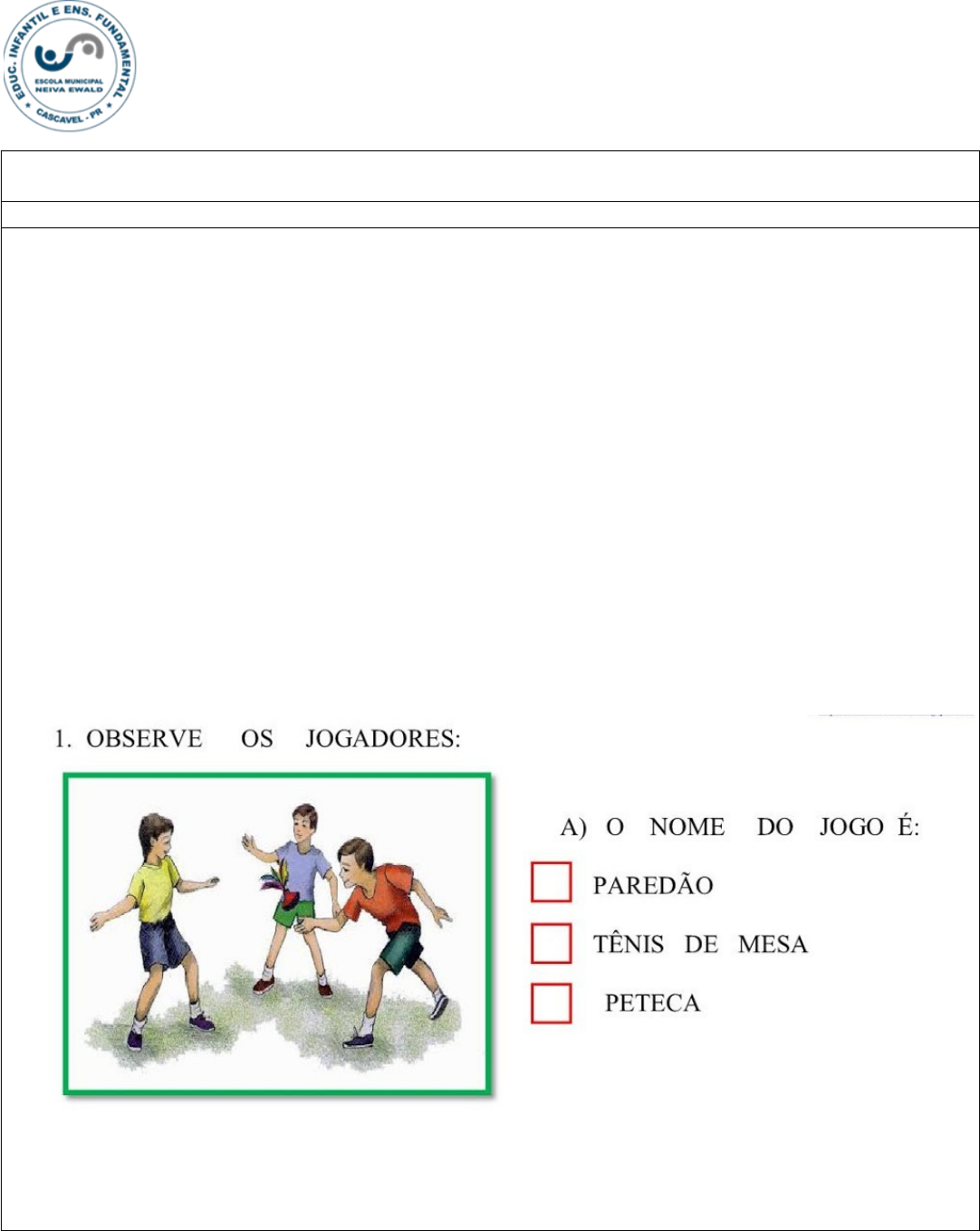 Escola Municipal Neiva Ewald - Educação Infantil e Ensino Fundamental Aluno (a):_____________________________________ Data: 26/04/2021 e 03/05/2021 Turma: 1ºA Professora: Vanessa Scherer ATIVIDADE REMOTA CONFORME ORIENTAÇÕES NAS INSTRUÇÕES NORMATIVAS Nº 01/2020, Nº 05/2020 e Nº 02/2021 – SEMED/CASCAVEL SEGUNDA-FEIRA – 26/04/2021 e 03/05/2021 COMPONENTE CURRICULAR: EDUCAÇÃO FÍSICA JOGO - PETECA A PETECA PODE SER JOGADA ENTRE DUAS OU MAIS CRIANÇAS OU ADULTOS. SE FOR EM DUPLA, UMA FICA EM FRENTE PARA OUTRA NUMA DISTÂNCIA DE MAIS OU MENOS DOIS METROS, SE FOR COM MAIS CRIANÇAS OU ADULTOS, ELES FORMAM UM CÍRCULO. QUEM COMEÇA A BRINCADEIRA DEVE SEGURAR A PETECA COM UMA MÃO E ARREMESSÁ-LA DEBAIXO PARA CIMA COM A OUTRA MÃO, LANÇANDO AOS OUTROS COMPANHEIROS DE JOGO. O JOGADOR SEGUINTE ARREMESSA A PETECA PASSANDO PARA O OUTRO SEM DEIXAR CAIR. QUANDO A PETECA CAIR NO CHÃO, NA BRINCADEIRA COM MAIS CRIANÇAS O JOGADOR SAI DA BRINCADEIRA. O GANHADOR DO JOGO SERÁ QUEM NÃO DEIXOU A PETECA CAIR NEM UMA VEZ. F) DESENHE UMA PETECA NO ESPAÇO ABAIXO, DEPOIS, PINTE O DESENHO: https://madalenaclaudia.blogspot.com/