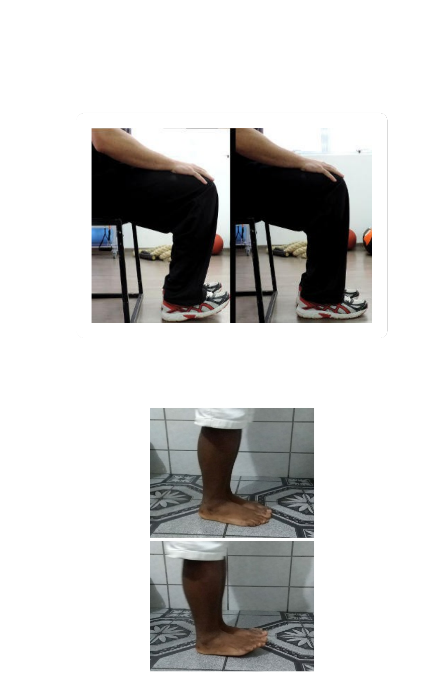 Tibial anterior · Paciente Sentado, deixe seu pé alinhado com o seu joelho. Com os calcanhares no chão suba a ponta do pé bem rápido. Esses exercícios você faz por tempo, entre 30-60 segundos. · Paciente em Pé, fazendo movimento igual ao que fez sentado, ele não fica tão rápido nem sua amplitude é tão grande. Mas esse exercício é ótimo para fazer no trabalho ou se estiver em uma fila por exemplo. · Tibial com carga – Esse tem várias opções, sentado com os pés no banco você pode segurar um halter com os dois pés e fazer a dorsiflexão. Outras opções unilaterais são colocar uma caneleira ou alguém segurar um elástico enquanto você faz a força contrária. · Paciente deitado em D.D (decúbito dorsal) com o elástico na ponta do pé, com o joelho e o quadril fletidos a 90º com o elástico puxando a ponta do pé para si.