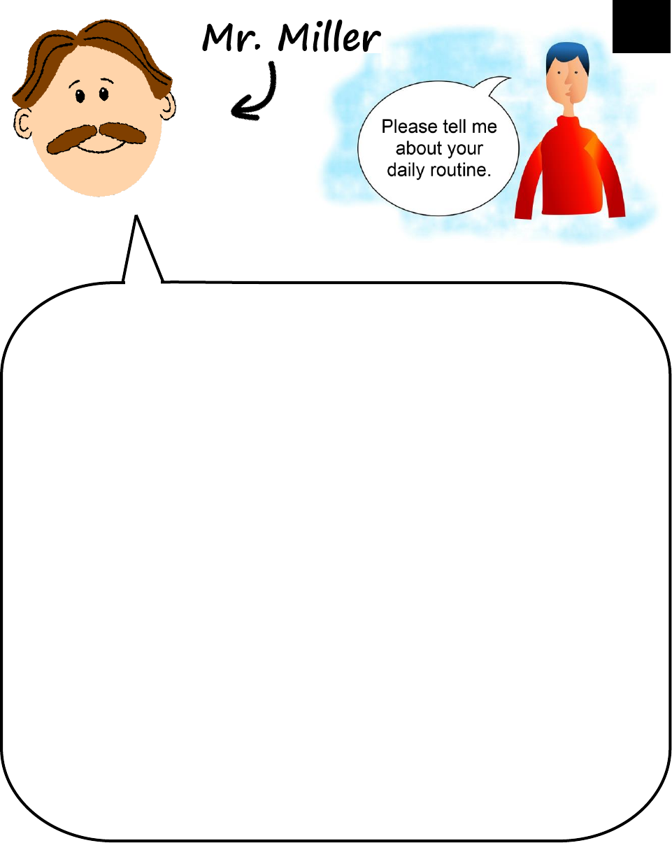 NAME: ________________________ DATE: ________________________ INTERVIEW a “read-aloud-and-listen” activity PRESENT SIMPLE: ‘Daily Routine’ Your name is Mr. Miller. A TV news reporter just asked you to tell him about your daily routine. Read aloud your answer. Permission granted to reproduce for classroom use. © www.allthingsgrammar.com / www.allthingstopics.com I’m an English teacher and I have a big family, so I have a very busy daily routine! First, I get up every day at six o’clock, get washed and dressed, and leave for work by seven-thirty. I get to school at eight o’clock. I prepare my lessons and then teach until noon. The other teachers and I always eat lunch and talk together in the teachers’ room. I teach again in the afternoon and then I correct my students’ homework and tests. After I get back home, I help my kids with their homework. I have three kids in elementary school. Their names are Mathew, Jon and Suzie. Then, I do some exercise, eat dinner with my family and watch TV before I go to bed at about ten o’clock. We love to watch travel shows. Finally, I read in bed for a few minutes before I fall asleep. A NAME: ________________________ DATE: ________________________ INTERVIEW a “read-aloud-and-listen” activity PRESENT SIMPLE: ‘Daily Routine’ Your name is Ms. Lucy. A TV news reporter just asked you to tell him about your daily routine. Read aloud your answer. Permission granted to reproduce for classroom use. © www.allthingsgrammar.com / www.allthingstopics.com Well, I almost always get up very early, at about five-thirty. I get up early because I like to go jogging along the beach and watch the sun rise. Later, after breakfast, I go to work. I work in a bank near my home. I don’t drive to work, I take a bus. It only takes about twenty minutes to get to work. After work, I like to go to my favorite bakery and buy some fresh bread. I get home between five o’clock and five-thirty. My husband Michael usually makes dinner because he loves to cook. In fact, he is a chef in a restaurant. His hobby is painting, and my hobby is growing flowers in our garden. We also have a pet dog called Wolfie. In the evenings we take Wolfie for a walk, and then get to bed by nine-thirty because we have to get up so early again the next morning. B Name: ___________________________ Listen and answer. INTERVIEW with Mr. Miller 1. What job does Mr. Miller have? Is he a busy person? ___________________________________ ___________________________________ ___________________________________ 2. What time does Mr. Miller get up every morning? ___________________________________ ___________________________________ ___________________________________ 3. Who does Mr. Miller have lunch with? ___________________________________ ___________________________________ ___________________________________ 4. What does he do after he helps his kids with their homework? ___________________________________ ___________________________________ ___________________________________ 5. What kinds of TV shows does he love to watch? ___________________________________ ___________________________________ ___________________________________ Name: ___________________________ Listen and answer. INTERVIEW with Ms. Lucy 1. Why does Ms. Lucy get up very early every morning? ___________________________________ ___________________________________ ___________________________________ 2. Where does Ms. Lucy work? ___________________________________ ___________________________________ ___________________________________ 3. How long does it take Ms. Lucy to get to work? ___________________________________ ___________________________________ ___________________________________ 4. What is Ms. Lucy’s hobby? ___________________________________ ___________________________________ ___________________________________ 5. What does Ms. Lucy do in the evenings? ___________________________________ ___________________________________ ___________________________________ Permission granted to reproduce for classroom use. © www.allthingsgrammar.com / www.allthingstopics.com INTERVIEW Present Simple (Daily Routine) Aims Listening and speaking practice (with present simple); practice reading aloud and taking notes Level Beginner to Elementary ANSWER KEY INTERVIEW with Mr. Miller 1. (He is) an English teacher. (He is) very busy. 2. (He gets up) at six o’clock. 3. (He has lunch with) the other teachers. 4. (He) does exercise, eats dinner and watches TV. 5. (He loves to watch) travel shows. INTERVIEW with Ms. Lucy 1. (She likes to) go jogging and watch the sun rise. 2. (She works) in a bank. 3. (It takes her) about twenty minutes (to get to work). 4. (She likes) growing flowers (in their garden). 5. (She) takes her dog for a walk. ACTIVITY NOTES Because the interviewers must both listen and take notes at the same time, consider allowing them to write incomplete sentences (“notes”) on the question handout. Following the activity, you can elicit complete sentences and write them on the board – or have students volunteer to come up and write their sentences. Before the activity, it may be useful to write one or two phrases on the board asking for repetition or clarification – and practice them with your students. For example: “Excuse me, could you repeat that?” or “Did you say …?” This activity works well as a lead-in to a less guided activity in which students interview their classmates (who supply real answers about themselves). Permission granted to reproduce for classroom use. © www.allthingsgrammar.com / www.allthingstopics.com