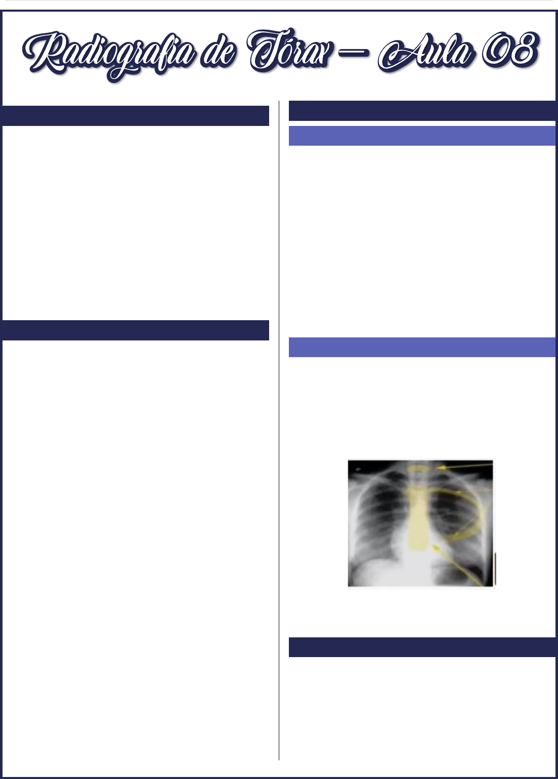 M a r i a L u i z a F e r n a n d e s – P n e u m o p e d – P á g i n a | 1 INTRODUÇÃO C A radiografia do tórax é o exame radiográfico mais realizado em crianças. C Interpretação correta é crucial para alcançar o diagnóstico correto e evitar tratamento inadequado devido à falha em apreciar a variação normal. C É importante a sistematização da avaliação. C Cerca de 10% a 15% desses exames são laudados de maneira errônea por conta de falsos positivos e falsos negativos ocasionados pela má qualidade do exame radiológico de tórax bem como pela falta de pelo menos duas incidências radiológicas para avaliação torácica. AVALIAÇÃO METÓDICA: C Verifique o nome do paciente, a data do exame e marcação lateral. C Observe a projeção (supina ou ereta, ântero- posterior ou póstero-anterior), fase de respiração e presença de qualquer rotação. C Identifique qualquer artefato ou sombras. → EX: Colar, criança na UTI com eletrodos (não podia ser retirado). C Identificar sinais radiológicos anormais revendo sistematicamente todas as regiões, incluindo: traqueia, carina, brônquios maiores; contornos do mediastino e região hilar; tamanho e contorno cardíaco; vascularização pulmonar; tamanho e translucidez dos pulmões; posição das principais fissuras; clareza e altura do diafragma; ângulos costofrênicos; tecidos moles e esqueleto torácico. *Sugerir o diagnóstico mais provável ou listar possíveis diagnósticos diferenciais com base nos dados radiológicos observados, fazendo correlação clínica. C EX: Possível diagnóstico de pneumonia viral → Infiltrado intersticial peribroncovascular que pode SUGERIR, uma etiologia viral ou inflamatória, mas não dizer que É. INFLUÊNCIA DA TÉCNICA E INTERPRETAÇÃO FASE DA RESPIRAÇÃO C Os diafragmas são projetados entre quinta e sétima costela anterior em um exame bem inspirado. No infantil jovem, uma fase expiratória exagerará o tamanho do coração e as marcações broncovasculares, pode levar a um diagnóstico errôneo de broncopneumonia. A alta posição dos diafragmas irá obscurecer anormalidades nas bases do pulmão. C INSPIRAÇÃO PROFUNDA: Rebaixamento do diafragma e ver melhor as estruturas de base pulmonar. C EXPIRAÇÃO PROFUNDA: Comprimir as estruturas e ai a gente pode não conseguir ter imagens claras. POSICIONAMENTO C A rotação é a causa mais comum de desigualdade na translucidez dos dois pulmões. A rotação pode ser avaliada verificando a simetria das costelas e a distancia das bordas mediais das clavículas do processo espinhoso das vértebras e alinhamento das escápulas. C Observar se há diferença entre a distancia do hemitórax esquerdo e direito. PRINCIPAIS INCIDÊNCIAS C PA: Póstero-anterior. Avaliação torácica, evita, na medida do possível, magnificação do coração e alterações estruturais adjacentes. Ao permanecerem mais perto do filme radiográfico, as estruturas que serão estudadas sofrem menos alterações de tamanho, ficando mais próximas da proporção real. Importante posicionamento abaixo para – M a r i a L u i z a F e r n a n d e s – P n e u m o p e d – P á g i n a | 2 C PERFIL: Ela possibilita uma visão dimensional melhor das estruturas. Devido a sobreposição de estruturas que é vista no PA, no perfil podemos perceber posicionamento de lesões anteriores ou posteriores a estruturas anatômicas normais. C AP: É resguardada para pacientes que não conseguem se locomover adequadamente, estão acamados ou possuam algum motivo ou indicação maior para o exame. Essa incidência não é tão confiável, pois as estruturas estão mais longe do filme radiográfico, de forma que os raios X, que são divergentes, ao entrarem anteriormente ao invés de posteriormente favorecem um aumento da área cardíaca, pois o coração encontra-se longe do filme radiográfico, dificultando a análise de tamanho do coração e dos campos pulmonares. C ÁPICO LORDÓTICA: Visualização dos ápices pulmonares, ou seja, o paciente assume uma posição que favorece a retirada das clavículas do campo de avaliação radiológica. De maneira indireta, também avaliamos melhor o lobo médio e a língula. C DECÚBITO LATERAL OU DE LAWRELL: É utilizada quando possuímos alguma lesão que muda sua posição ao alterarmos a posição do paciente EX: Um derrame pleural livre que em pé mostra-se obliterando os seios costofrênicos, que ao paciente deitar o líquido “escorre”. Ou seja, mobilidade de líquido. C OBLÍQUA: É realizada para visualizar e caracterizar melhor as lesões parcialmente encobertas por demais estruturas ou até mesmo para avaliação da área cardíaca em casos de imagens duvidosas. PENETRAÇÃO C Se não conseguirmos visualizar nenhum corpo vertebral torácico é sinal de pouca penetração, já o contrário, quando visualizamos inclusive os corpos vertebrais inferiores, estaremos com muita penetração. C PENETRAÇÃO ADEQUADA: Um indicativo referencial de penetração adequada seria a visualização de pelo menos três corpos PENETRAÇÃO ADEQUADA POUCA PENETRAÇÃO MUITA PENETRAÇÃO M a r i a L u i z a F e r n a n d e s – P n e u m o p e d – P á g i n a | 3 vertebrais acima do botão aórtico, porém, os processos vertebrais posteriormente localizados à sombra cardíaca não devem ser visualizados de forma detalhada e/ou consecutiva. Na prática radiográfica não é possível obter sempre uma penetrância perfeita, mas sim um exame “aceitável ou muito bom”. C POUCA PENETRAÇÃO: Dá impressão de infiltração, os vasos ficam mais evidentes (falsa sensação de interstício pulmonar). C MUITA PENETRAÇÃO: Dá pra visualizar a coluna inteira, tudo muito preto, não consegue ver as estruturas bem delineadas. ESPAÇOS INTERCOSTAIS E CENTRALIZAÇÃO ADEQUADA C O espaço entre as clavículas precisa ser simétricos. Visualizar pelo menos o 9º ou 10º arco intercostal posterior ou em média 7 espaços intercostais anteriores. 