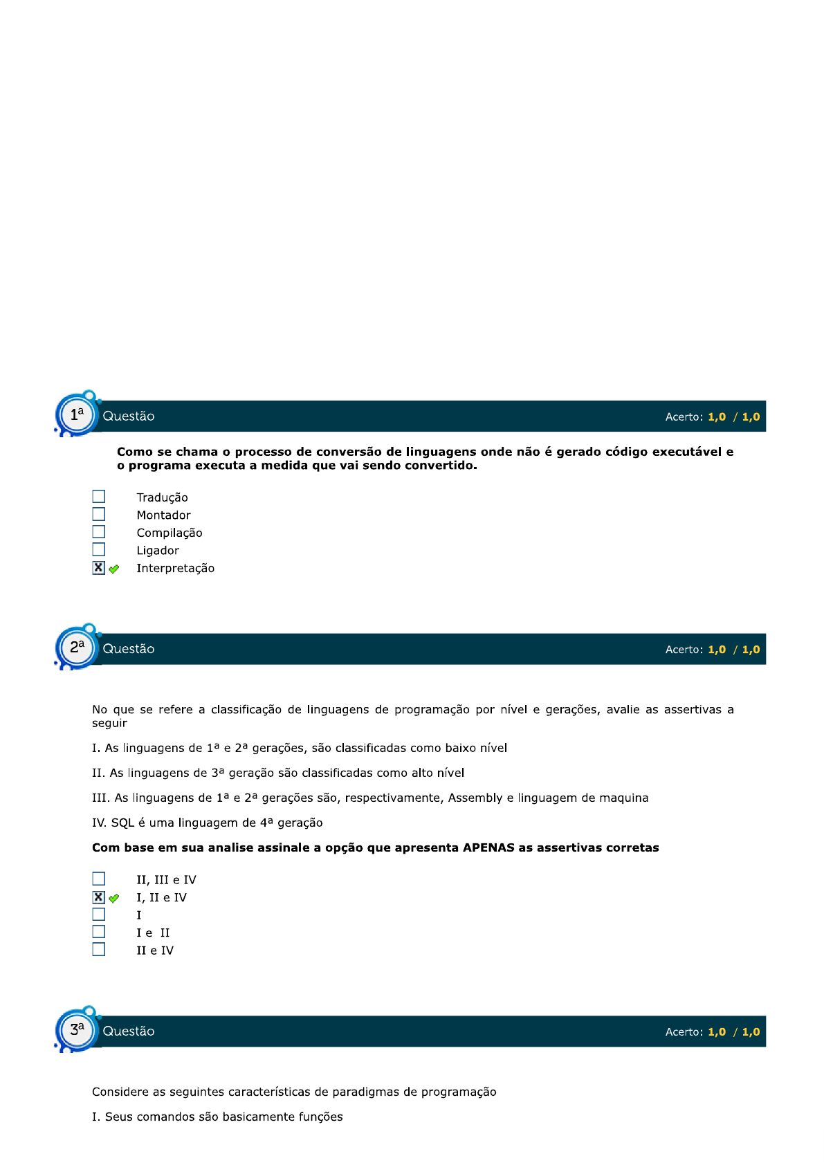 Questão Acerto: 1,0 / 1,0 Como se chama o processo de conversão de linguagens onde não é gerado código executável e o programa executa a medida que vai sendo convertido. □ Tradução □ Montador Compilação □ Ligador í ? Interpretação 2a i Questão Acerto: 1,0 / 1,0 No que se refere a classificação de linguagens de programação por nível e gerações, avalie as assertivas a seguir I. As linguagens de I a e 2a gerações, são classificadas como baixo nível II. As linguagens de 3a geração são classificadas como alto nível III. As linguagens de I a e 2a gerações são, respectivamente, Assembly e linguagem de maquina IV. SQL é uma linguagem de 4a geração Com base em sua analise assinale a opção que apresenta APENAS as assertivas corretas □ □□□ II, III e IV I, II e IV I I e II II e IV 3a l Questão Acerto: 1, Considere as seguintes características de paradigmas de programação I. Seus comandos são basicamente funções II. Tem por base, o reuso, através da implementação de herança e polimorfismo III. Focado em eficienca IV. LISP e Python são disciplinas desse paradigma. Assinale a opção que apresenta, em ordem, a correta classificação em paradigmas. Pode-se repetir paradigmas nas respostas funcional, orientação a objetos, estruturado, funcional ixj <;? funcional, orientação a objetos, estruturado, lógico □ estruturado, orientação a objetos, concorrente, lógico □ estruturado, orientação a objetos, estruturado, lógico funcional, orientação a objetos, orientado a objetos, lógico Questão Acerto: 1,0 / 1,0 Ano: 2014 Banca: FGV Órgão: DPE-RJ Prova: FGV - 2014 - DPE-RJ - Técnico Superior Especializado - Suporte (QConcursos, 2020). Considere o seguinte trecho de um programa escrito na linguagem Python. class Carro(): def FaleComigo(self): print "Sou um carro" class Fusca (Carro): def FaleComUmFusca(self): print "Sou um Fusca" x = Carro() y = Fusca( ) x. FaleComigo() y. FaleComigo( ) No primeiro bloco, o método FaleComigo é definido para a classe Carro, que simplesmente produz a mensagem "Sou um carro" ao ser invocado. Para a classe Fusca, definida no segundo bloco, foi definido o método FaleComUmFusca, que apenas produz a mensagem "Sou um Fusca". No terceiro bloco, os objetos x e y tornam-se instâncias das classes Carro e Fusca, respectivamente. No quarto bloco, o método FaleComigo é invocado para cada um dos dois objetos, x e y. Ao ser executado, esse programa produz duas linhas na sua tela de saída: Sou um carro Sou um carro A mensagem produzida no comando y. FaleComigo deve-se ao mecanismo de [x] ■-? Herança □ Abstração □ Interface Polimorfismo Associação Questão Acerto: 1,0 / 1,0 Ano: 2010 Banca: CETAP Órgão: DETRAN-RR Prova: CETAP - 2010 - DETRAN-RR - Analista de Sistemas ê (QConcursos, 2020). É INCORRETO afirmar que em Phyton: ixj <?;■ Excetuando-se as classes, tudo é um objeto (tipos, valores, funções, métodos e instâncias), e todos possuem atributos e métodos associados. É possível acessar os atributos da instância diretamente sem a necessidade de usar um método. □ Instâncias são objetos criados a partir de uma classe definida pelo programador; o que Python chama de instância é frequentemente denominado objeto em outras linguagens. O método construtor (p.ex.: __init__()) é um método opcional invocado quando a classe é instanciada. Um ponto fundamental da sintaxe para métodos é que o primeiro argumento é especial, e convenciona- se utilizar o nome self para ele. Questão Acerto: 1,0 / 1,0 Dadas as afirmações abaixo, assinale a alternativa CORRETA: A herança múltipla, assim como em C++, é uma característica nativa da linguagem. Python é uma linguagem compilável, a qual, após esse processo, gera um arquivo executável, do tipo binário. □ Python é uma linguagem procedural a qual não contempla orientação a objetos. □ Python permite sobrecarga de métodos na mesma classe. A declaração de atributos é algo obrigatório em Python. Questão Acerto: 1,0 / 1,0 Ano: 2014 Banca: FGV Órgão: DPE-RJ Prova: FGV - 2014 - DPE-RJ - Técnico Superior Especializado - Suporte - (QConcursos, 2020) - Adaptado. Considere o seguinte trecho de um programa escrito na linguagem Python. class Carro(): def FaleComigo(self): print "Sou um carro" class Fusca (Carro): def FaleComigo(self): print "Sou um Fusca" x = Carro() y = Fusca( ) x. FaleComigo() y. FaleComigo( ) No primeiro bloco, o método FaleComigo é definido para a classe Carro, que simplesmente produz a mensagem "Sou um carro" ao ser invocado. Para a classe Fusca, definida no segundo bloco, foi feita uma sobrecarga do método FaleComigo, que apenas produz a mensagem "Sou um Fusca". No terceiro bloco, os objetos x e y tornam-se instâncias das classes Carro e Fusca, respectivamente. No quarto bloco, o método FaleComigo é invocado para cada um dos dois objetos, x e y. Ao ser executado, esse programa produz duas linhas na sua tela de saída: Sou um carro Sou um Fusca A mensagem produzida no comando y. FaleComigo deve-se ao mecanismo de Interface ixj í ? Polimorfismo Herança Abstração Associação Questão Acerto: 1,0 / 1,0 No processo de descoberta de conhecimento em base de dados, marque a alternativa correta sobre partição de dados. Quando utilizada em uma tabela, implica na criação de colunas refletindo alguma transformação dos dados existentes em outras colunas. □ É uma atividade bastante encontrada na construção de data warehouses. Consiste na complementação de dados ausentes, detecção de ruídos e eliminação de dados inconsistentes. Significa transformar a natureza dos valores de um atributo utilizando transformações numérico- categórica ou categórico-numérica. ixi <;? Consiste em separar os dados conjuntos de treinamento (abstração do modelo de conhecimento) e de testes (avaliação do modelo gerado). Questão Acerto: 1,0 / 1,0 Considere as afirmativas e responda quais são verdadeiras. i. 