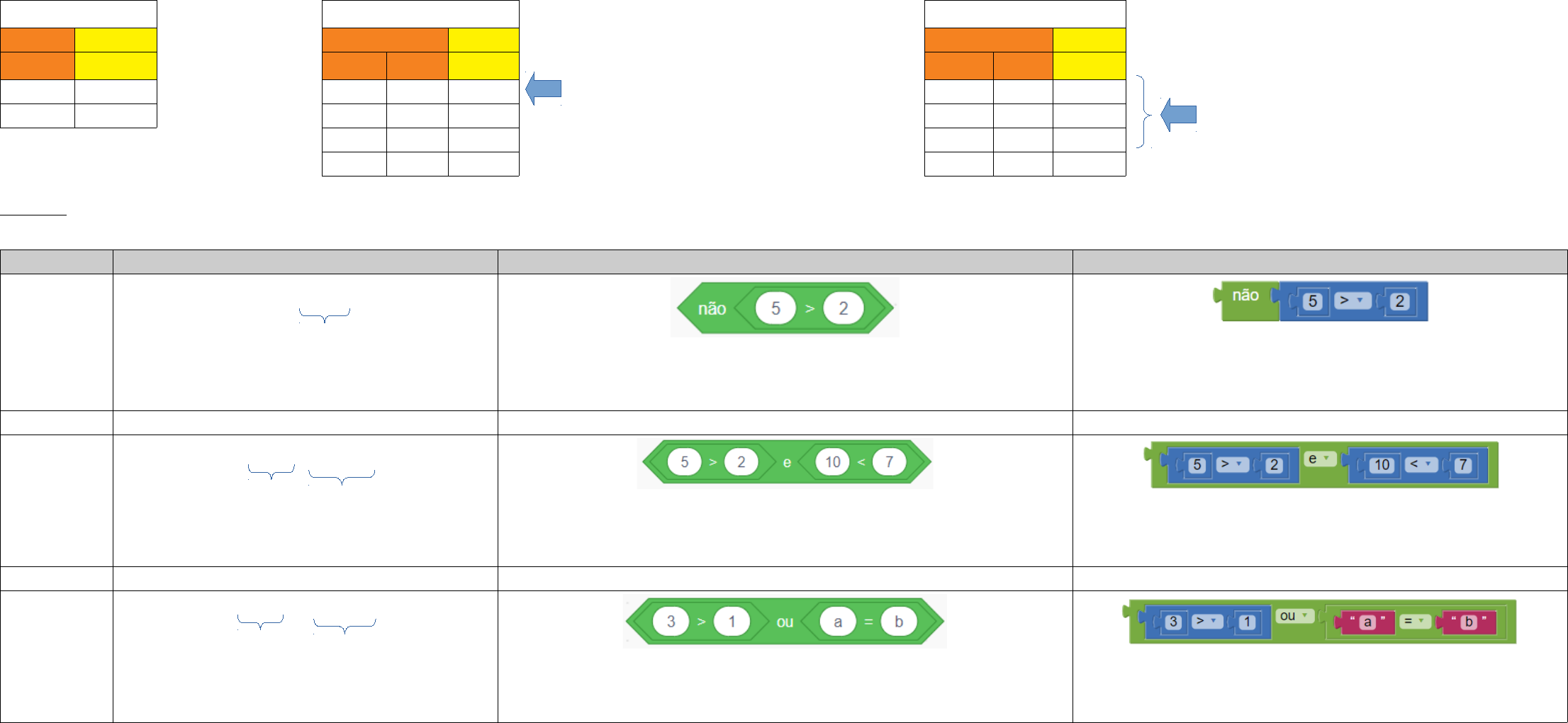 PENSAMENTO COMPUTACIONAL CONSIDERAÇÕES BÁSICAS SOBRE OPERAÇÕES E SENTENÇAS LÓGICAS DANIEL CESAR BRAZ, RONALDO CELSO MESSIAS CORREIA TABELA-VERDADE apresenta o resultado lógico (ou saída) de operações lógicas sobre operandos lógicos (entradas ou variáveis). Tanto as entradas como as saídas lógicas somente podem assumir os valores VERDADEIRO (V) ou FALSO (F). A seguir são apresentadas as tabelas-verdade dos operadores lógicos não – e – ou para as entradas A - B. 1. não 2. e 3. ou Entradas Saída Entradas Saídas Entradas Saídas A não A A B A e B A B A ou B V F V V V V V V F V V F F V F V F V F F V V F F F F F F Exemplos: Operador Pseudocódigo / Fluxograma Scratch AppInventor não não ( 5 > 2) não (V) Resultado: F e ( 5 > 2) e ( 10 < 7 ) (V) e (F) Resultado: F ou ( 3 > 1) ou (“a” = ”b”) (V) ou (F) Resultado: V A saída é verdadeira somente quando ambas as entradas forem verdadeiras. A saída é verdadeira somente quando pelo menos uma das entradas for verdadeira. ORDEM DE AVALIAÇÃO Em uma sentença lógica composta de várias operações lógicas que não estejam separadas por parênteses, colchetes ou chaves, a ordem de avaliação é a seguinte: 1. não 2. e 3. ou Exemplos: Pseudocódigo / Fluxograma Scratch AppInventor não 1 > 2 ou 5 < 7 e “a” = “c” (V) ou 5 < 7 e “a” = “c” (V) ou (F) Resultado: V USO PRÁTICO Uma sentença lógica, composta por uma várias operações lógicas, pode ser usada como <condição> a ser testada (se resulta V ou F) em instruções condicionais e instruções de repetição, tais como: Se <condição> Então <instruções> FimSe Se <condição> Então <instruções_a> Senão <instruções_b> FimSe Enquanto <condição> Faca <instruções> FimEnquanto Repita <instruções> Até <condição>