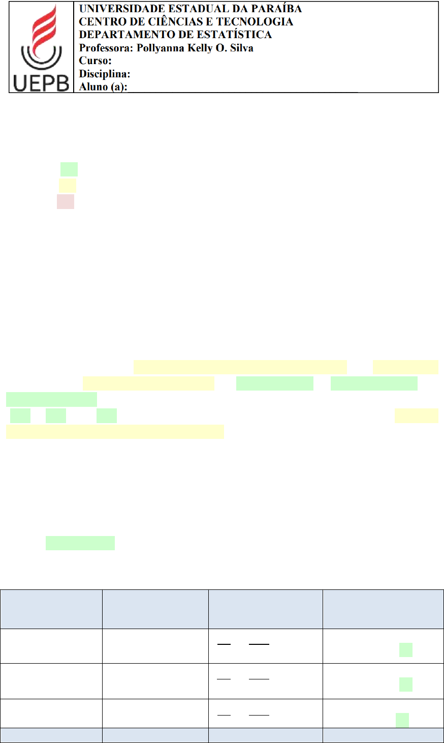 ATIVIDADE 1 - Responder as Questões 12 e 13 da 1° lista de exercícios (publicada no mural), referente as técnicas de amostragem (estratificada e sistemática). Legenda: / / - Dados; / / - Informações importantes; / / - Resposta final. 12) Em um congresso para médicos serão ministradas palestras. O número de médicos inscritos nas palestras foram: 226 em Cardiologia, 215 em Pneumologia e 159 em Reumatologia. Quantos Pneumologistas participarão da palestra se queremos apenas uma amostra proporcional estratificada de 80 médicos. SOLUÇÃO → Primeiro vamos interpretar a questão, entendendo o que ela tem como objetivo: A questão pede uma amostragem estratificada proporcional de 80 médicos dentro de 3 estratos diferentes, (Cardiologistas, Pneumologistas e Reumatologistas), cada estrato conta com uma quantidade distinta de médicos, (226, 215 e 159), respectivamente. E pergunta, finalmente, quantos Pneumologistas participarão da palestra. → Somando todas as unidades (médicos) dos 3 estratos, temos: Logo, descobrimos o tamanho da nossa População, conjunto de todos os elementos que possuem pelo menos uma característica em comum, que é igual a 600 médicos. → Em seguida, vamos calcular a proporção dos nossos dados: Estrato Nº de médicos Proporção Nº de médicos escolhidos em cada estrato Cardiologistas 226 30,08 ≅ 30 Pneumologistas 215 28,64 ≅ 29 Reumatologistas 159 21,2 ≅ 21 TOTAL 600 80 Maria Lorenna Pessoa Fonsêca → Depois dos nossos cálculos de proporção, chegamos ao seguinte resultado: Nº de médicos de cada estrato escolhidos para a palestra: Cardiologistas 30 Pneumologistas 29 Reumatologistas 21 TOTAL 80 → Assim, temos como resposta para a questão: 29 Pneumologistas participarão da palestra ministrada pelo Congresso. 13) Um administrador de uma sala de cinema deseja fazer uma pesquisa com algumas dentre as 250 pessoas que estão na fila de espera para comprar ingresso, sabendo que ele deseja entrevistar 10 pessoas, selecione através de amostragem sistemática as que farão parte da pesquisa, sabendo que a primeira é a número 7. SOLUÇÃO → Primeiro vamos interpretar a questão, entendendo o que ela tem como objetivo: O administrador deseja selecionar 10 pessoas de uma fila de cinema para uma entrevista, essa fila conta com 250 pessoas. A questão pede para usar a Amostragem Sistemática para escolher as 10 pessoas que farão parte da pesquisa, e dá a informação que a pessoa Nº 7 será a primeira. → Em seguida, vamos separar alguns de nossos dados: Tamanho da população: 250 pessoas; Tamanho amostral: 10 pessoas; → Depois, determinaremos o intervalo da amostragem, usando a fórmula; K = N/n K = intervalo da amostragem N = Tamanho da população n = Tamanho amostral → A questão fala que a primeira de 10 pessoas a serem entrevistadas será o número 7. Então, a partir do 7º indivíduo está definida como será a amostra, usando intervalos de 25 unidades, que foi o resultado do intervalo da amostragem. → Assim, para facilitar nosso percurso até o resultado, utilizaremos a fórmula matemática de progressão aritmética (sequência numérica em que cada termo, a partir do segundo, é igual à soma do termo anterior com uma constante r): an = a1 + (n – 1) x r an = termo geral a1 = primeiro termo n = quantidade de termos r = razão ou diferença comum da progressão aritmética → Agora vamos aplicar a fórmula para os 10 números que a questão pede: a1 = 7 a2 = 7 + (2 – 1) x 25 = 32 a3 = 32 + (3 – 1) x 25 = 57 a4 = 57 + (4 – 1) x 25 = 82 a5 = 82 + (5 – 1) x 25 = 107 a6 = 107 + (6 – 1) x 25 = 132 a7 = 132 + (7 – 1) x 25 = 157 a8 = 157 + (8 – 1) x 25 = 182 a9 = 182 + (9 – 1) x 25 = 207 a10 = 207 + (10 – 1) x 25 = 232 → Dessa forma, temos como resposta final: As 10 pessoas que farão parte da pesquisa serão as de número 7, 32, 57, 82, 107, 132, 157, 182, 207, 232.
