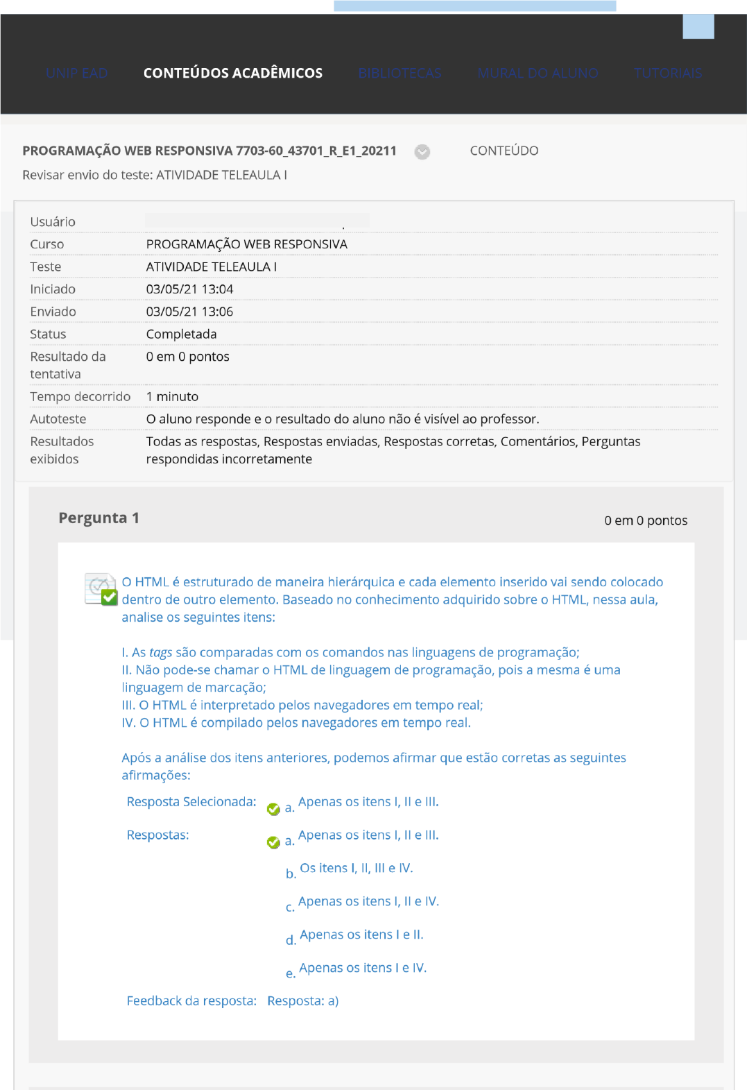 03/05/2021 Revisar envio do teste: ATIVIDADE TELEAULA I – 7703-60_... https://ava.ead.unip.br/webapps/assessment/review/review.jsp?attempt_id=_61954557_1&course_id=_163028_1&content_id=_2095970_1&retur… 1/3 03/05/2021 Revisar envio do teste: ATIVIDADE TELEAULA I – 7703-60_... https://ava.ead.unip.br/webapps/assessment/review/review.jsp?attempt_id=_61954557_1&course_id=_163028_1&content_id=_2095970_1&retur… 2/3 Pergunta 2 Resposta Selecionada: e. Respostas: a. b. c. d. e. Feedback da resposta: A respeito da tag <body> é correto armar que: I. É o corpo da página, onde as informações visíveis ao usuário são inseridas; II. É a cabeça da página, onde as informações visíveis ao usuário são inseridas; III. Posso inserir a tag <head> dentro da tag <body> para inserir um novo cabeçalho à página; IV. A tag <body> é a única tag que pode car fora da hierarquia da tag <html>. Assinale a alternativa correta: Apenas a armativa I está correta. Apenas a armativa II está correta. Apenas as armativas I, II e III estão corretas. Apenas as armativas II, III e IV estão corretas. Apenas as armativas I e IV estão corretas. Apenas a armativa I está correta. Resposta: e) Pergunta 3 Resposta Selecionada: a. Respostas: a. b. c. d. e. Feedback da resposta: A respeito da lista ordenada: I. Para criar uma lista ordenada utiliza-se a tag <ol>; II. Para criar uma lista ordenada utiliza-se a tag <ul>; III. O componente utilizado dentro das listas ordenadas ou não ordenadas é a tag <li>. Assinale a alternativa co rreta: Apenas as a rmativas I e III estão corretas. Apenas as a rmativas I e III estão corretas. Apenas as a rmativas II e III estão corretas. Apenas a a rmativa I está correta. Apenas a a rmativa II está correta. Apenas a a rmativa III está correta. Resposta: a) 0 em 0 pontos em 0 pontos 0 03/05/2021 Revisar envio do teste: ATIVIDADE TELEAULA I – 7703-60_... https://ava.ead.unip.br/webapps/assessment/review/review.jsp?attempt_id=_61954557_1&course_id=_163028_1&content_id=_2095970_1&retur… 3/3 Segunda-feira, 3 de Maio de 2021 13h06min08s BRT Pergunta 4 Resposta Selecionada: d. Respostas: a. b. c. d. e. Feedback da resposta: A respeito da criação de âncora nas páginas: I. É um link interno dentro da página que, ao ser acessado, leva o usuário de um ponto até o outro na própria página; II. É um link externo dentro da página que, ao ser acessado, leva o usuário de um ponto até o outro em outra página; III. É utilizado quando o conteúdo da página é muito extenso. Assinale a alternativa correta: Apenas as a rmativas I e III estão corretas. Apenas a a rmativa I está correta. Apenas a a rmativa II está correta. Apenas a a rmativa III está correta. Apenas as a rmativas I e III estão corretas. Apenas as a rmativas II e III estão corretas. Resposta: d) ← OK 0 em 0 pontos