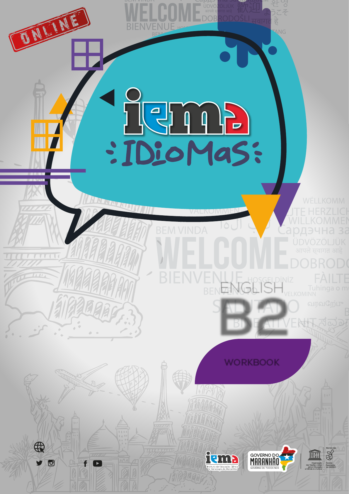 SEDUC ENGLISH B2 WORKBOOK @iemainstituto iemaoficial_ma @iema_oficial www.iema.ma.gov.br. SEDUC Adaptado e reproduzido parcialmente de SELIGSON, Paul English ID: student’s book. 1ª Ed. São Paulo: Moderna, 2013. Todos os direitos reservados. Governador do Maranhão Flávio Dino Secretário de Estado da Educação Felipe Costa Camarão Secretário Adjunto de Educação Profissional e Integral André Bello Coordenadora do Programa Maranhão Profissionalizado Josélia Castro Equipe Técnica da Coordenação de Ensino à Distância Ezequias Pereira Felipe Fortes Lucas Lima Pedro Tobias Riccardo Otavio SEDUC 1 - AUDIO SCRIPT SEDUC 2 WORKBOOK 1 Circle the "different" item in each group. Write the room in the last column. 2 Match a-i to a room in 1. a This is my_______. It's a little small, but I only come here to sleep. b Welcome to my favorite room. It's the ______________. I love sleeping on the sofa or watching TV here. C I love cooking, so my favorite room is my ____________. d There's a ___________ under the house with a lot of storage space. e Thls is the ____________ I only come here once a week to wash and dry my clothes. f I work from home a lot, so I have an ____________ with a computer. g I don't have a __________ , so my car is in front of my house. h The _____________ is really small, just a shower and a toilet. I We have dinner parties in the ___________ there's space for about eight people to eat. SEDUC 2 WORKBOOK 1 Circle the "different" item in each group. Write the room in the last column. 2 Match a-i to a room in 1. a This is my_______. It's a little small, but I only come here to sleep. b Welcome to my favorite room. It's the ______________. I love sleeping on the sofa or watching TV here. C I love cooking, so my favorite room is my ____________. d There's a ___________ under the house with a lot of storage space. e Thls is the ____________ I only come here once a week to wash and dry my clothes. f I work from home a lot, so I have an ____________ with a computer. g I don't have a __________ , so my car is in front of my house. h The _____________ is really small, just a shower and a toilet. I We have dinner parties in the ___________ there's space for about eight people to eat. 3 3 ► 6.1 Make sentences. Follow the model. 4 Read the program information and answer a-c, true (T) or false (F). SEDUC 4 5 ► 6.2 Listen and complete a-d with was / were + -. 6 ► 6.2 Listen again and complete a-f with rooms or furniture. SEDUC 4 5 ► 6.2 Listen and complete a-d with was / were + -. 6 ► 6.2 Listen again and complete a-f with rooms or furniture. 5 1 Add vowels to the incomplete words to make common party items. SEDUC 6 2 MAKE IT PERSONAL Re-read sentences a-i in 1. Ad dor remove don’t to make your own rules for a good party. 3 ► 6.3 Add one word to questions a-h to make them correct in the past. Listen to check. 4 ► 6.3 Listen again and repeat the questions. 5 ► 6.4 Listen to a conversation and answer the questions in 3. 6 MAKE IT PERSONAL Write a short note about your last party. Use the questions in 3 to help. SEDUC 6 2 MAKE IT PERSONAL Re-read sentences a-i in 1. Ad dor remove don’t to make your own rules for a good party. 3 ► 6.3 Add one word to questions a-h to make them correct in the past. Listen to check. 4 ► 6.3 Listen again and repeat the questions. 5 ► 6.4 Listen to a conversation and answer the questions in 3. 6 MAKE IT PERSONAL Write a short note about your last party. Use the questions in 3 to help. 7 7 Take the music quis. Match the song lines to the artists. SEDUC 8 1 ► 6.5 Complete a-e with a date. Listen to check. Any surprise? 2 Read about these events and answer a-f. 9 3 ► 6.6 Match comments a-d to the festivals, then complete them with was or wer. Listen to check. SEDUC 8 1 ► 6.5 Complete a-e with a date. Listen to check. Any surprise? 2 Read about these events and answer a-f. 9 3 ► 6.6 Match comments a-d to the festivals, then complete them with was or wer. Listen to check. SEDUC 10 1 Match the two halves of famous quotes. What are your favorite ones? 2 Read and complete the blog about the Picture with these prepositions. 3 Re-read and answer a-c. A Where do tourists take fotos? B Are the restaurants in the square good places to eat? Why / Why not? C Where is a good place to eat in the park? 4 ► 6.7 Use the picture in 2 to make sentneces. Follow the model. SEDUC 10 1 Match the two halves of famous quotes. What are your favorite ones? 2 Read and complete the blog about the Picture with these prepositions. 3 Re-read and answer a-c. A Where do tourists take fotos? B Are the restaurants in the square good places to eat? Why / Why not? C Where is a good place to eat in the park? 4 ► 6.7 Use the picture in 2 to make sentneces. Follow the model. 11 5 MAKE IT PERSONAL Are a-e ture (T) or false (F) for your town? A There were tramps here fifty years ago. B There was a loto f pollution, but it’s clean now. C There wer a lot more cinemas a few years ago. D There wasn’t anywhere for children to play, now there are some play áreas. E There wer some beautiful old buildings, but they aren’t there now. SEDUC 12 1 Read the text and answer a-d. A Where is Glastonbury? B When is the festival? C What stopped the festival in 2012? D How can you buy a ticket? SEDUC 12 1 Read the text and answer a-d. A Where is Glastonbury? B When is the festival? C What stopped the festival in 2012? D How can you buy a ticket? 13 2 ► 6.8 Listen and match the numbers to the phrases to make statistics for Glastonbury 2011. Listen again to check. 3 ► 6.8 Listen again and write down three more numbers from the áudio. WHat do they refer to? 4 ► 6.9 Circle the correct word in invitations a-f. Then listen and complete them with the phrases from the box. SEDUC 14 1 Write words to complete a-g about Amy Winehouse. COpy the letters and discover the secret entence. SEDUC 14 1 Write words to complete a-g about Amy Winehouse. COpy the letters and discover the s
