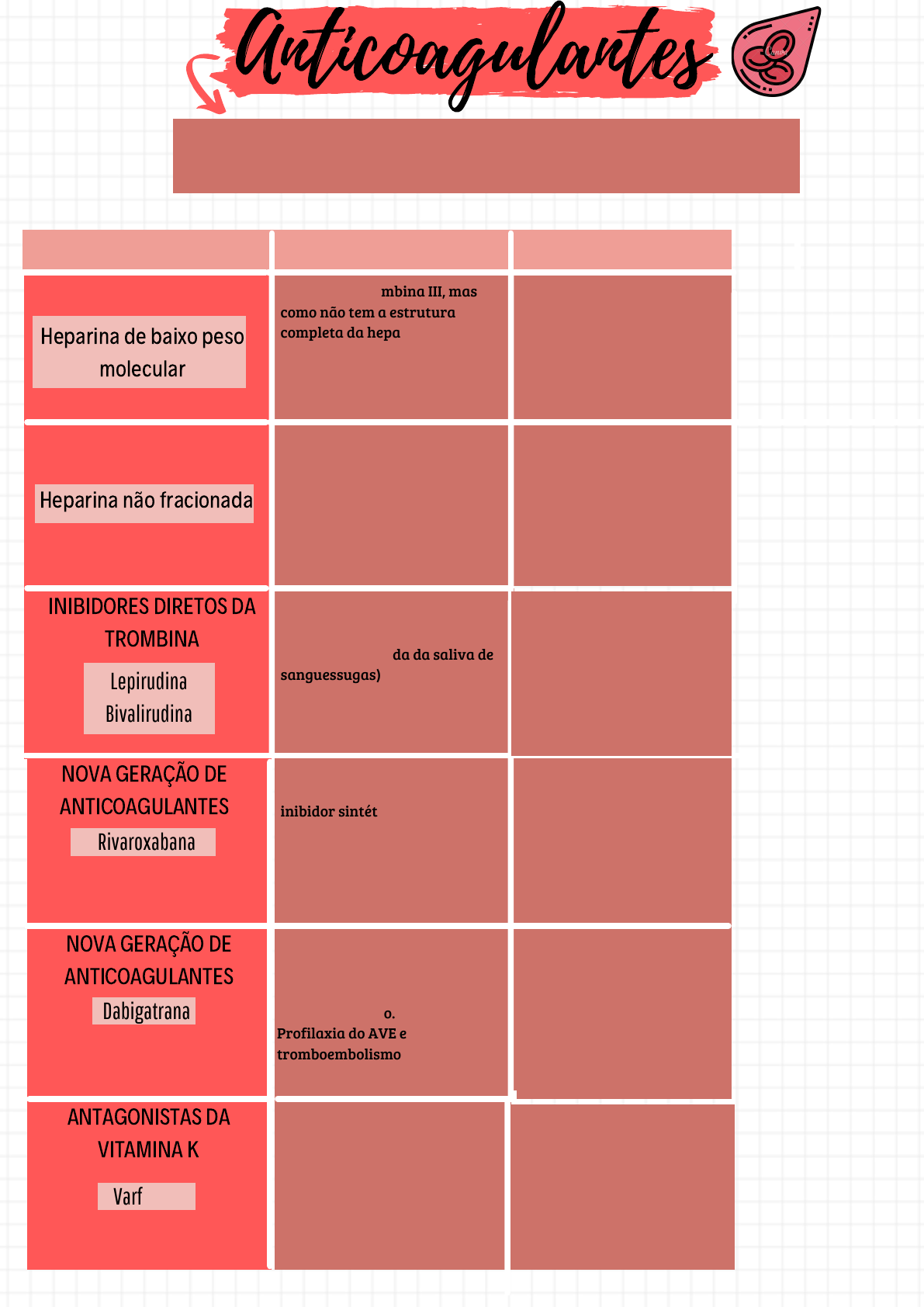 Anticoagulantes inibidor sintético do fator Xa e não da trombina. Usado na profilaxia de TEP, TVP e AVE Os anticoagulante são uma classe de medicamento que atuam na inibição dos fatores de coagulação ou na interferência da síntese desses fatores. Classes Mecanismo de ação Farmacocinética Heparina de baixo peso molecular Heparina não fracionada Ativa a antitrombina III, mas como não tem a estrutura completa da heparina, a ativação de antitrombina III não consegue inibir trombina, inibe o fator Xa e inibe indiretamente a trombina. Vai ativar a antitrombina III que inibe a trombina diretamente. Não absorvida pelo intestino Forma de administração é intravenosa (efeito imediato) ou subcutânea (demora até 60-120min para o efeito). Meia vida de eliminação mais longa, independente da dose, tornando os efeitos mais previsíveis e intervalos entre as doses maior. Não necessita de monitoramento pelo TTPA INIBIDORES DIRETOS DA TROMBINA São moléculas derivadas das Hirudinas (inibibidores da trombina derivada da saliva de sanguessugas) que vão inativar irreversivelmente a trombina. NOVA GERAÇÃO DE ANTICOAGULANTES NOVA GERAÇÃO DE ANTICOAGULANTES ANTAGONISTAS DA VITAMINA K Aprovado para prevenção de tromboembolismo venoso venoso após cirurgia ortopédica de quadril ou joelho. Profilaxia do AVE e tromboembolismo Lepirudina Bivalirudina Rivaroxabana Dabigatrana Varfarina Inibem redução da vitamina K, de forma que impede que o fator Xa seja ativado e converta protombina em trombina. Rápida e completa absorção pelo intestino após ADM VO. Pico de concentração 1h após ingestão e o de efeito 48h. Dose ajustada para atingir RNI de 2-4 É bem absorvida pelo trato GI, sendo biotransformadas por via hepática, formando metabólitos inativos que serão eliminados pela urina e fezes. É administrado por via oral e é bastante hidrolisada, sendo necessáriomser ingerida com cápsulas para evitar redução na potência desse fármaco. Absorvido em pH ácido. Geralmente, tem meia-vida de 25 minutos, necessitando de ajuste em dosagem se o paciente apresentar disfunção renal.