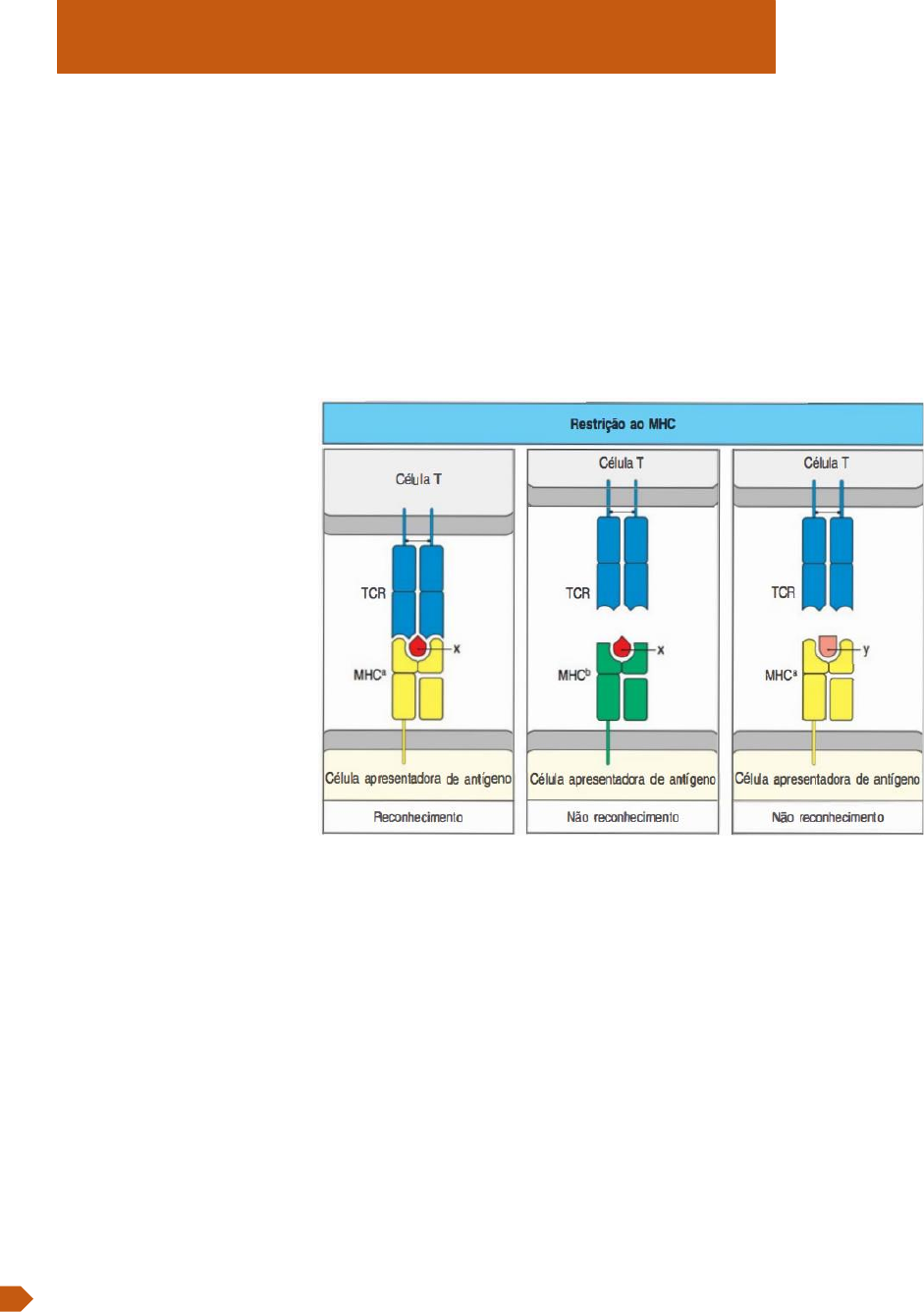 Os linfócitos T e B fazem parte da imunidade adaptativa. E desse modo, há clones de linfócitos T e B específicos para cada antígeno. Os linfócitos T possuem como funções: Defesa contra infecções principalmente causadas por microorganismos intracelular e ativação de outras células, tais como os macrófagos e os linfócitos B. • Linfócitos T: Não reconhecem os antígenos solúveis nos plasma, só reconhecem peptídeos (antígenos degradados) proteicos apresentados por outras células. • Linfócitos B: Reconhecem antígenos solúveis ou de superfície celular. O reconhecimento de antígenos pelas células T é restrito ao complexo de histocompatibilidade principal, através do mecanismo de chave-fechadura. Desse modo, o linfócito só será ativado, bem como o seu receptor TCR, quando o peptídeo (antígeno degradado) for apresentado por moléculas de MHC. Explicação da imagem Imagem 1: Nessa imagem, a conformação do MHCa é complementar a do TCR, fazendo com que haja uma ligação perfeita. Bem como, a configuração do peptídeo apresentado, que se complementa à do TCR. Desse modo, tem-se uma correspondência química acontecendo, fazendo com que haja o reconhecimento. Imagem 2: Apesar do peptídeo x apresentar uma configuração que se complementa a do TCR, a configuração do MHCB é diferente, fazendo com que não haja um encaixe perfeito na molécula TCR, não havendo, portanto, o reconhecimento. Fenômeno conhecido como restrição pelo MHC. Imagem 3: Nessa imagem, há uma chave-fechadura perfeita entre o MHCa e o TCR. No entanto, a configuração do peptídeo y apresentado pelo MHC não se complementa à do TCR. Os receptores de antígenos de células CD4 + e CD8 + são específicos para antígenos peptídicos que são apresentados por moléculas do MHC, chamado restrição ao MHC próprio. As moléculas de MHC são proteínas envolvidas nas respostas imunes codificadas por um gene em um locus denominado Complexo Principal de Histocompatibilidade, são elas COMPLEXO DE HISTOCOMPATIBILIDADE PRINCIPAL (MHC) E PROCESSAMENTO DE ANTÍGENOS MHC E APC que possibilitam a individualização histológica de cada ser humano. O MHC está localizado no braço curto do cromossomo 6, sendo esse locus considerado o mais polimórfico nos humanos, ou seja, o que possui a maior quantidade de variações. OBS1: A proteína do MHC é denominada antígenos leucocitários humanos (HLA). OBS2: O MHC consegue acomodar vários peptídeos, mas a ligação é de um peptídeo por vez na fenda de ligação. Todas as células nucleadas têm a capacidade de apresentar pelo MHC de classe I os antígenos citosólicos, sendo reconhecidos pelo TCD8, que vão atuar destruindo a célula infectada. Exemplo: antígenos de células tumorais e antígenos virais. Algumas células possuem a capacidade de expressar um MHC de classe II, sendo chamadas de APC profissionais, que possuem a capacidade de capturar antígenos e apresentá-los aos linfócitos TCD4, que irá secretar citocinas. E são elas: • Células dendríticas: Localizadas em sítios estratégicos e expressam receptores que reconhecem microorganismos e assim, migram para os linfonodos onde será apresentado para os linfócitos T naive (virgem). Quando maduras (após o contato com o antígeno) possuem alta quantidade de MHC + peptídeos, coestimuladores e receptores de citocinas. • Linfócito B: Internalizam antígenos proteicos, apresentando-os ao linfócito T. Que por sua vez, secretam citocinas que atuam ativando os linfócitos B a produzirem anticorpos (imunidade humoral). • Macrófagos: Fagocitam microorganismos e os apresentam ao linfócito T, que por sua vez secreta citocina, que atuam ativando os macrófagos com a finalidade de destruir o microorganismo. Na bolsa de MHC há resíduos de ancoragem (3 aminoácidos) que vão fazer a ligação com os aminoácidos presentes no peptídeo. • Antígenos extracelulares são eliminados por anticorpos; • Antígenos intracelulares são eliminados pelo linfócito T citotóxico; • Antígenos endógenos são processados via citosol e apresentados na membrana via MHC I; • Antígenos exógenos são processados via endocítica e apresentados via MHC II; • Apenas MHC + peptídeos são expressos na superfície da célula. As moléculas de MHC de classe I são proteínas de superfícies e estão expressos em todas as células nucleados. A sua estrutura é constituída por 3 cadeias alfa (α1, α2 e α3) que atravessa a membrana plasmática; e pela β2 microglobulina (não é polimórfica e o seu gene encontra-se no cromossomo 15). • Apresenta 3 porções: extracelular, transmembranar e citoplasmática; • Acomoda peptídeos com 8 a 9 aminoácidos; • Os domínios α1 e α2 formam a fenda de ligação com o peptídeo; • O domínio α3 é invariante e se liga ao CD8. E Essa ligação confere a especificidade da molécula de classe I com a célula T CD8; • A cadeia alfa é codificada no cromossomo 6 humano; • Cada indivíduo possui 6 moléculas diferentes de MHC I; • Os domínios α1 e α2 são os únicos variantes da classe de MHC I. As moléculas de MHC de classe II são proteínas de superfícies e estão expressos em todas as células apresentadoras de antígenos profissionais. A sua estrutura é constituída por 2 cadeias alfa (α1 e α2) e 2 cadeias beta (β1 e β2) que atravessam a membrana plasmática. • Apresenta 3 porções: extracelular, transmembranar e citoplasmática; • Acomoda peptídeos com 10-30 aminoácidos; • Os domínios α1 e β1 formam a fenda de ligação com o peptídeo. Sendo a região com maior variabilidade. • Os domínios α2 e β2 se ligam ao CD4; • Cada indivíduo possui até 8 moléculas de MHC II. Os genes que codificam as moléculas do MHC estão localizados no cromossomo 6 humano e no 17 em camundongos, denominados antígenos leucocitários humanos (HLA) e de histocompatibilidade. Há muitos alelos diferentes presentes na população (10