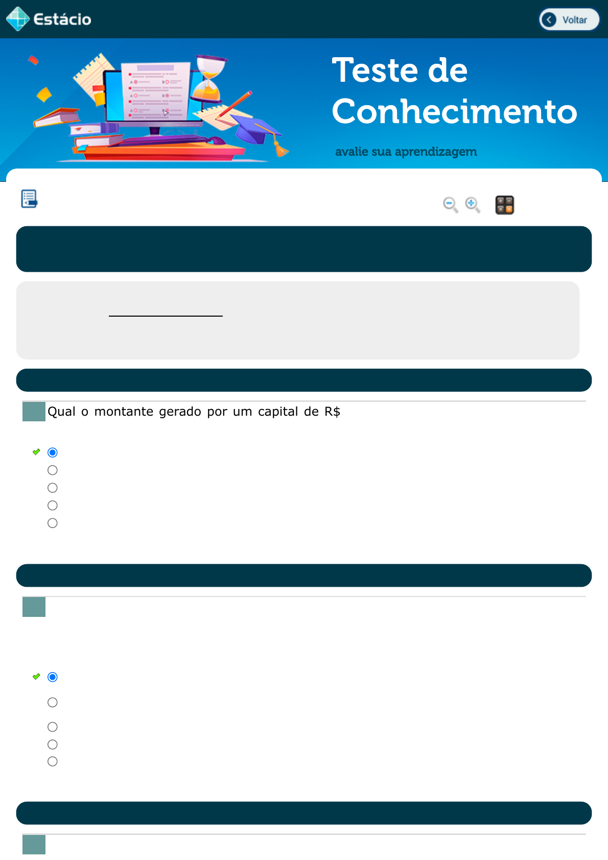Teste de Conhecimento avalie sua aprendizagem Qual o montante gerado por um capital de R$ 1.000,00 aplicado a uma taxa de 1% a.m. por um ano? Um banco ofereceu a seu cliente duas alternativas para descontar uma duplicata com valor de face de R$ 1.000,00, três meses antes de seu vencimento: utilizando desconto comercial simples a uma taxa de 5% a.m. ou utilizando desconto racional composto a uma taxa de 4% a.m. Qual a alternativa mais vantajosa para o cliente? Qual é o valor presente de uma série uniforme finita, imediata e antecipada, com 20 MATEMÁTICA FINANCEIRA Lupa Calc. EGT0080_202007410718_ESM Aluno: TALITA DE OLIVEIRA SOUZA Matr.: 202007410718 Disc.: MATEM. FINANCEIRA 2021.1 EAD (G) / EX Prezado (a) Aluno(a), Você fará agora seu TESTE DE CONHECIMENTO! Lembre-se que este exercício é opcional, mas não valerá ponto para sua avaliação. O mesmo será composto de questões de múltipla escolha. Após responde cada questão, você terá acesso ao gabarito comentado e/ou à explicação da mesma. Aproveite para se familiarizar com este modelo de questões que será usado na sua AV e AVS. INTRODUÇÃO À MATEMÁTICA FINANCEIRA: TAXAS, JUROS E DESCONTOS 1. R$ 1.126,82 R$ 1.115,78 R$ 1.212,56 R$ 1.210,00 R$ 1.010,00 INTRODUÇÃO À MATEMÁTICA FINANCEIRA: TAXAS, JUROS E DESCONTOS 2. O desconto racional composto de 4% a.m. Não é possível comparar as duas alternativas, pois estão em regimes de capitalização diferentes. As duas alternativas são equivalentes. Não é possível comparar as duas alternativas, pois as taxas são diferentes. O desconto comercial simples de 5% a.m SISTEMAS DE AMORTIZAÇÃO 3. javascript:voltar(); javascript:voltar(); javascript:diminui(); javascript:aumenta(); javascript:calculadora_on(); pagamentos mensais de 200 reais a uma taxa de juros de 3% a.m.? Calcule o valor da primeira prestação mensal de um financiamento de 10.000 estruturado no sistema SAC, com prazo de 10 meses, e taxa de juros de 2% a.m. Qual o valor presente líquido de um projeto com investimento inicial de 8.000 reais e que paga 1.000 reais por mês durante 10 meses, dada uma TMA de 1% a.m.? Qual das alternativas é falsa? Um projeto com investimento inicial igual a R$250.000,00, taxa mínima de atratividade igual a 5%a.a., prazo de 2 anos e VPL igual a R$10.000,00 deve: 3.064,76 3.800,00 3.052,20 4.000,00 3.125,48 SISTEMAS DE AMORTIZAÇÃO 4. 1.115,78 1.212,56 1.100,00 1.200,00 1.210,00 AVALIAÇÃO DE PROJETOS ANÁLISE INDIVIDUAL 5. 1.543,12 2.000 1.622,35 1.471,30 3.235,11 AVALIAÇÃO DE PROJETOS ANÁLISE INDIVIDUAL 6. Se o VPL < 0, o projeto deve ser rejeitado. Se a TIR > TMA, o projeto deve ser aceito. Se o payback >TMR, o projeto deve ser aceito. Se a TMA >TIRM, o projeto deve ser rejeitado. Se o TRC > 0, o projeto deve ser aceito. AVALIAÇÃO DE PROJETOS ANÁLISE COMPARATIVA 7. Não ser implantado, pois VPL = TMA. Ser implantado, pois não possui VPL Não ser implantado, pois VPL > 0 Ser implantado, pois VPL > 0 Ser implantado, pois VPL > TIR A TIR incremental de dois projetos mutuamente excludentes foi calculada em 7,8%. Qual das seguintes alternativas apresenta um valor de TMA para o qual o projeto de maior valor deve ser escolhido? Uma determinada empresa analisa os seguintes projetos para seu setor de logística: Terceirização da atividade de transporte de mercadorias até os clientes. Aquisição de dois novos caminhões para entrega de mercadorias Os projetos acima são: O que representa o ponto B no gráfico abaixo? Explicação: Como o enunciado já nos dá o valor do VPL, sendo este maior do que zero, o projeto deve ser implantado, pois é viável. AVALIAÇÃO DE PROJETOS ANÁLISE COMPARATIVA 8. 6% 12% 10% 9% 8% MERCADOS FINANCEIROS 9. Mutuamente Independentes Independentes Dependentes Mutuamente excludentes Mutuamente dependentes Explicação: Caso a empresa decida terceirizar a atividade de transporte de mercadorias até os clientes, ela não precisa adquirir novos caminhões para entrega, uma vez que essa tarefa ficará a cargo da nova empresa contratada. Dessa forma, os dois projetos são mutuamente excludentes. MERCADOS FINANCEIROS 10. O payback simples. A taxa máxima de atratividade. O TMR. A TRC. A TIR. Não Respondida Não Gravada Gravada Exercício inciado em 04/05/2021 15:19:57.