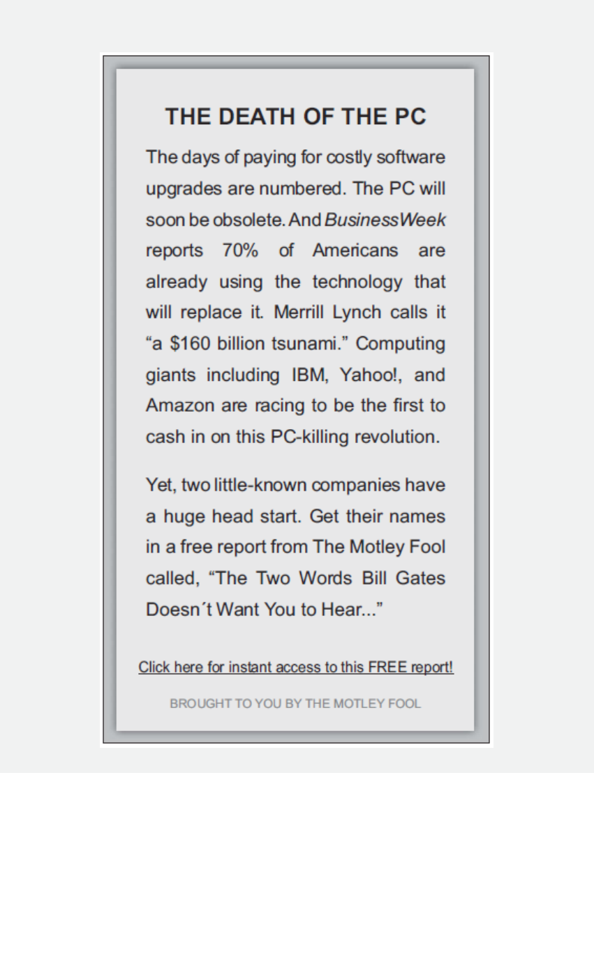 QUESTÃO 91 Disponível em: http://www.fool.com. Acesso em: 21 jul. 2010. Ao optar por ler a reportagem completa sobre o assunto anunciado, tem-se acesso a duas palavras que Bill Gates não quer que o leitor conheça e que se referem 1. aos responsáveis pela divulgação desta informação na internet. 2. às marcas mais importantes de microcomputadores do mercado. 3. aos nomes dos americanos que inventaram a suposta tecnologia. 4. aos sites da internet pelos quais o produto já pode ser conhecido. 5. às empresas que levam vantagem para serem suas concorrentes. Comentário da questão O leitor encontra as duas palavras que se referem às duas empresas até então pouco conhecidas. Sabemos que as duas palavras se referem aos nomes das empresas pelo pronome their na frase: “Get their names in a free report from The Motley Fool”. Equipe Descomplica A melhor equipe de professores do Brasil ;) Gabarito da questão Opção E