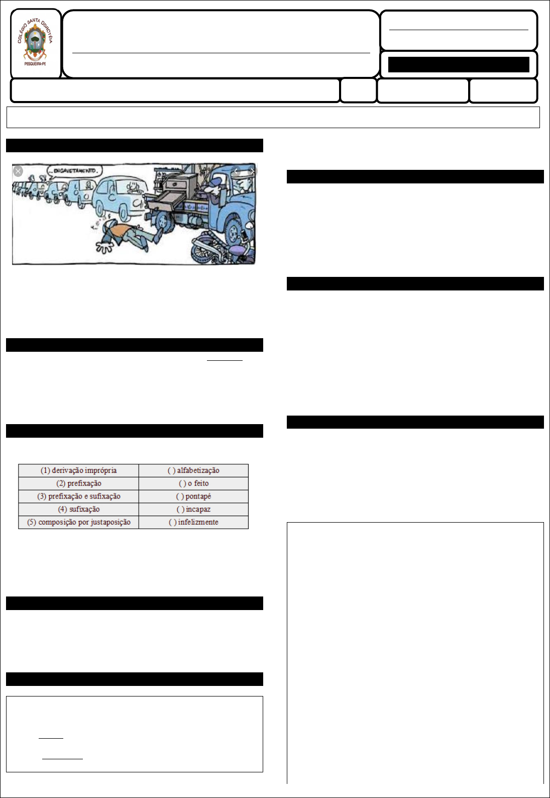 CONTEÚDOS TRABALHADOS: Morfologia: estrutura e formação de palavras; Interpretação de texto; transitividade verbal. (1) (CSD/2019) – PORTUGUÊS Lea: O termo “engavetamento” presente na charge acima tem sua formação pelo processo de: (A) Derivação regressiva. (B) Derivação parassintética. (C) Derivação impropria. (D) Derivação Pré e Sufixal. (2) (CSD/2019) – PORTUGUÊS O mesmo processo de formação da palavra "feminismo” é observado em: (A) Envelhecer (B) Envergonhados (C) Desapontado (D) Cruelmente (3) (CSD/2019) – PORTUGUÊS Considerando o processo de formação de palavras, relacione a coluna da direita com a da esquerda: A sequência correta é (A) 2, 4, 3, 1, 5 (B) 4, 1, 5, 3, 2 (C) 2, 4, 3, 5, 1 (D) 4, 1, 5, 2, 3 (4) (CSD/2019) – PORTUGUÊS As palavras couve-flor, planalto e aguardente são formadas por: (A) Derivação (B) Onomatopeia (C) Hibridismo (D) Composição (5) (CSD/2019) – PORTUGUÊS Analise as afirmações a seguir e assinale a alternativa correta. (I) A derivação imprópria ocorre quando uma palavra, pertencente a uma determinada classe, é utilizada como se fosse de outra classe gramatical. (II) O coelho verde saiu correndo. - apresenta uma derivação imprópria. (III) O amanhecer de ontem foi magnífico. - apresenta uma derivação imprópria. (A) Apenas I é correta. (B) Apenas II é correta. (C) Apenas I e II estão corretas. (D) Apenas I e III estão corretas. (6) (CSD/2019) – PORTUGUÊS O emprego do acento grave em “Às vezes, aparecem nos rostos sorrisos de confiança”, justifica-se pela mesma razão do que ocorre no seguinte exemplo: (A) Entregou o documento às meninas. (B) Manteve-se sempre fiel às suas convicções. (C) Saiu, às pressas, mas não reclamou. (D) Às experiências, dedicou sua vida. (7) (CSD/2019) – PORTUGUÊS Em “E quando estendeu a mão àquela que tanto amara”, há uma ocorrência de crase sobre a qual faz-se o seguinte comentário corretamente: (A) Trata-se de um caso facultativo em função do pronome demonstrativo. (B) Não deveria ocorrer em função da falta da preposição “a” explícita. (C) O acento grave deveria ser deslocado para o “a” que precede o termo “mão”. (D) Ocorre devido à regência do verbo estender e sua relação com o termo regido. (8) (CSD/2019) – PORTUGUÊS Assinale a alternativa em que o sinal indicativo da crase está corretamente empregado. (A) Eu gosto de estudar à noite. (B) Agradeci à todos o apoio. (C) O curso é de 2 à 7 de maio. (D) Ele teve acesso à informações privilegiadas. Leia o texto abaixo para responder às questões 9 e 10. QUESTÃO DE IGUALDADE De Barack Obama a Woody Allen, passando pelo “black bloc”, todo mundo resolveu imprecar contra a desigualdade. Há um interessante debate econômico sobre as repercussões sociais de diferenças crescentes entre a renda dos mais pobres e a dos mais ricos. Para os teóricos mais à direita, a disparidade não chega a ser um problema. Desde que não haja miséria e os mais pobres tenham assegurada uma existência digna, a desigualdade funciona até como um motor da economia. É para comprar um carrão melhor do que o do vizinho que o sujeito se dispõe a trabalhar mais. Economistas mais à esquerda, entretanto, afirmam que, quando a diferença entre a maior e a menor remuneração cresce demais, a mobilidade social fica emperrada, o que gera uma série de problemas. Sistemas que beneficiam apenas uma elite, além de fracassarem em seu compromisso democrático, carregam as sementes de sua própria destruição. Nessa discussão, sou agnóstico e penso até que os dois lados podem estar certos. Mas há uma questão anterior, como coloca o filósofo Stephen Asma em “Against Fairness”. Para Asma, nós, seres humanos, estamos biologicamente programados para favorecer os próximos. O amor é discriminatório, diz. Se mães não protegessem suas crias, CONGREGAÇÃO DE SANTA DOROTÉIA DO BRASIL COLÉGIO SANTA DOROTÉIA – PESQUEIRA – PE Educar, um gesto de amor que fica para sempre! REVISÃO DE PORTUGUÊS – 2020 PROFESSOR KARL MIRKO REVISIONAL 1ª SÉRIE - MÉDIO NOME: NOTA DATA: N° mamíferos e aves seriam inviáveis. Esse pendor simplesmente não combina com as exigências republicanas que nos impomos, ocasionando paradoxos. Acertadamente, condenamos o juiz que contrata parentes para seu gabinete, mas também recriminamos o empresário de sucesso que deixa de empregar seu irmão necessitado. Uma igualdade estrita exigiria que eu dê a meu filho o mesmo valor que atribuo ao filho de um desconhecido e que dispense ao mendigo o tratamento que concedo a um amigo. Para Asma, éticas consequencialistas, centradas na igualdade, têm algo de profundamente desumano. (Helio Schwartsman. Folha de S.Paulo. 11.08.2013. Adaptado). (9) (CSD/2019) – PORTUGUÊS De acordo com o texto, (A) Os governantes estão empenhados em evitar as repercussões sociais negativas provocadas pelo debate sobre a desigualdade social. (B) Para os economistas, teóricos com postura política de esquerda são responsáveis pelo recente debate em torno da desigualdade. (C) A crescente discussão sobre a má distribuição de riquezas contribuiu para o surgimento de medidas concretas a fim de corrigir a desigualdade. (D) As consequências sociais da crescente diferença entre a renda dos mais ricos e a dos mais pobres têm sido intensamente discutidas. (10) (CSD/2019) – PORTUGUÊS – SEMESTRE 2 – B3 Segundo a opinião do autor, o fato de condenarmos o juiz que contrata parentes para seu gabinete, mas recriminarmos o empresário que deixa de empregar seu irmão necessitado se revela como uma (A) Coerência. (B) Virtude. (C) Indecisão. (D) Contradição Leia para responder às questões de 11 até 14. POR QUE ESTUDAR A CULTURA INDÍGENA E AFRO- BRASILEIRA? Os currículos escolares, tradicionalmente, sempre trabalham a História Geral e a História do Brasil, a partir de uma postura eurocêntrica, tendendo a olhar 
