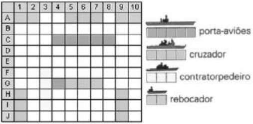Escola General Joaquim Inácio- Ensino Fundamental e Médio Atividade 1. Você está jogando batalha naval e seus navios estão colocados na sua folha de acordo com a seguinte disposição: Embarcações (navios) disponíveis: 2 Rebocadores , 3 contratorpedeiros 1 Cruzador 1 Porta-aviões Vamos combinar que o número deve ser o primeiro elemento do par(abscissa), e a letra deve ser o segundo elemento(ordenada). Nessas condições, responda: a) Quais as posições ocupadas pelo seu porta-aviões? b) Se o seu adversário disparar um “ponto” para a posição (6,E), atingirá algum de seus navios? c) Se o seu adversário disparar um “ponto” para a posição (7,G), atingirá algum de seus navios? d) Em quais pontos seu adversário deve atirar para afundar todos os seus rebocadores? e) O seu cruzador será afundado se o seu adversário disparar 4 “pontos” para quais posições? f) Se o seu adversário der 20 “tiros” seguidos e todos certeiros, ele conseguirá afundar toda a sua frota?